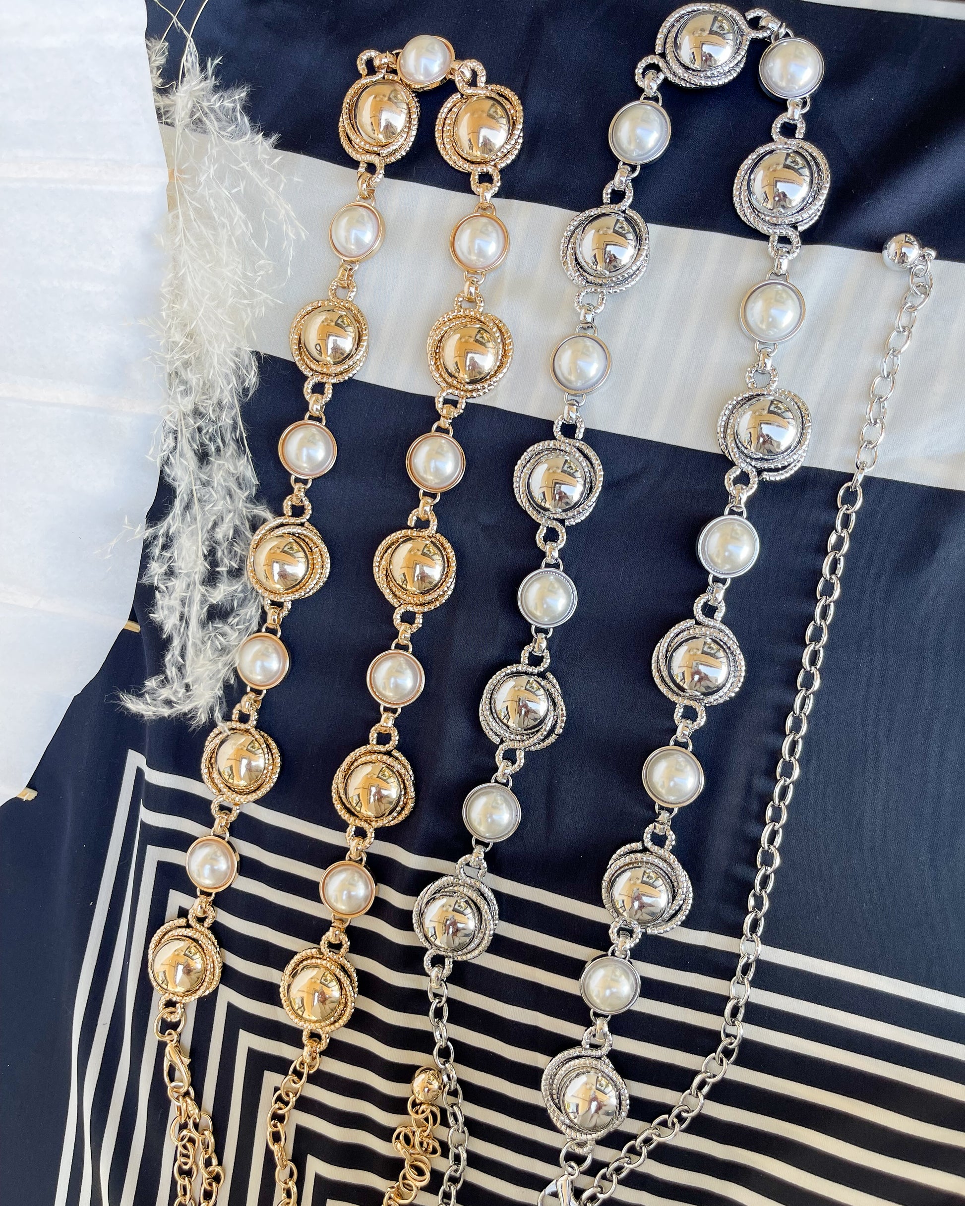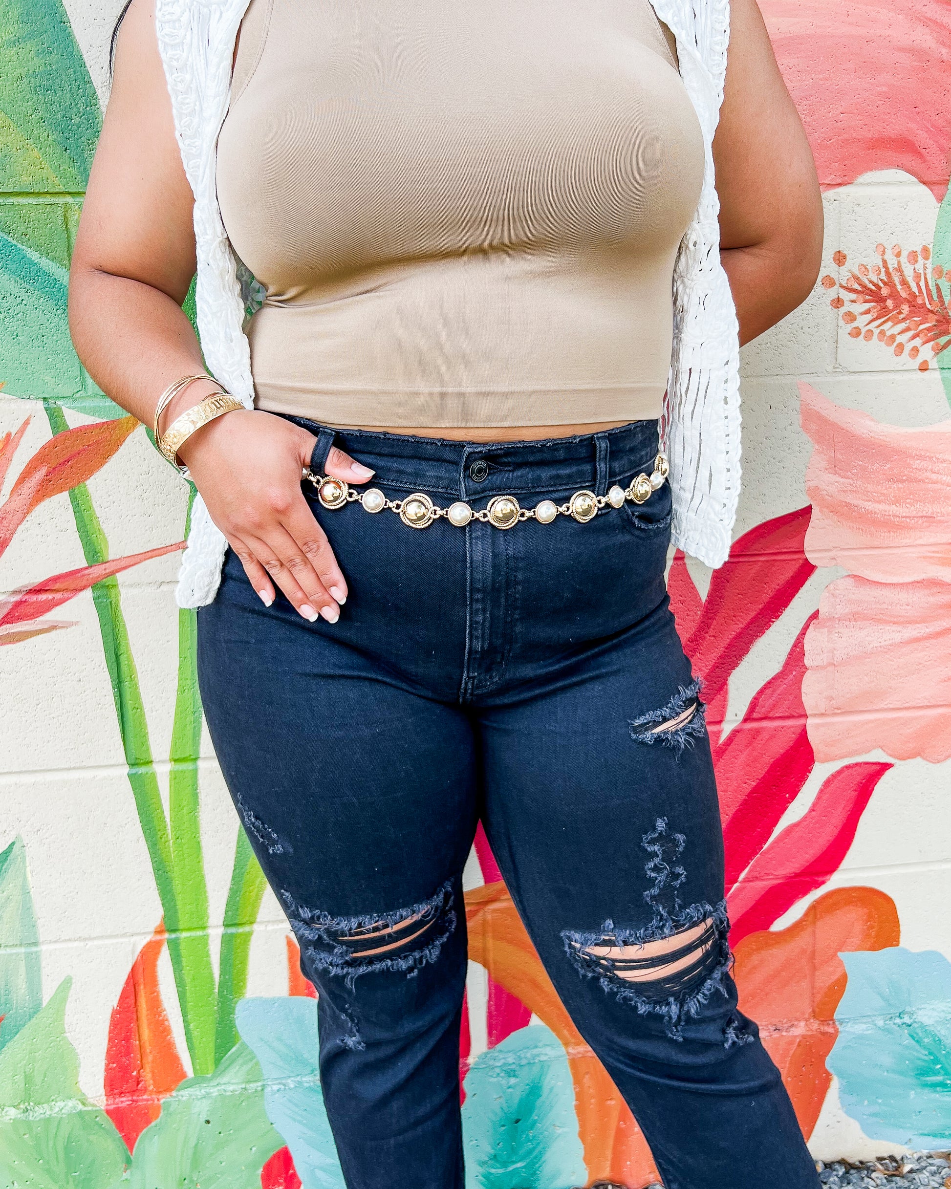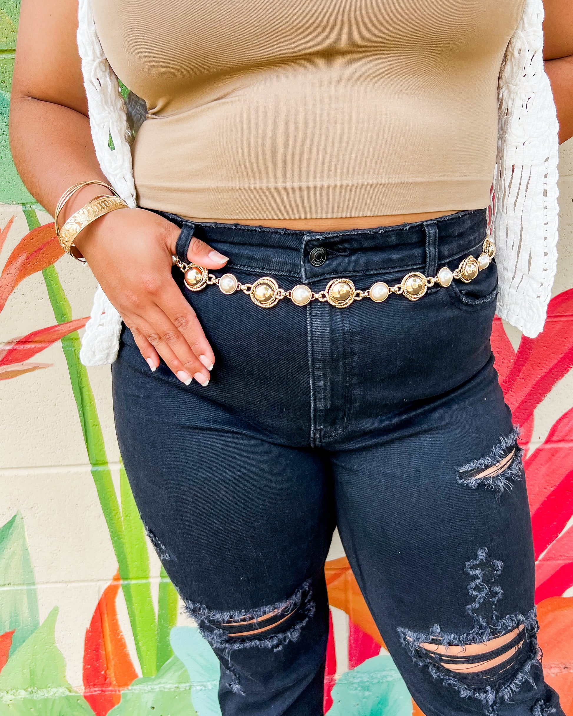 Add something fun to your next outfit with our new Let's Go Girls Belt! Gold & silver plated featuring the prettiest pearls, a nice neutral that will be sure to match whatever look you're going for. Adjustable.