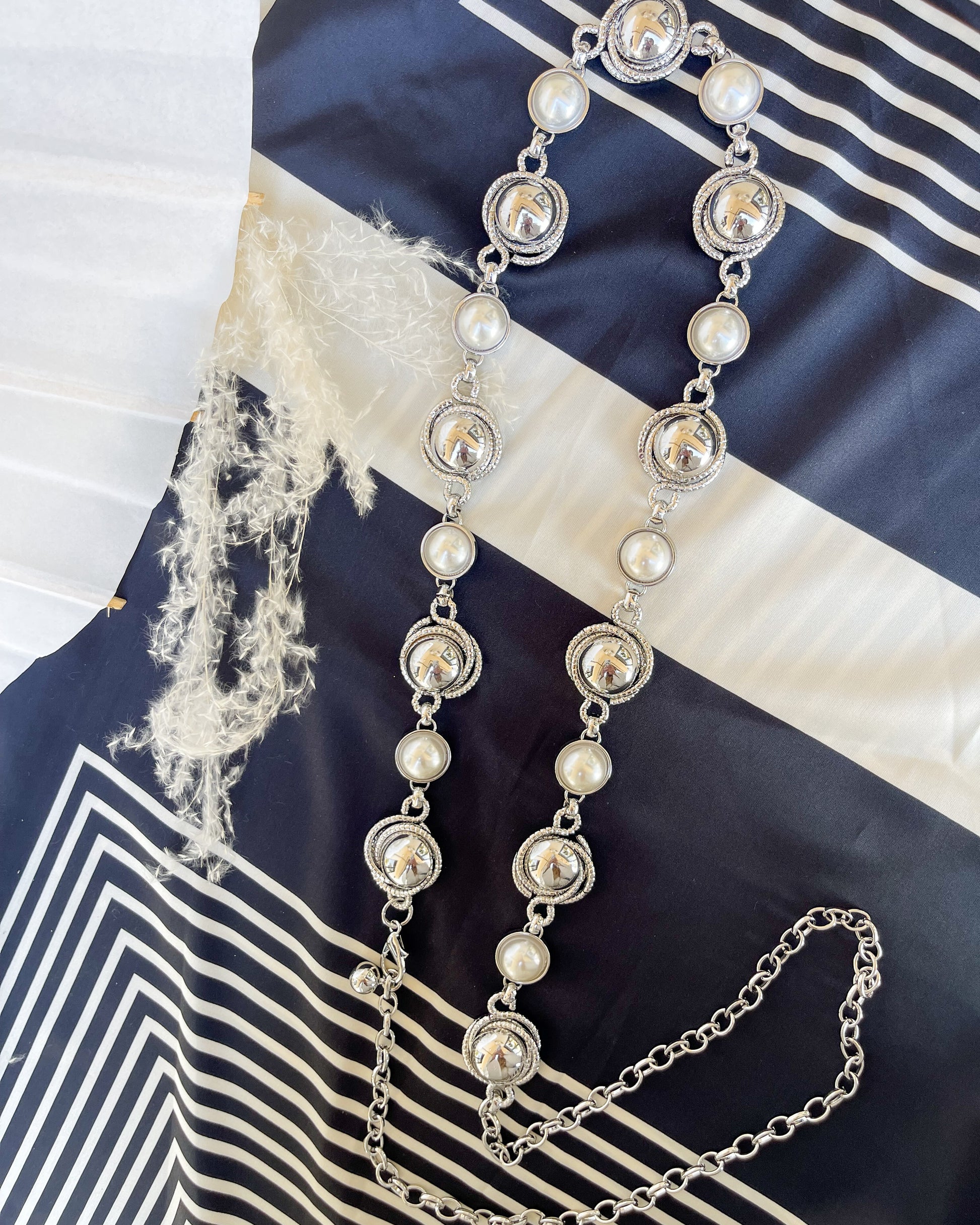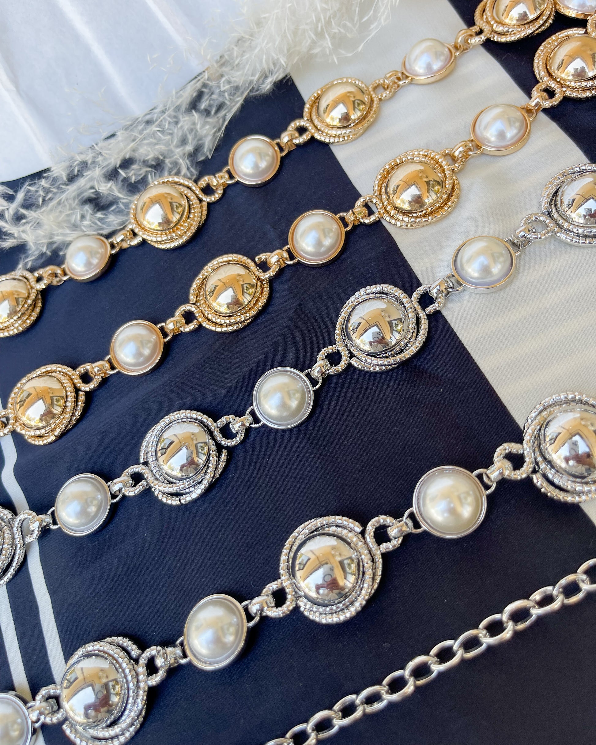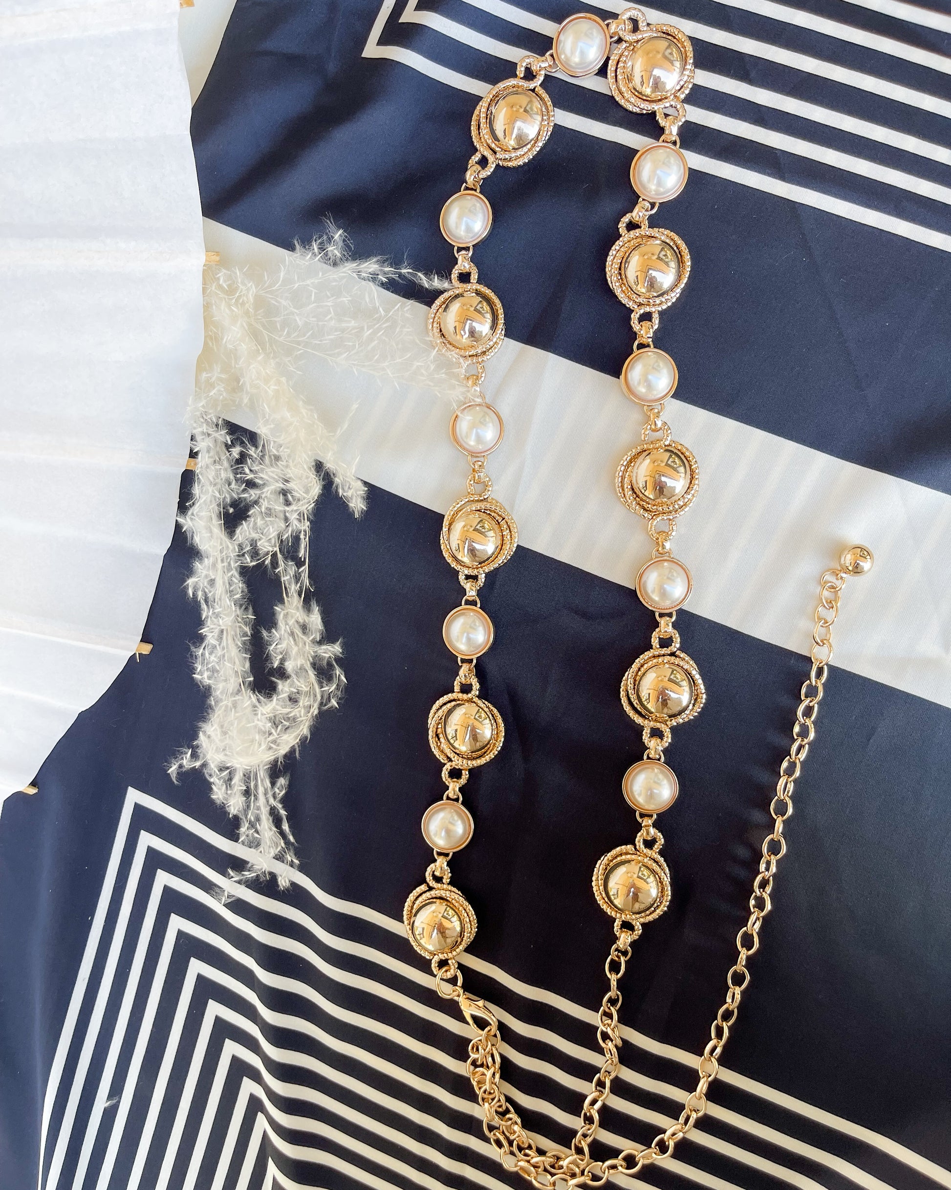 Add something fun to your next outfit with our new Let's Go Girls Belt! Gold & silver plated featuring the prettiest pearls, a nice neutral that will be sure to match whatever look you're going for. Adjustable.