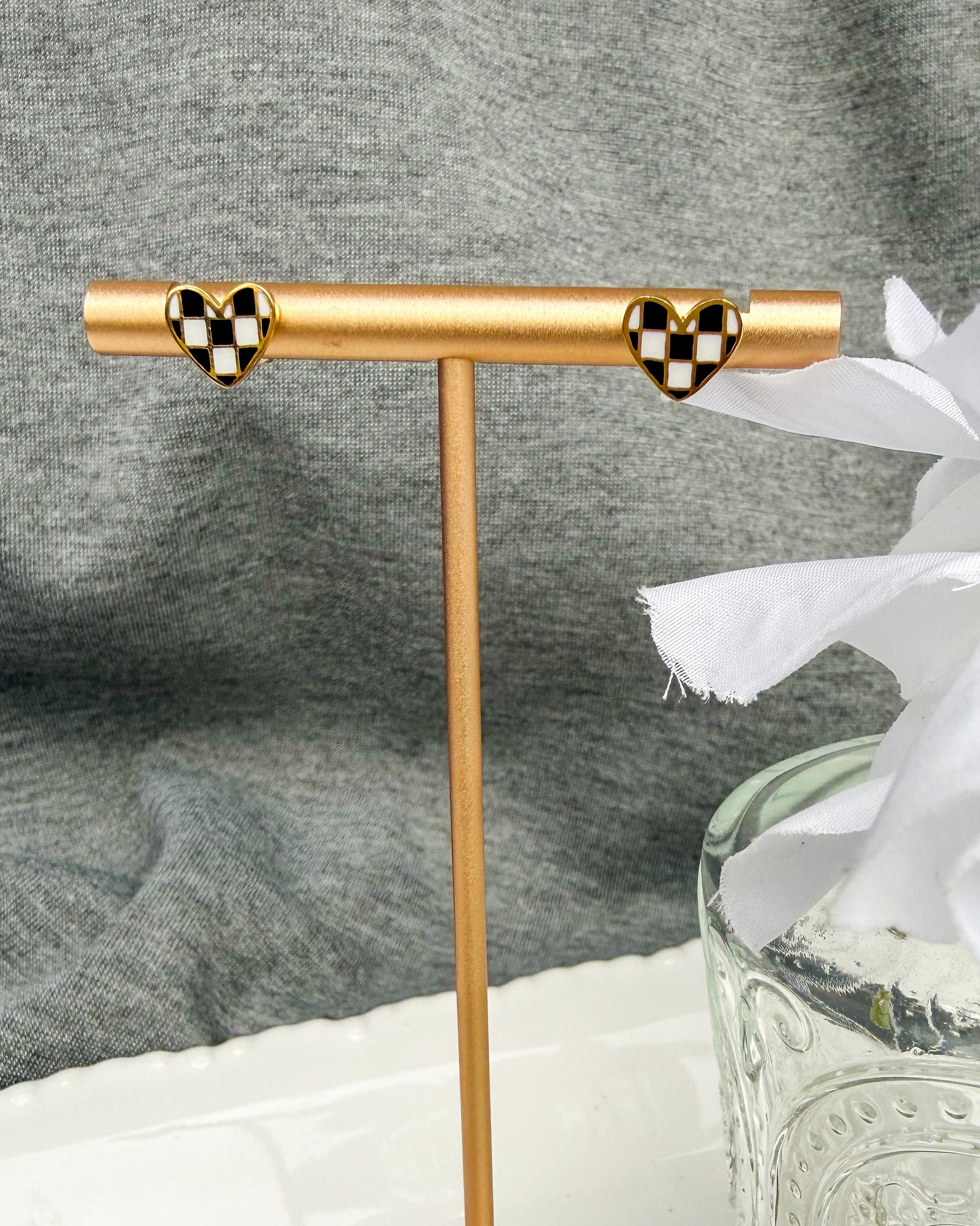 Black & white checkered mini heart studs. Gold plated.