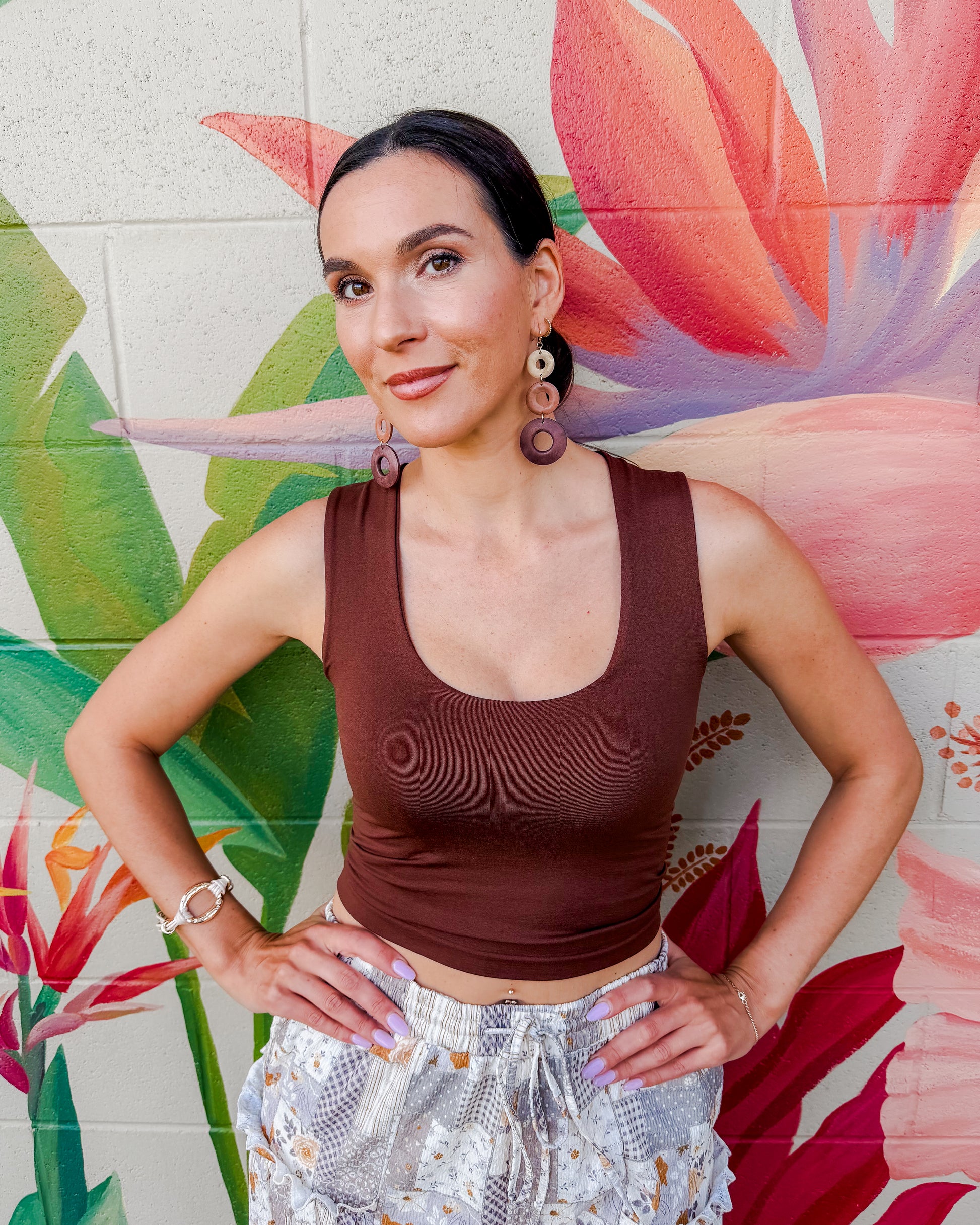 The Mackey Tank in Brown combines comfort and convenience with its seamless construction and built-in bra support. The cropped silhouette and u-neckline create a flattering, modern look perfect for workouts, layering, or casual wear. Soft, stretchy fabric moves with you throughout your day.