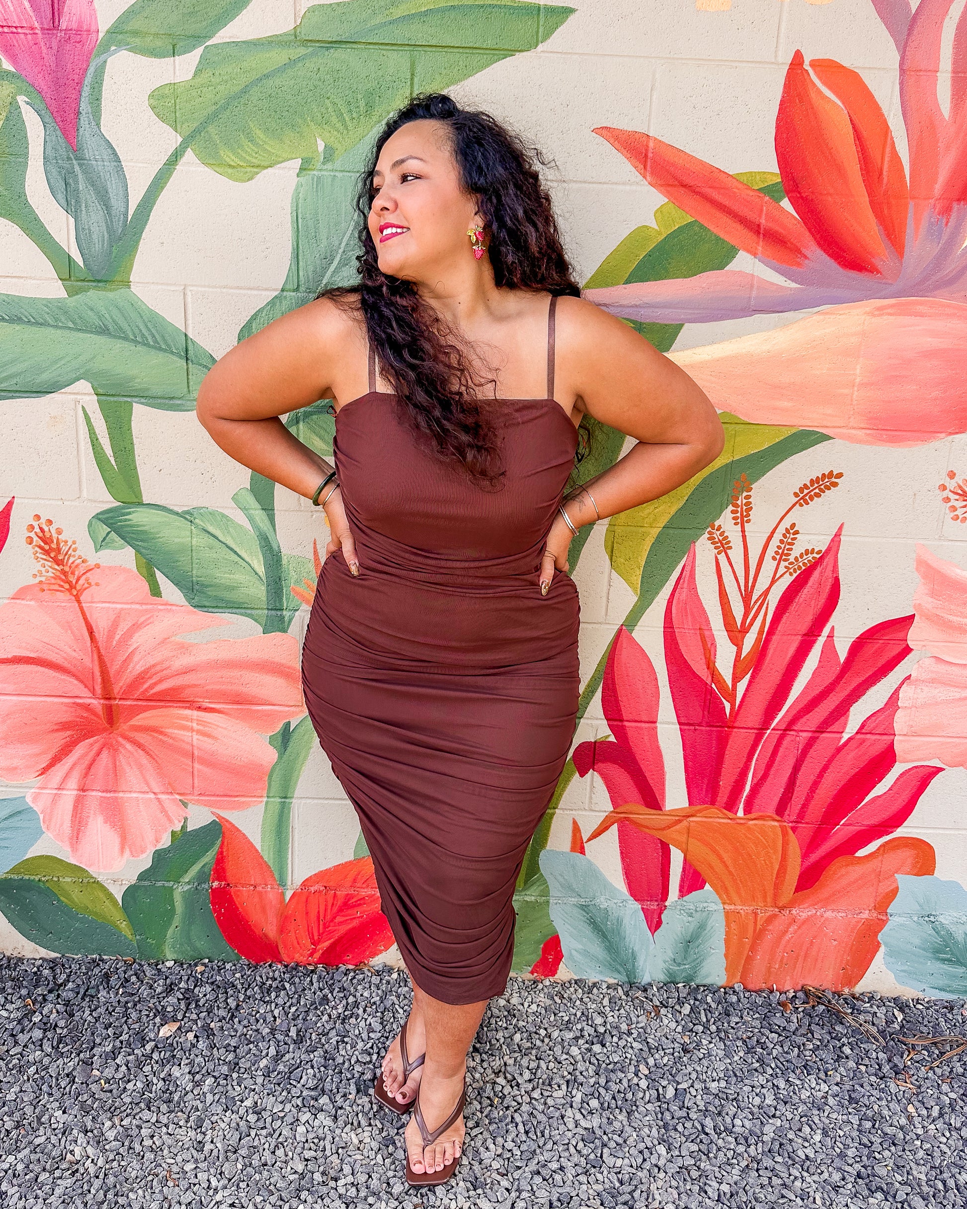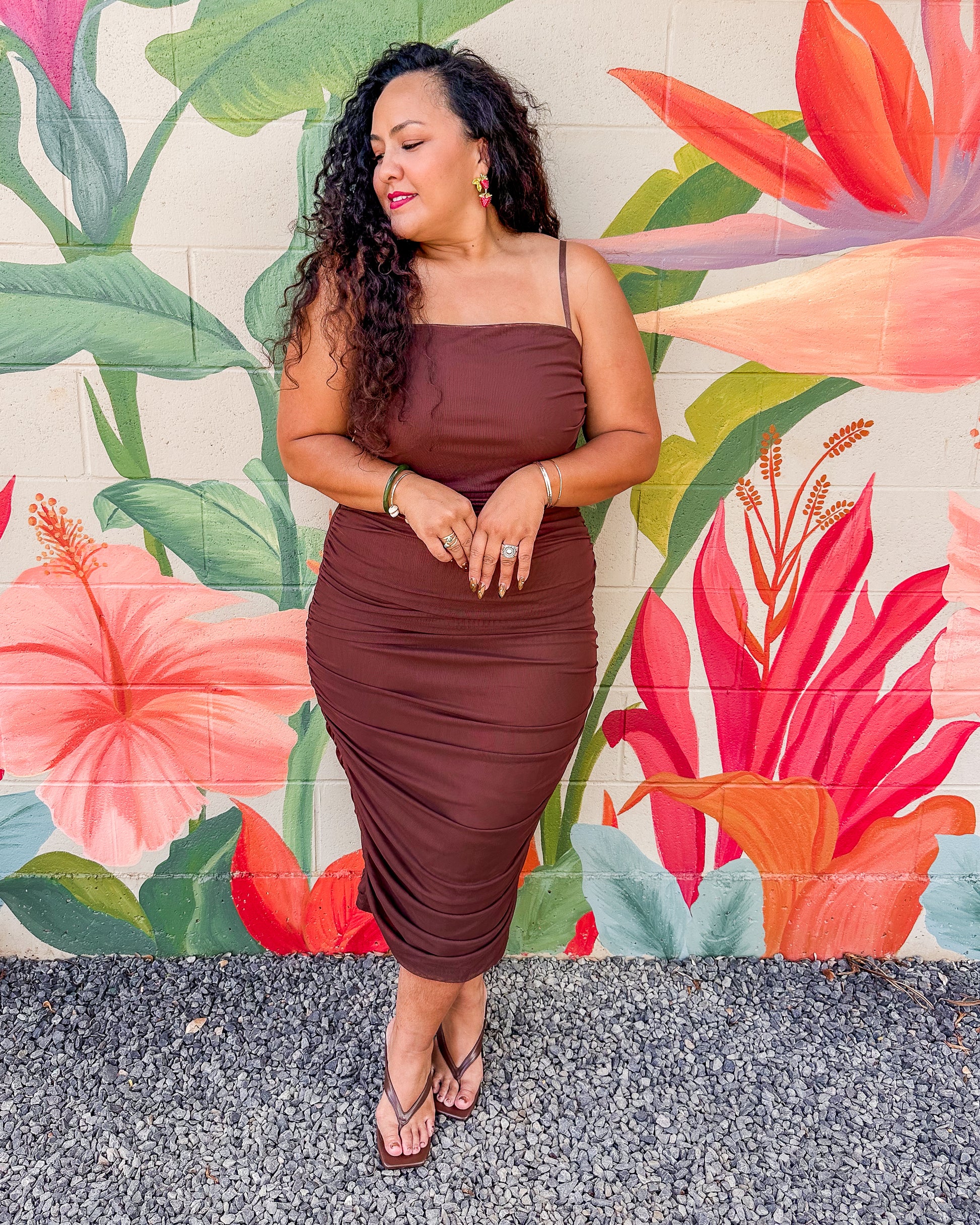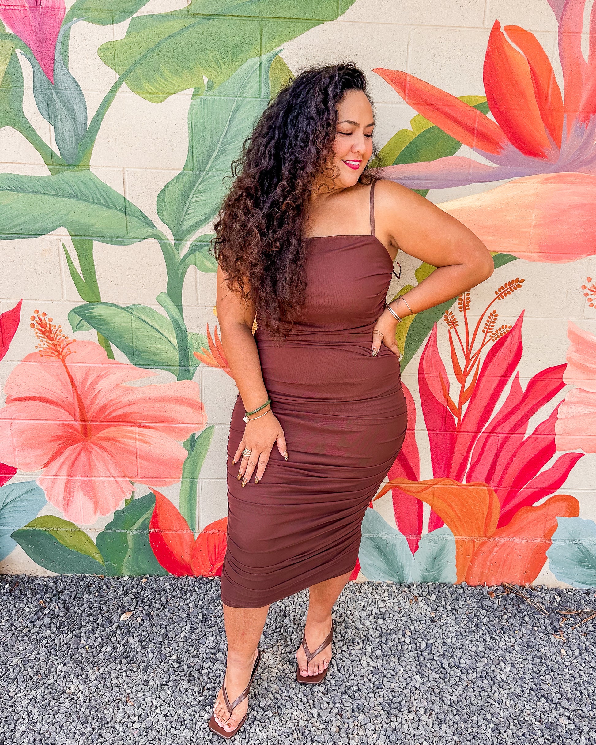 The Marnie Dress in Mocha features a solid color mesh fabric that is both lined and stretchy, ensuring comfortable wear throughout the day. Its midi length and delicate ruching along the sides create a flattering silhouette, combining effortless style with subtle elegance. Ideal for various occasions, this dress balances comfort and sophistication with ease.