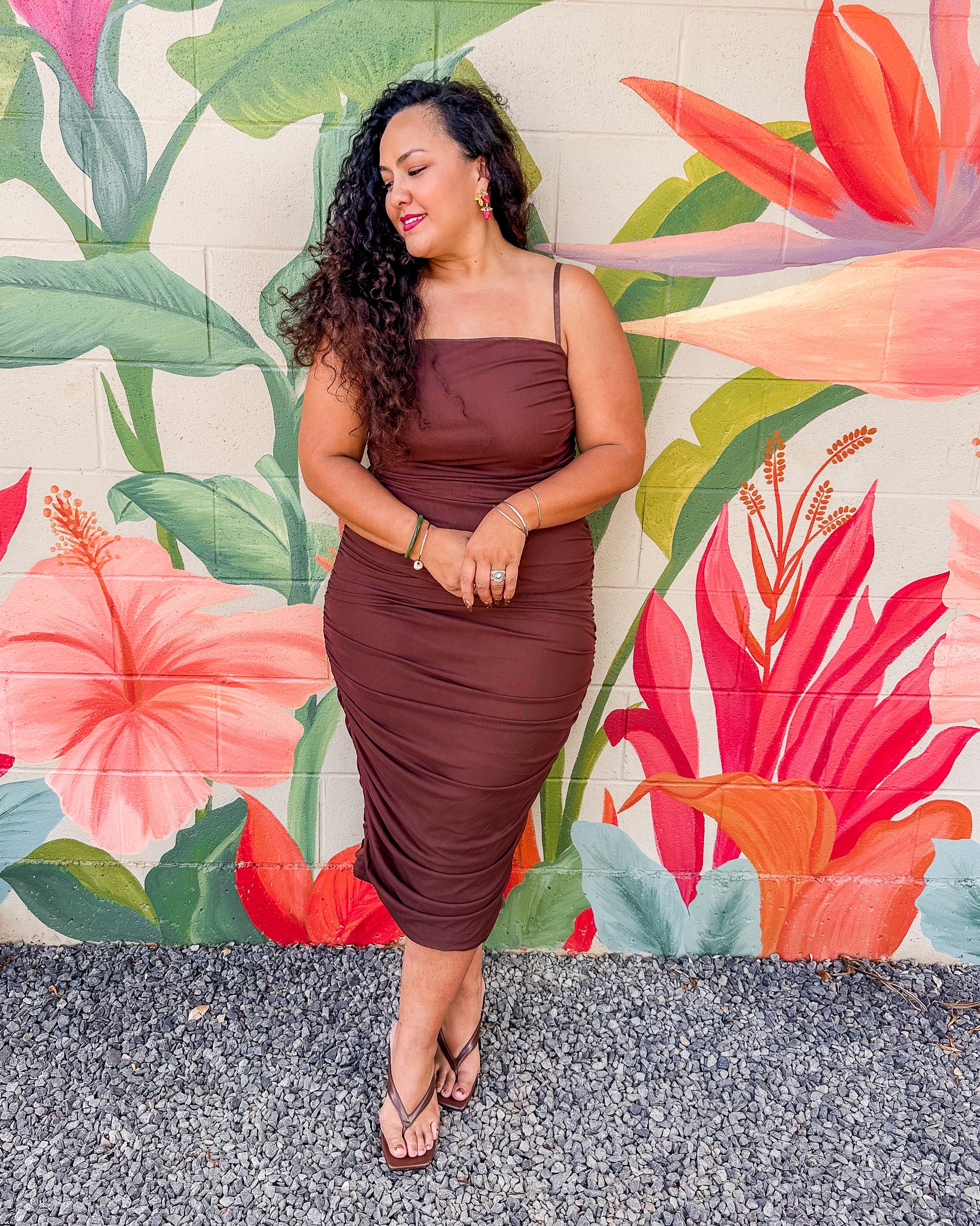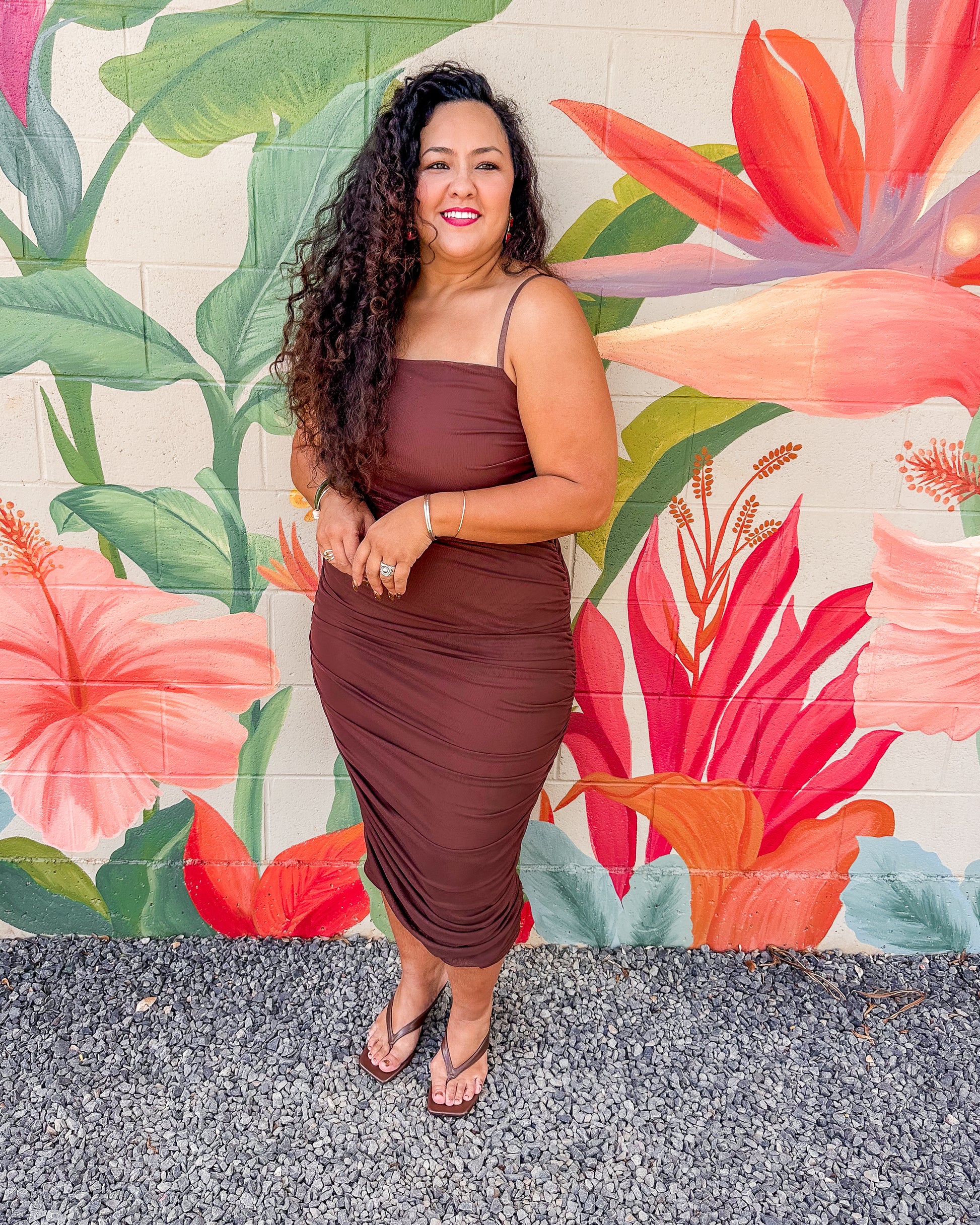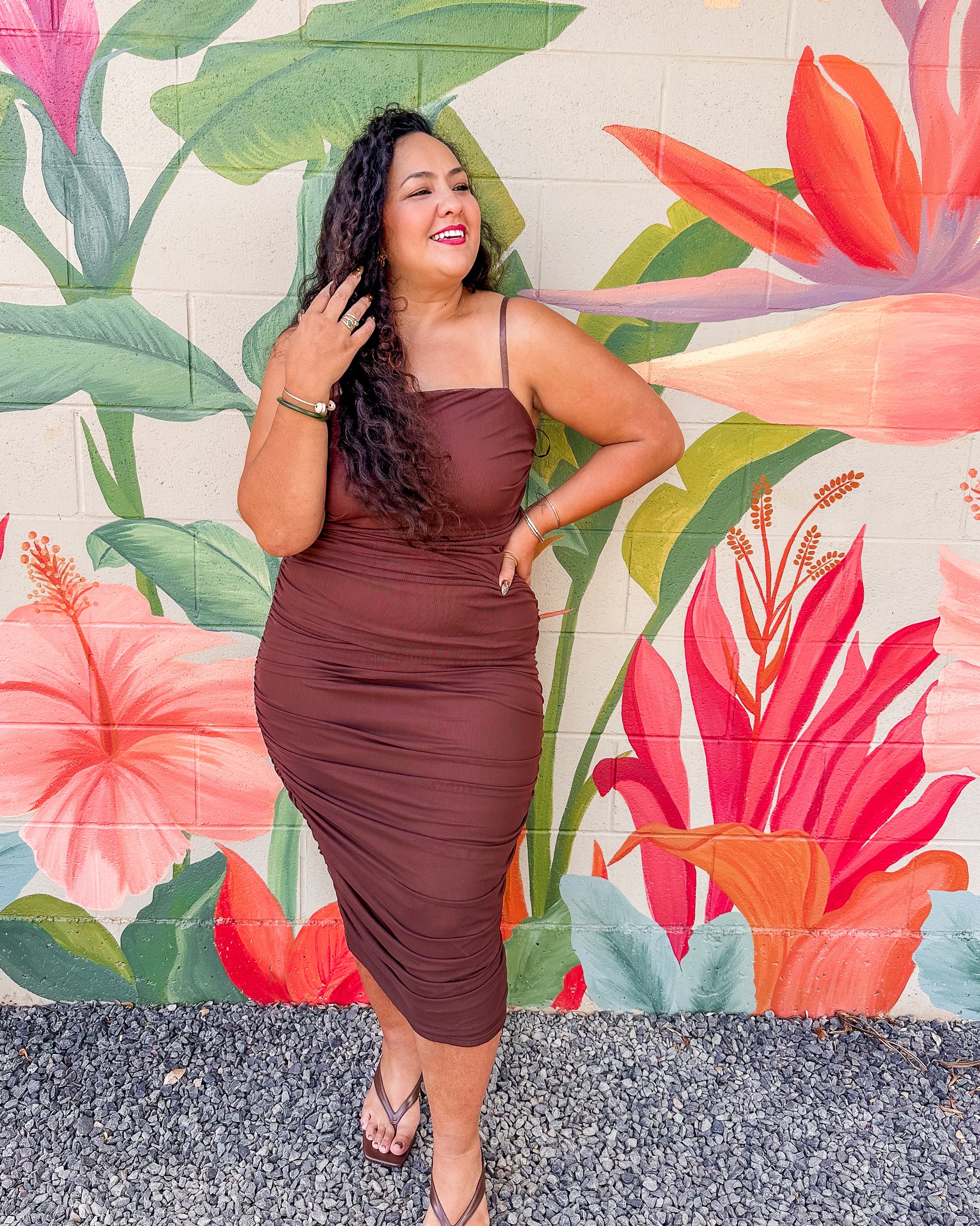 The Marnie Dress in Mocha features a solid color mesh fabric that is both lined and stretchy, ensuring comfortable wear throughout the day. Its midi length and delicate ruching along the sides create a flattering silhouette, combining effortless style with subtle elegance. Ideal for various occasions, this dress balances comfort and sophistication with ease.