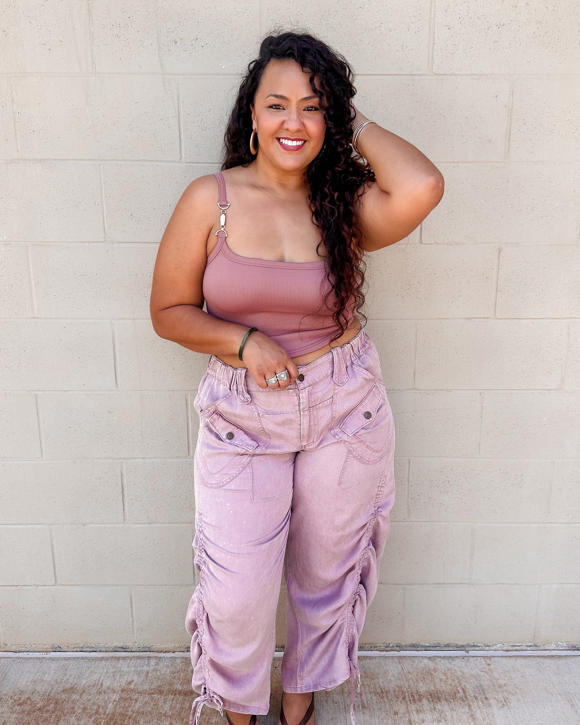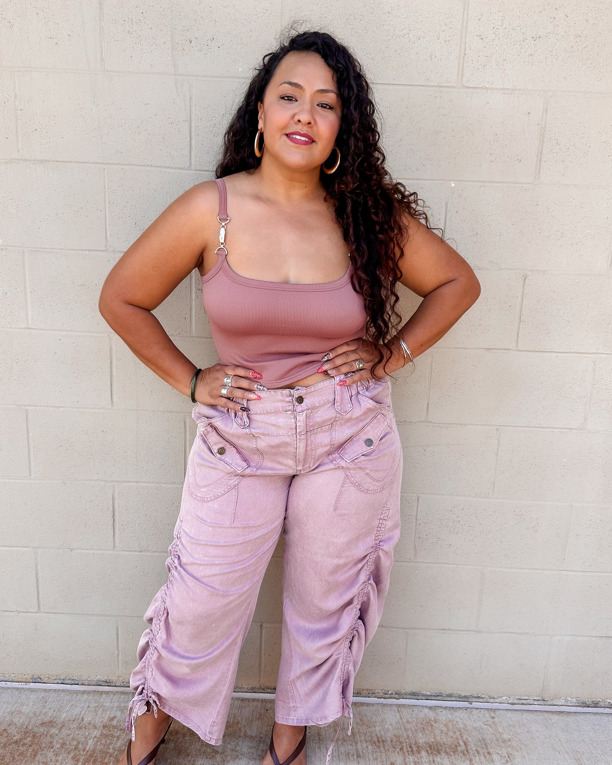 These washed mauve cargo pants offer a relaxed yet stylish look, featuring practical side pockets and delicate ruching details. Made from breathable Tencel fabric, these capri-length pants provide comfort and breathability for everyday wear. Perfect for a calm, casual vibe with a touch of thoughtful design.