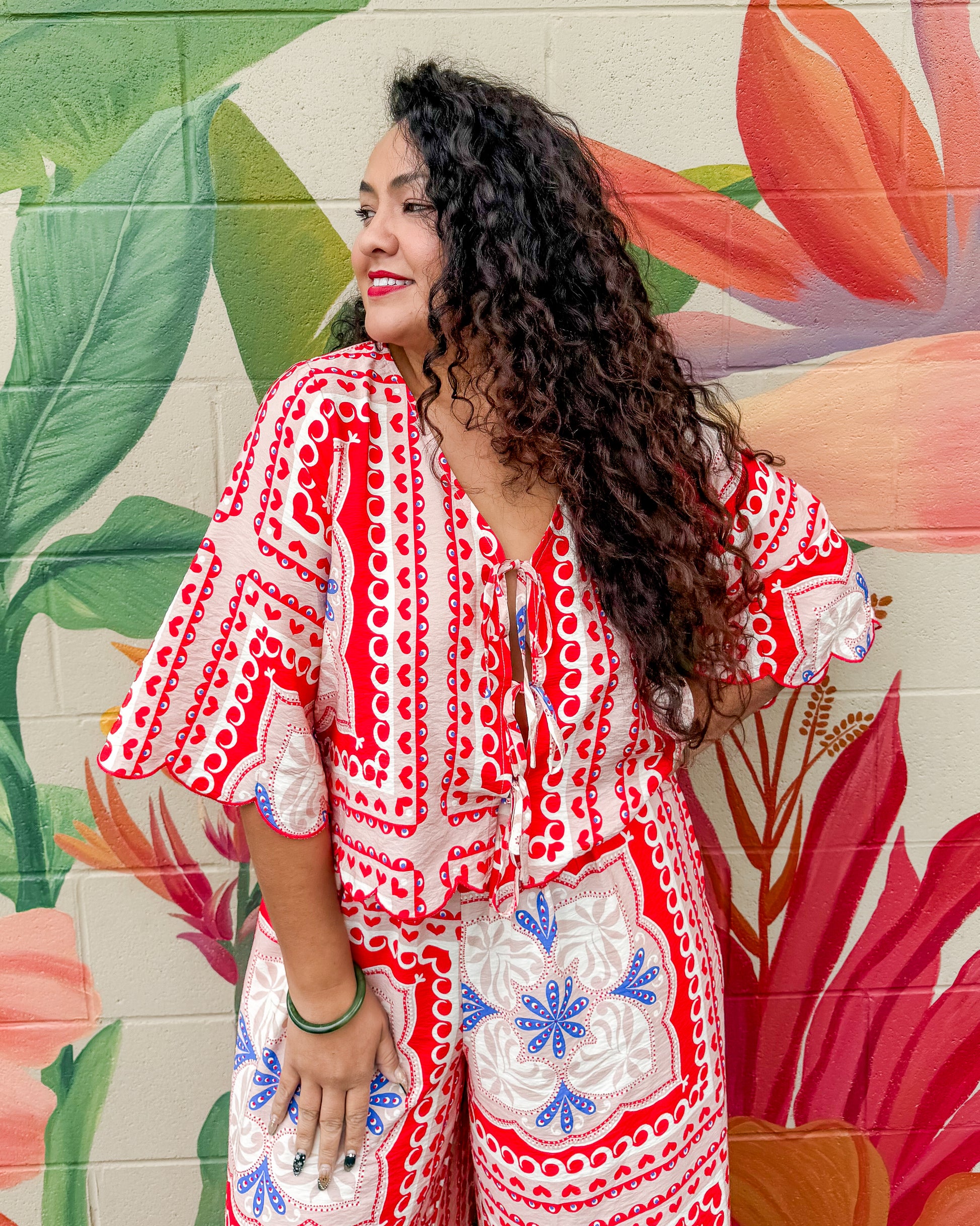 The Mesilla Blouse features a relaxed fit with a charming front tie closure that lets you adjust the silhouette to your liking. Billowed sleeves add movement and ease, while the scalloped hem detail brings a touch of feminine flair. Perfect for casual days or dressing up with your favorite bottoms.