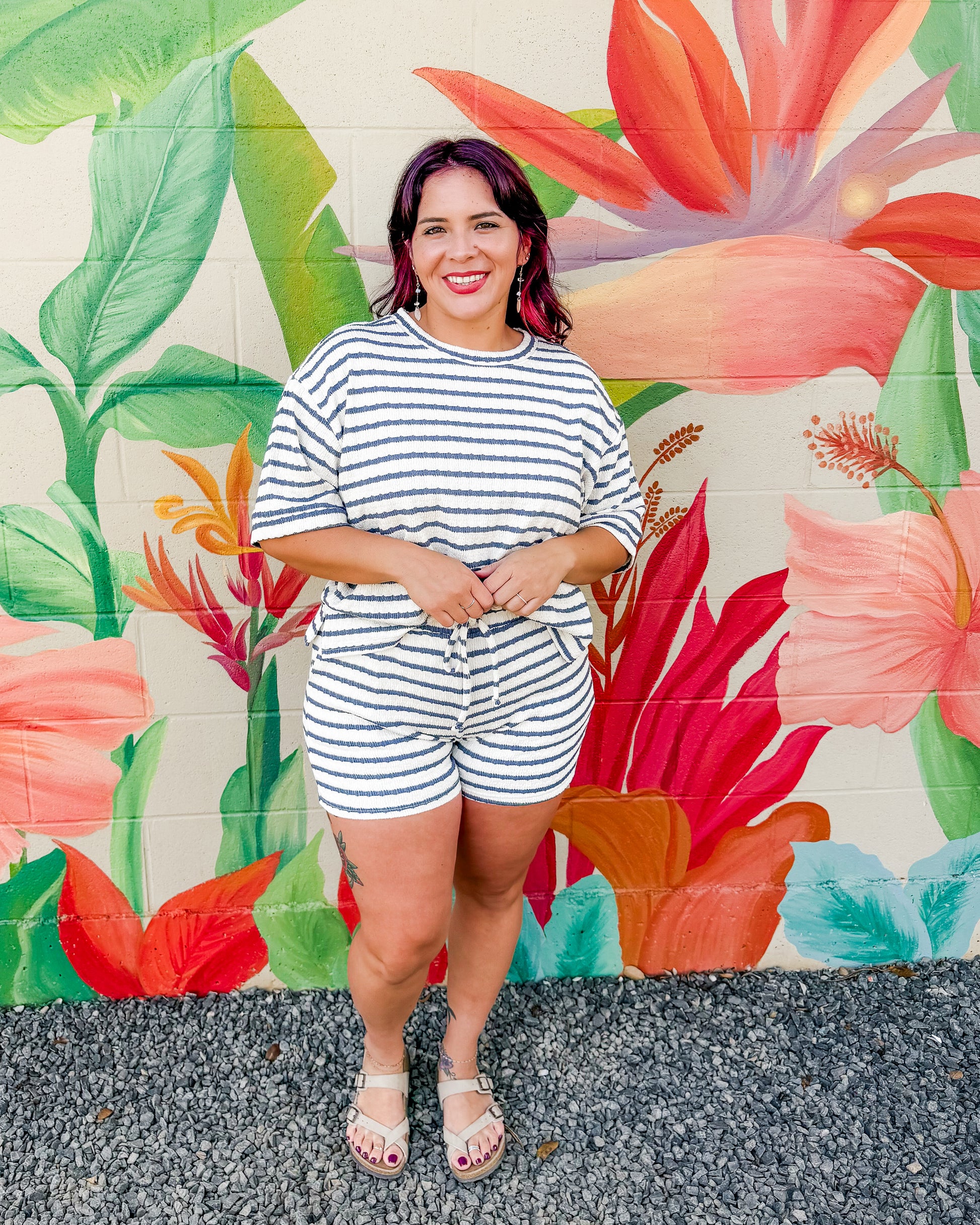 Mikelle Shorts feature a textured striped design with practical side pockets and an adjustable drawstring waist for a custom fit. Perfect for casual days when comfort meets style.