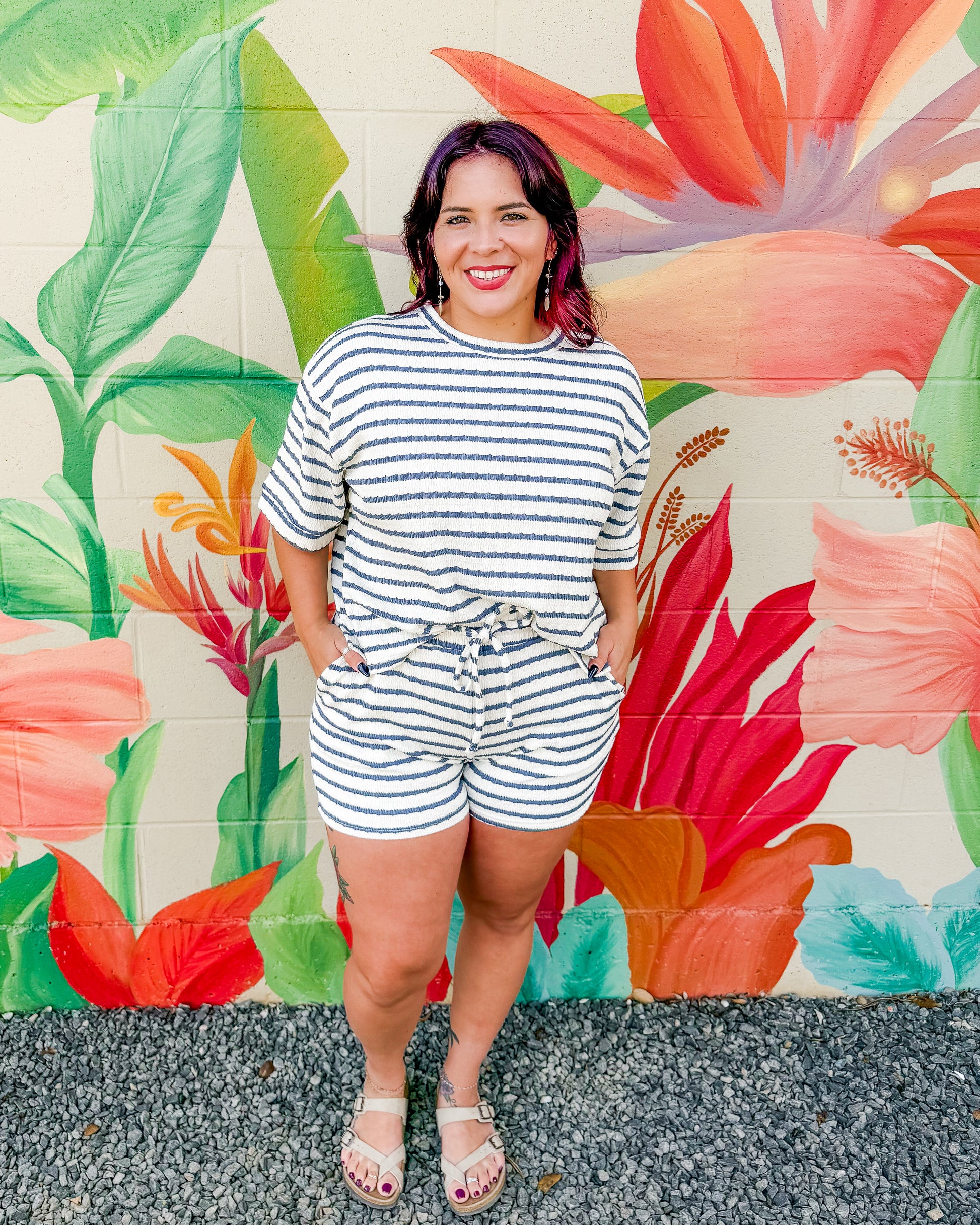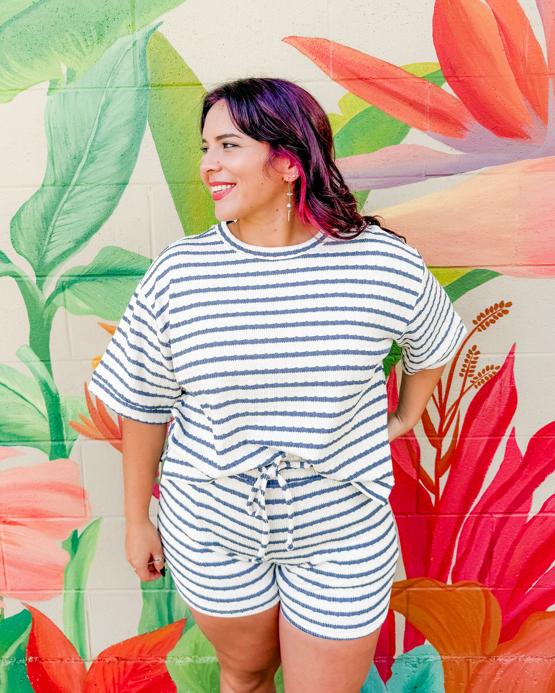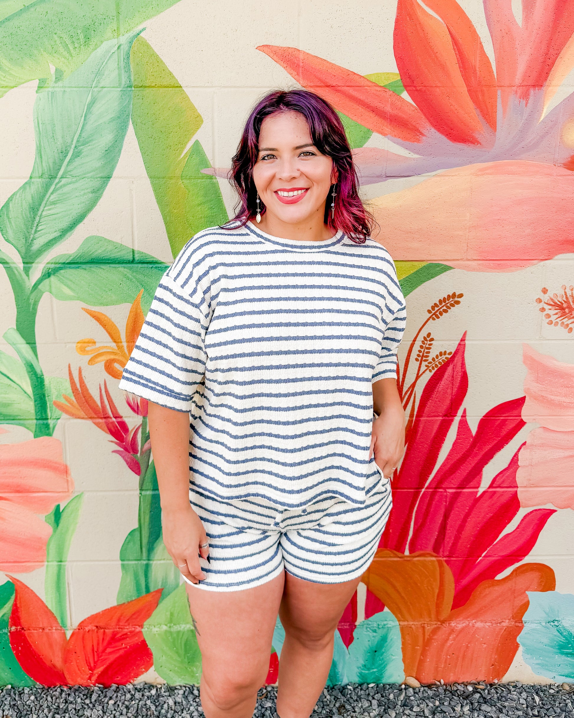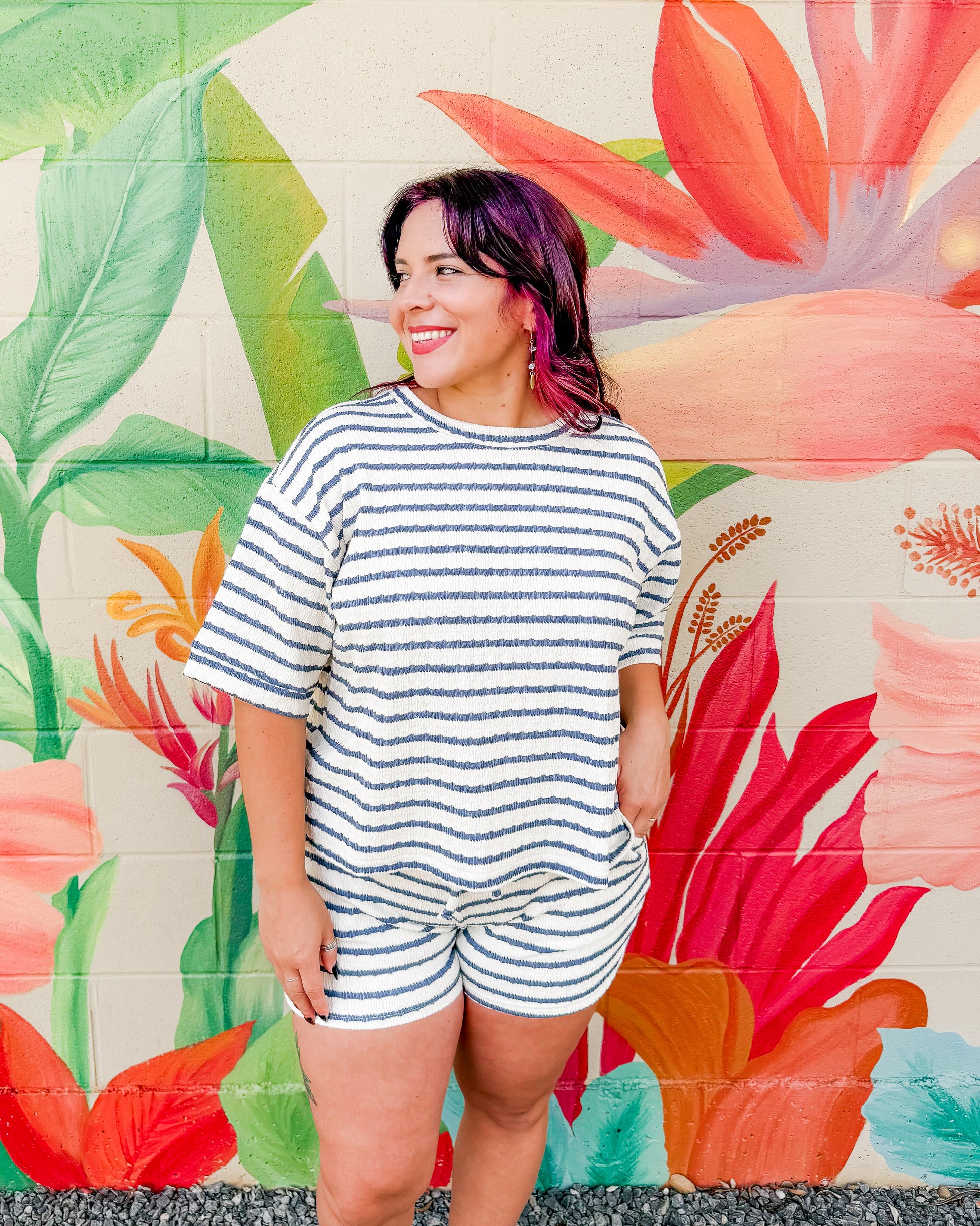 The Mikelle Top features a relaxed boxy fit with textured striped detailing across the front. This short sleeve style offers an effortless, laid-back vibe perfect for casual everyday wear. The structured fabric drapes beautifully while maintaining its shape, making it a versatile staple for any wardrobe.