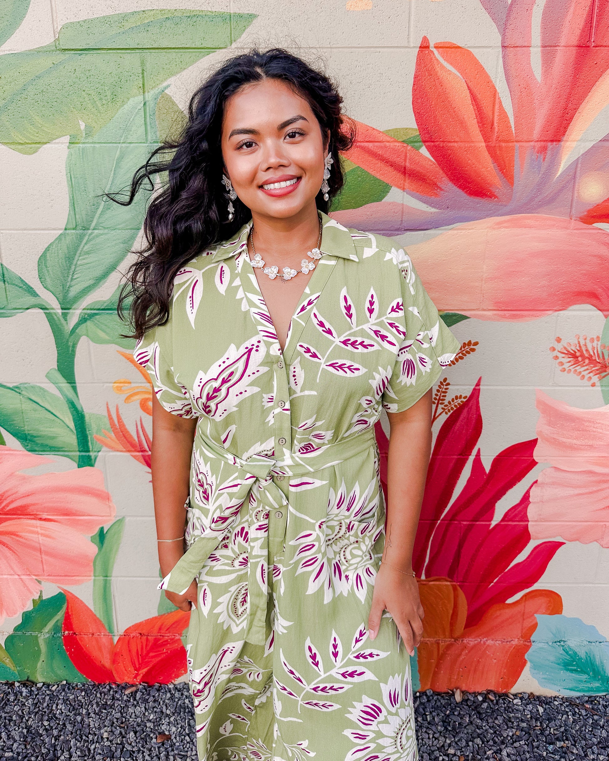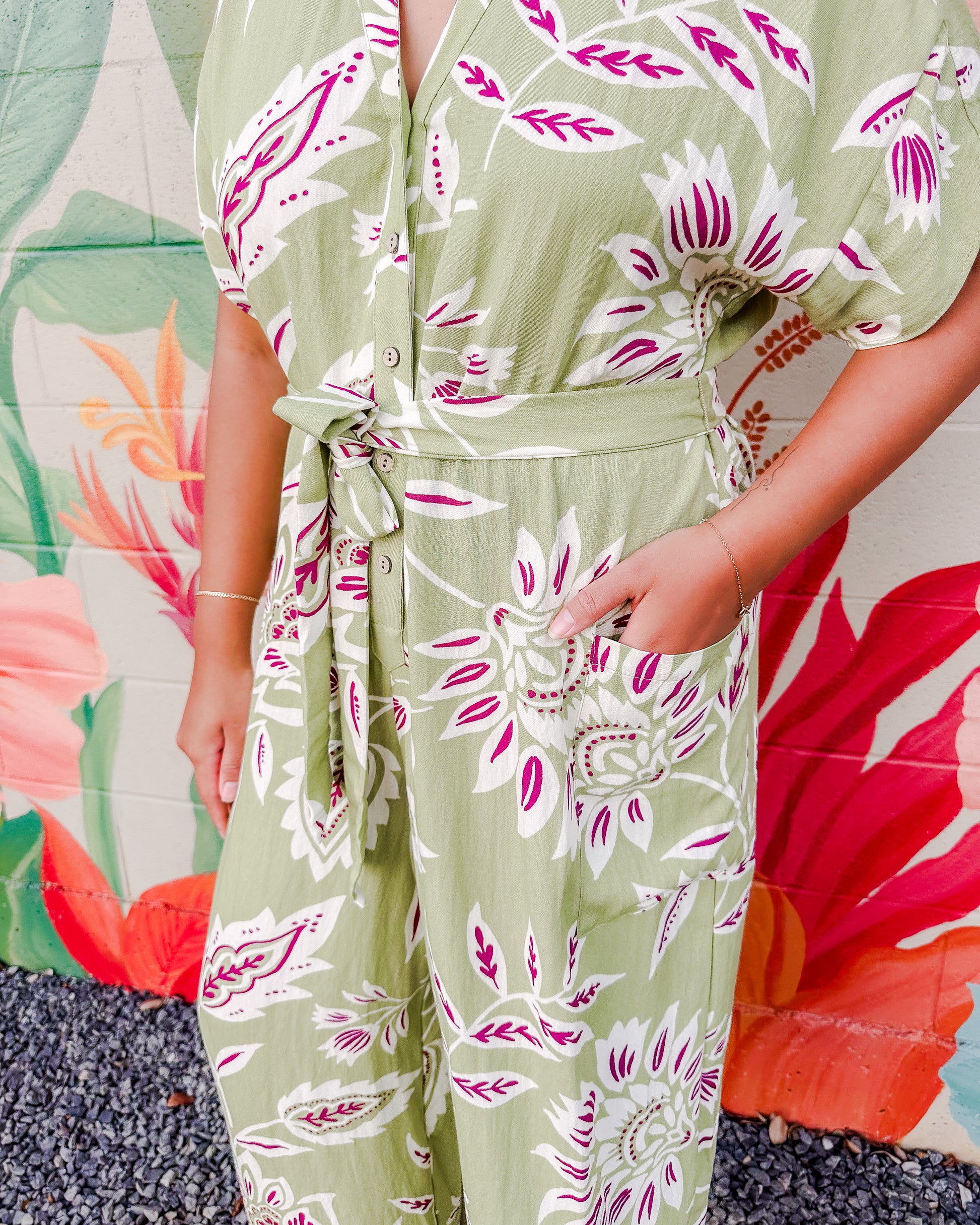 Effortless and chic, the Mindy Jumpsuit features a vibrant floral print on lightweight rayon-nylon blend. The collared V-neck with button-down front, adjustable ribbon tie waist, and wide-leg silhouette create a relaxed, flattering fit. Practical side pockets complete this versatile one-piece essential.