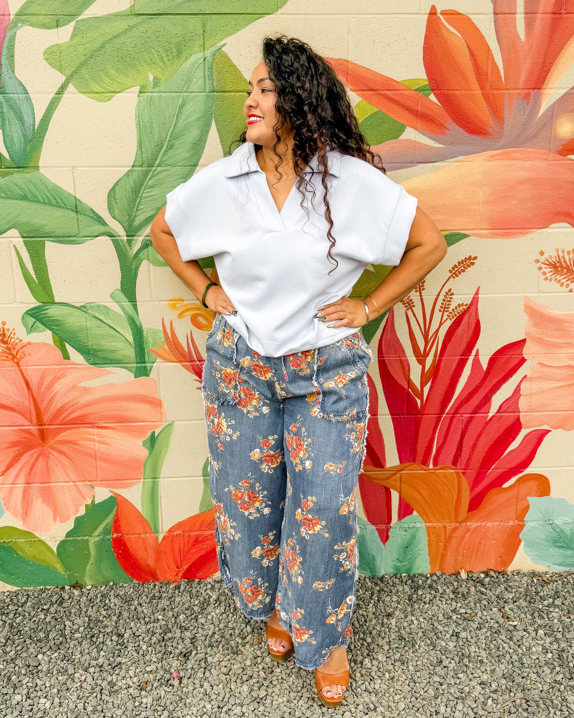 Effortless style meets comfort in these Miranda Pants. Featuring a relaxed wide-leg silhouette in soft washed chambray with an all-over floral print, they're designed for laid-back days. The elastic waistband with drawstring tie and side pockets keep things practical, while frayed edges add a casual, lived-in touch. Perfect for weekend wear or easy dressing any day.