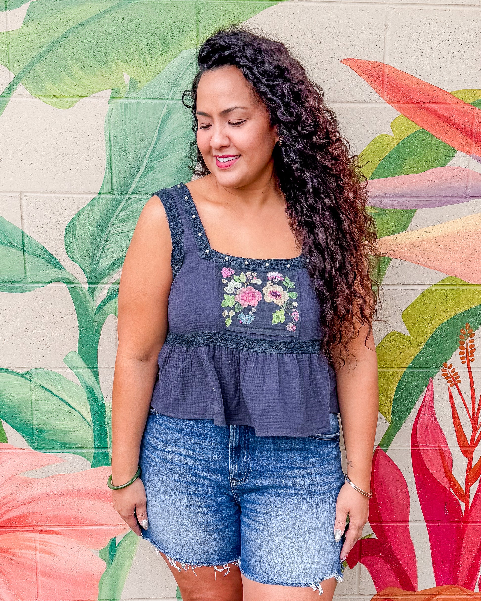 The Miren Top features a charming square neckline and sleeveless design crafted from soft double gauze fabric. A delicate floral print adorns an outseamed self patch, while pearl accents at the neckline add vintage appeal. Ruching details and a ruffled trim create texture and movement. Finished with vintage washing for a relaxed, lived-in feel, this regular-fit top pairs effortlessly with your everyday wardrobe.