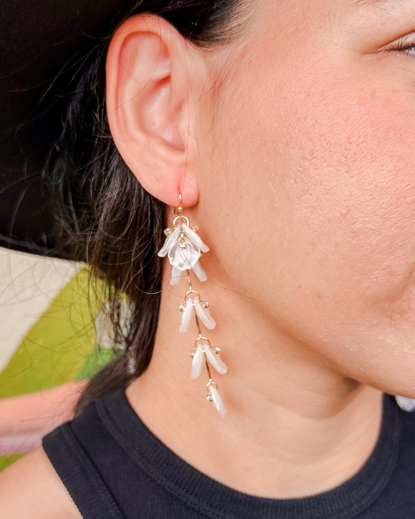These gorgeous new earrings are like a waterfall of white flower petals & sparkle, and will literally dress up any outfit! Gold plated, hook earrings. Light and very easy to wear all night long!