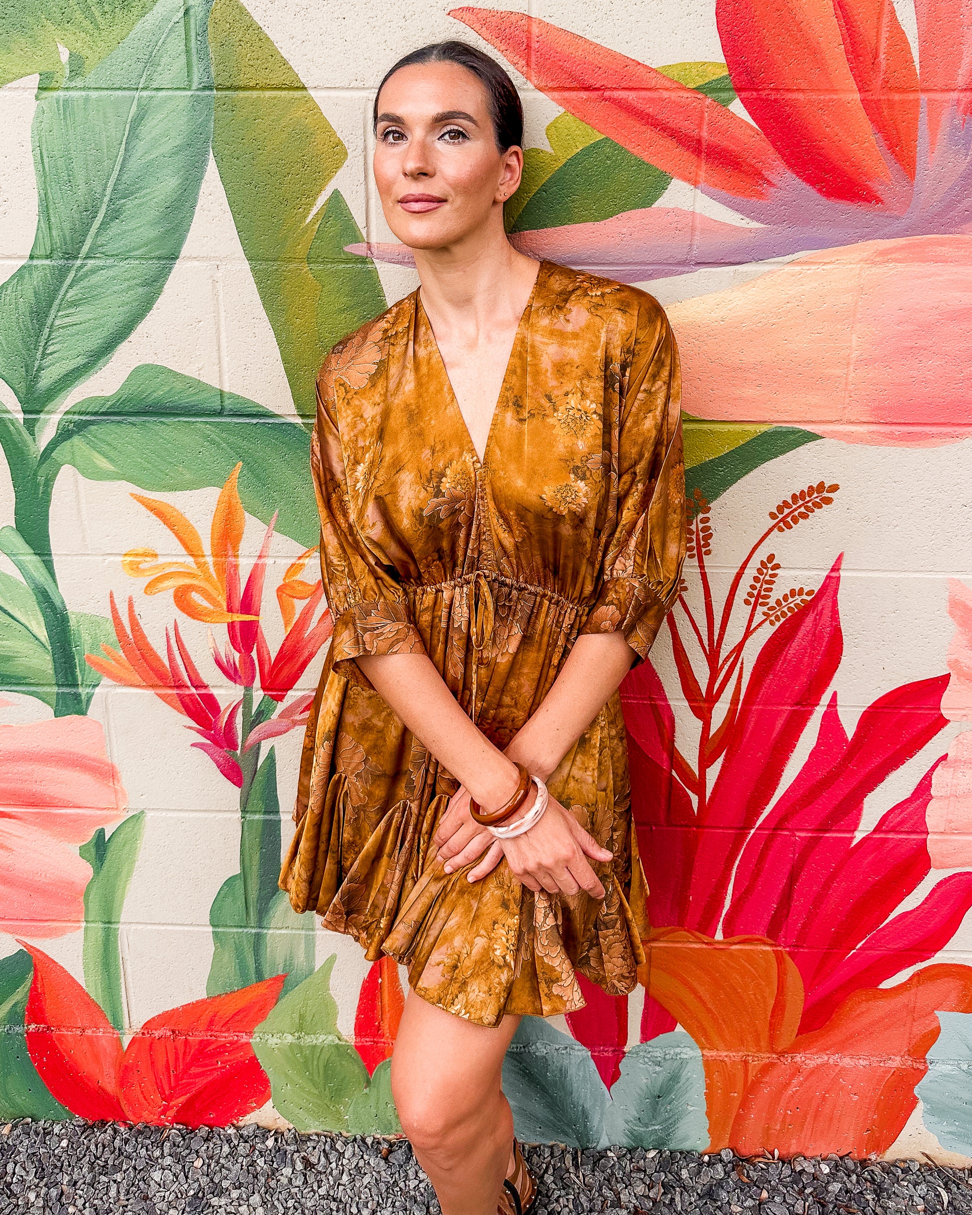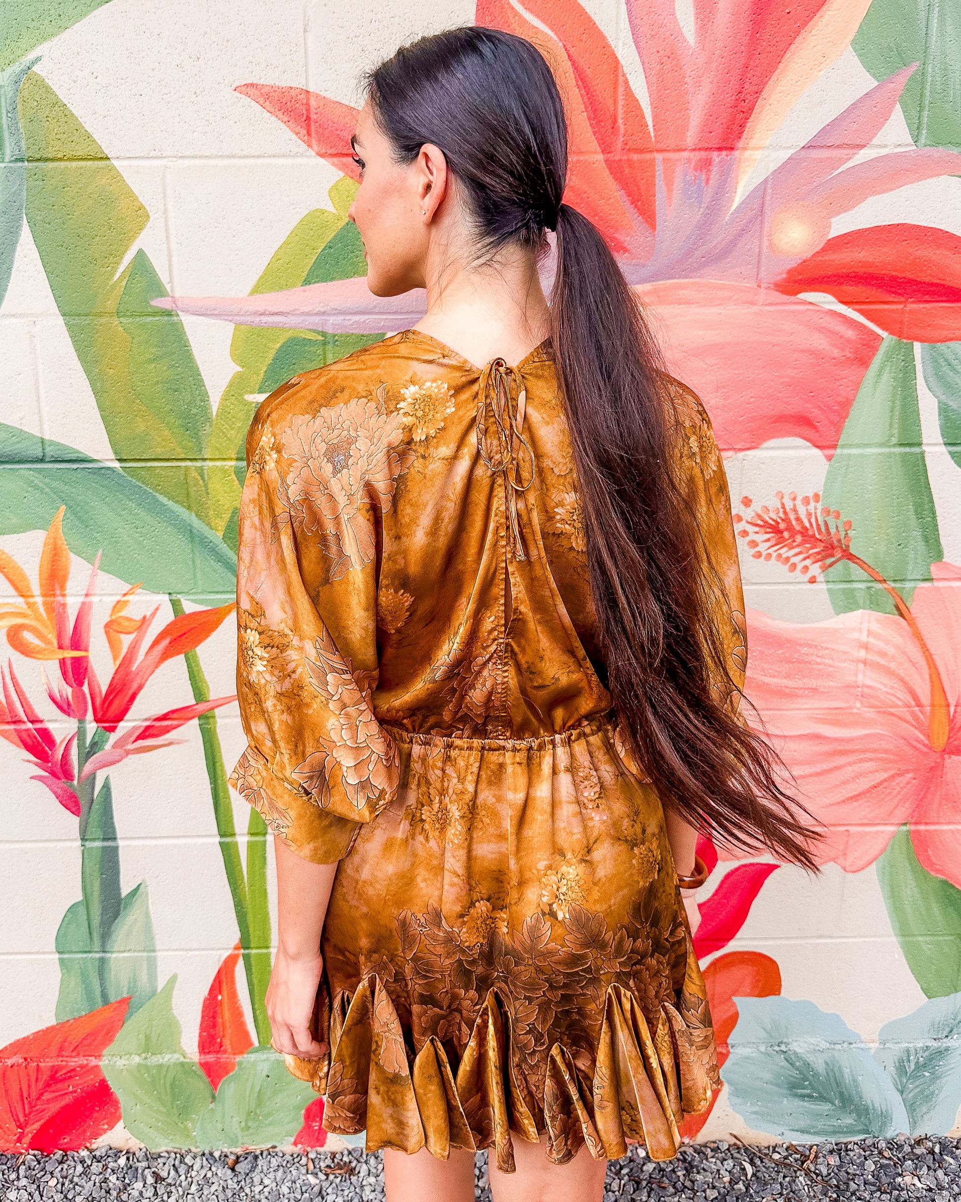 The Nevine Dress offers easy sophistication with flowing dolman sleeves and a mini length. A front tie cinches the waist for a flattering fit, while the ruffled hem adds playful movement. Dress it down for casual days or up for evening—this versatile piece transitions seamlessly between occasions.