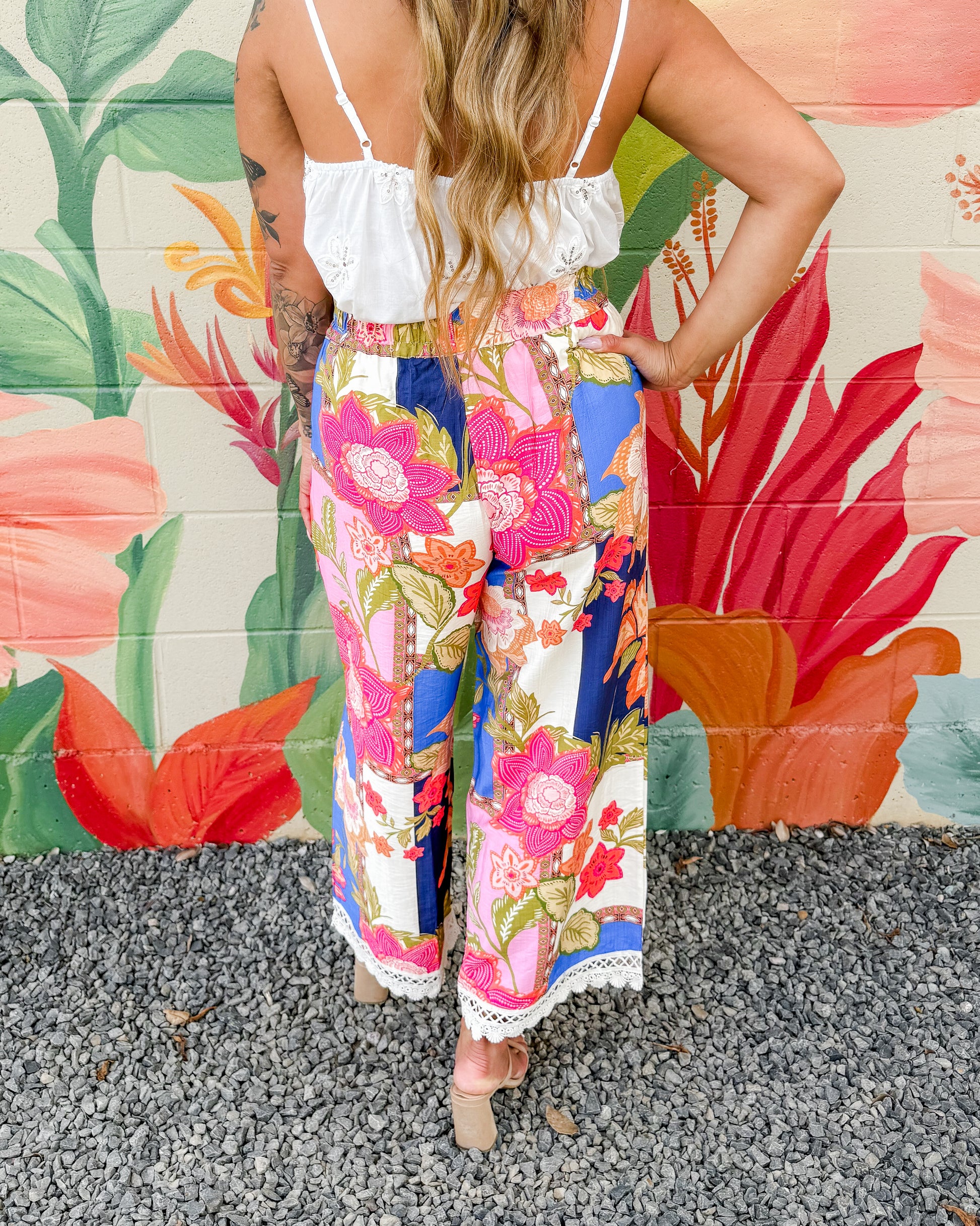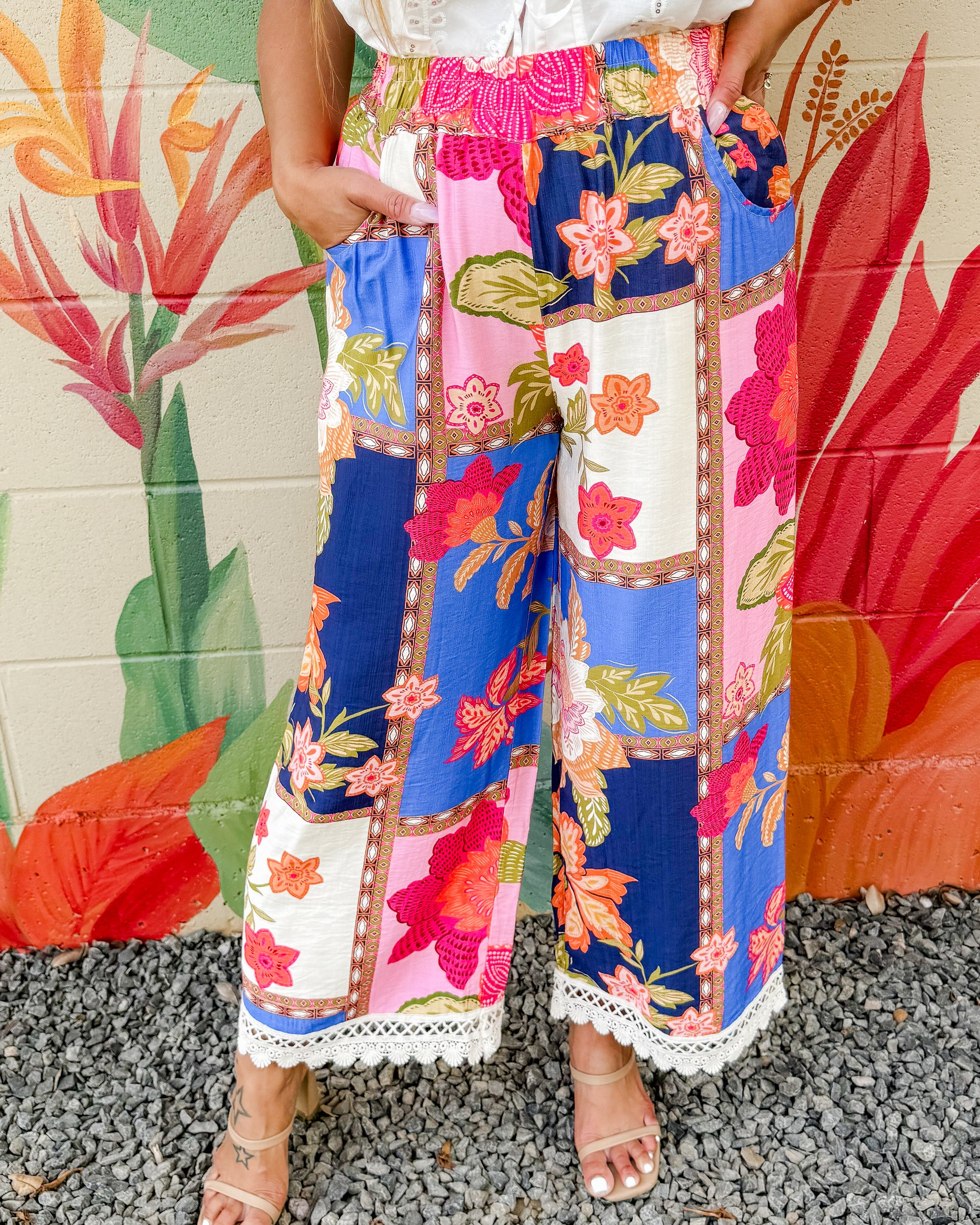 Make a statement with these Nicola Pants, featuring a striking abstract patchwork print in vibrant florals. The comfortable elastic waistband pairs perfectly with delicate lace trim detailing for an effortless, eye-catching look. Unlined for breathable wear.