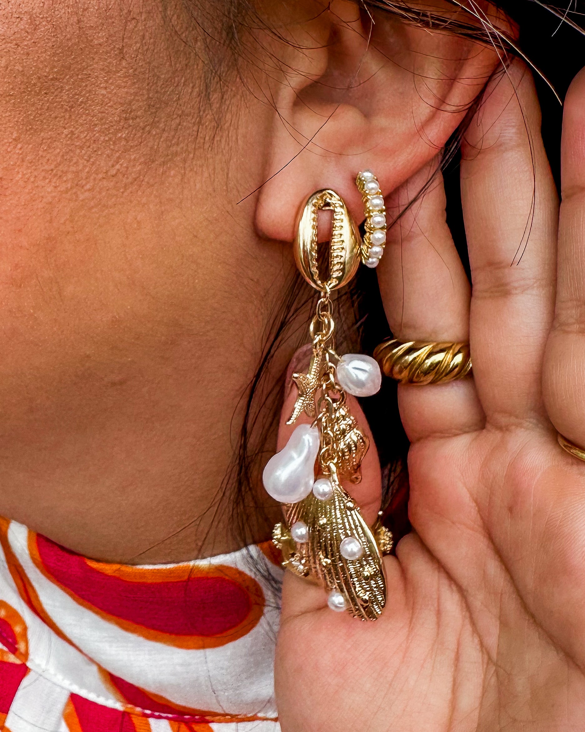 Channel your inner ocean siren with these beautiful dangle earrings featuring a mix of shells and pearls. Gold plated. ~3" in length.