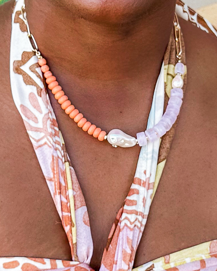 Add some peach candy to your neck with our new Peach Prosecco Necklace! Gorgeous mixed beads and pearls create this fun, asymmetrical necklace that'll be the pop of color you need for your next summer look.