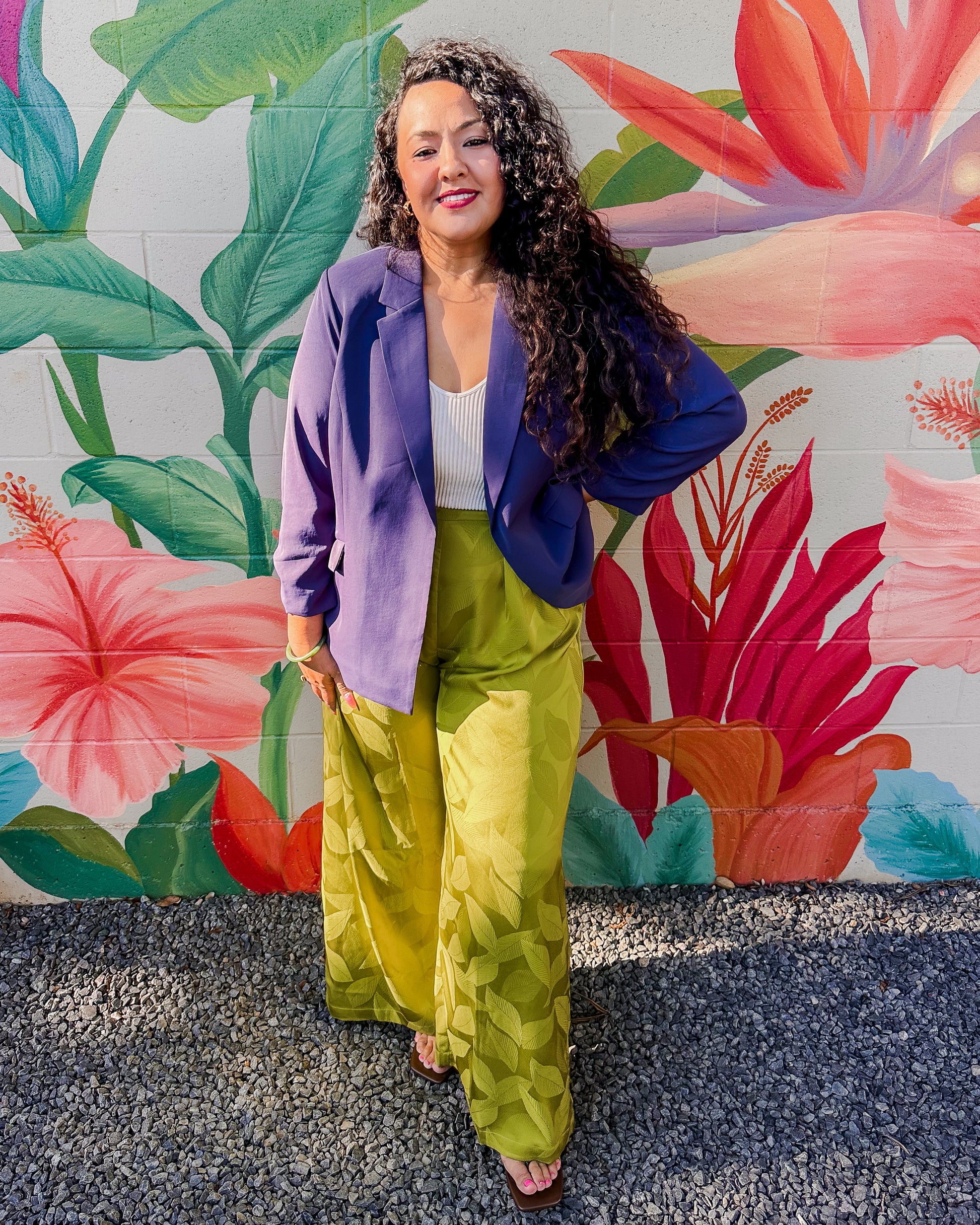 Peridot Pants offer a breezy wide-leg fit with an elastic back waistband for all-day comfort. The leaf print adds a natural touch to your everyday wardrobe.