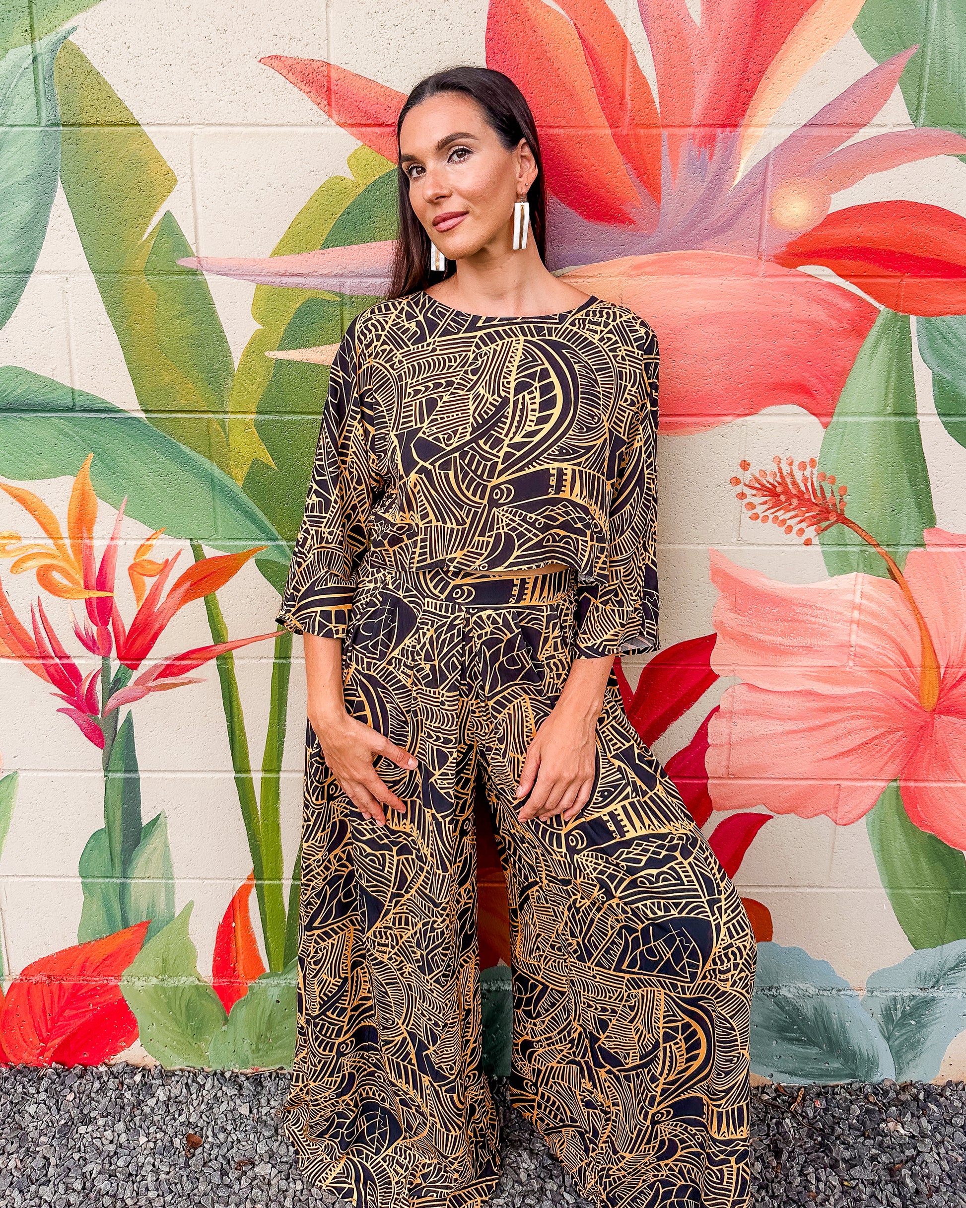 The Raina Pants feature a striking tribal-inspired print with a comfortable wide-leg cut and pleated front detail. Designed for both style and ease, they work equally well dressed up for work or down for casual outings. A standout piece that adds personality to any wardrobe.