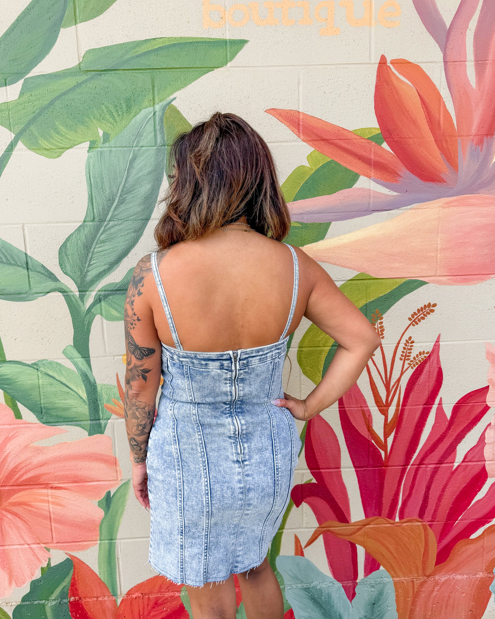 Effortless and edgy, the Razzy Dress features a light-wash stretch denim construction with exposed seams for modern appeal. Delicate spaghetti straps pair with a raw hem and back zipper closure for an easy, laid-back vibe. Perfect for casual days or dressed up for night.