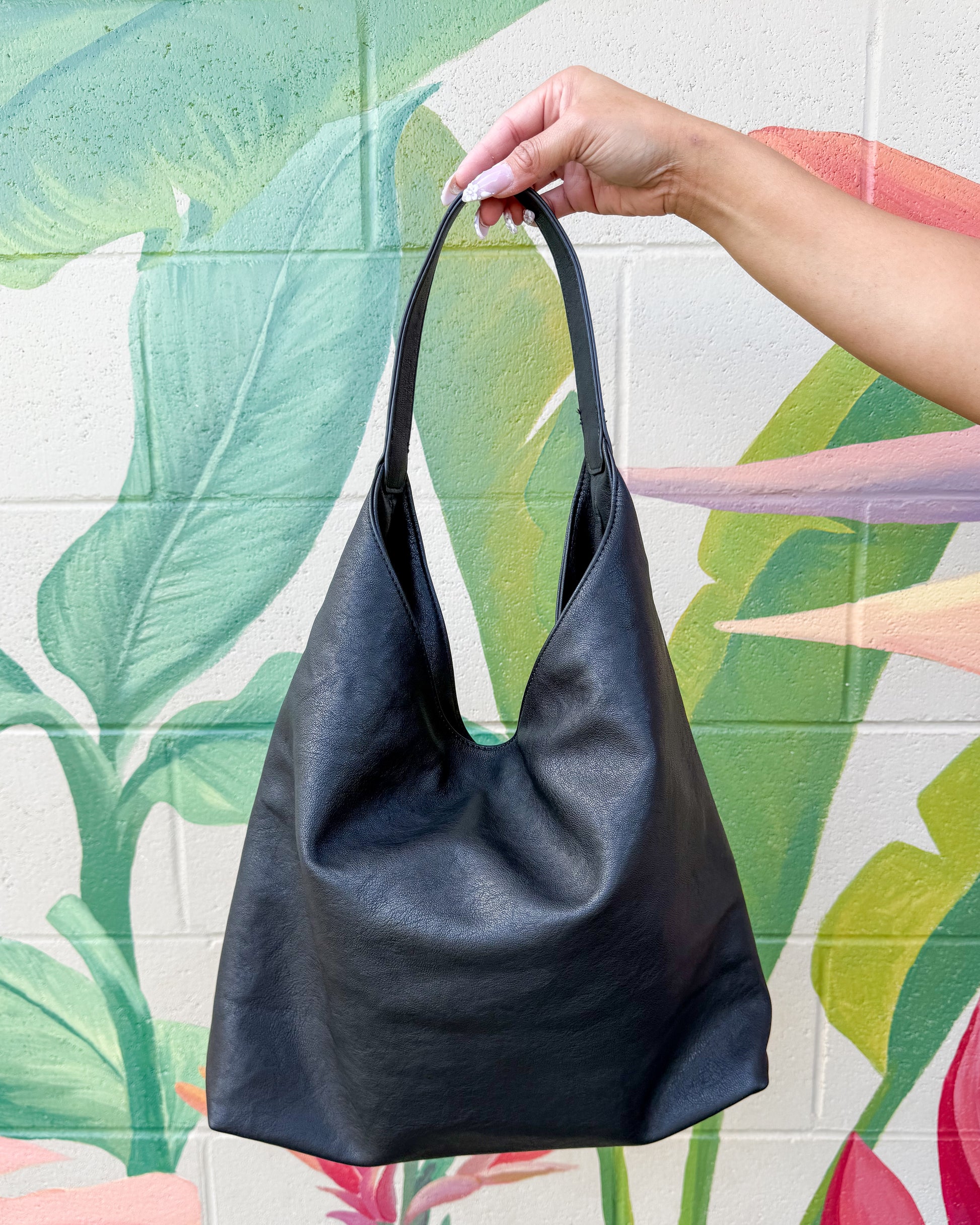 Super soft black hobo bag with gold stud details on one side. Magnetic button closure.