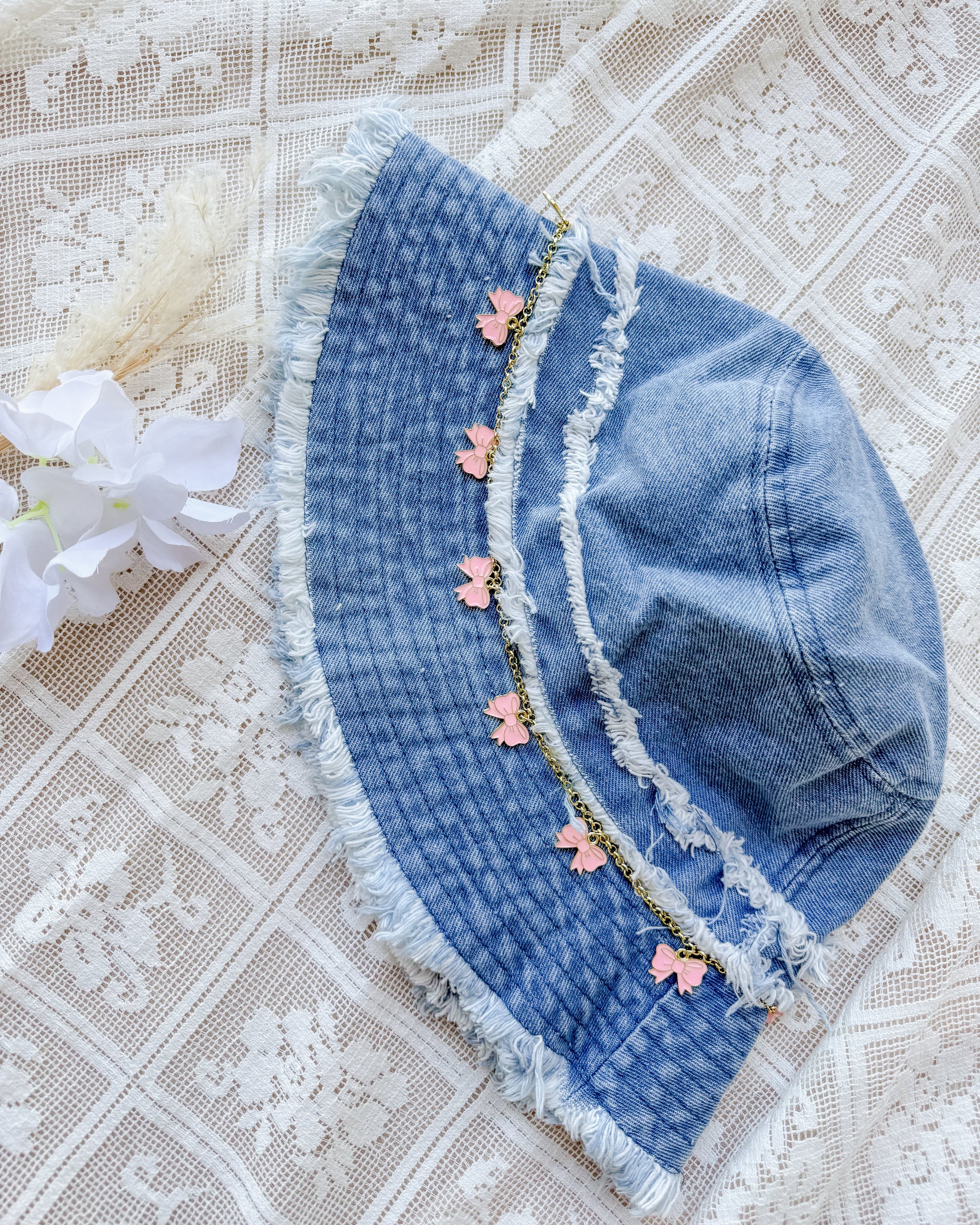 How fun is this playful, denim bucket hat adorned with cute bow charms that just add a little extra ✨ girl ✨.