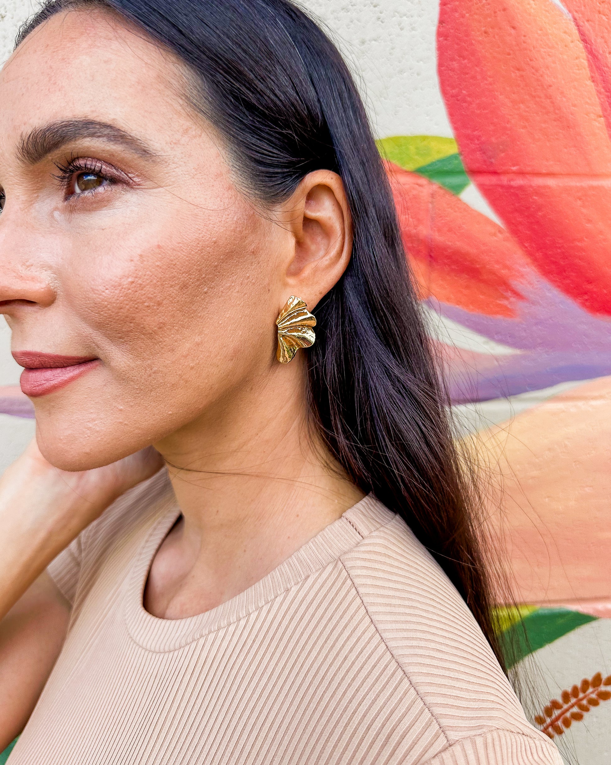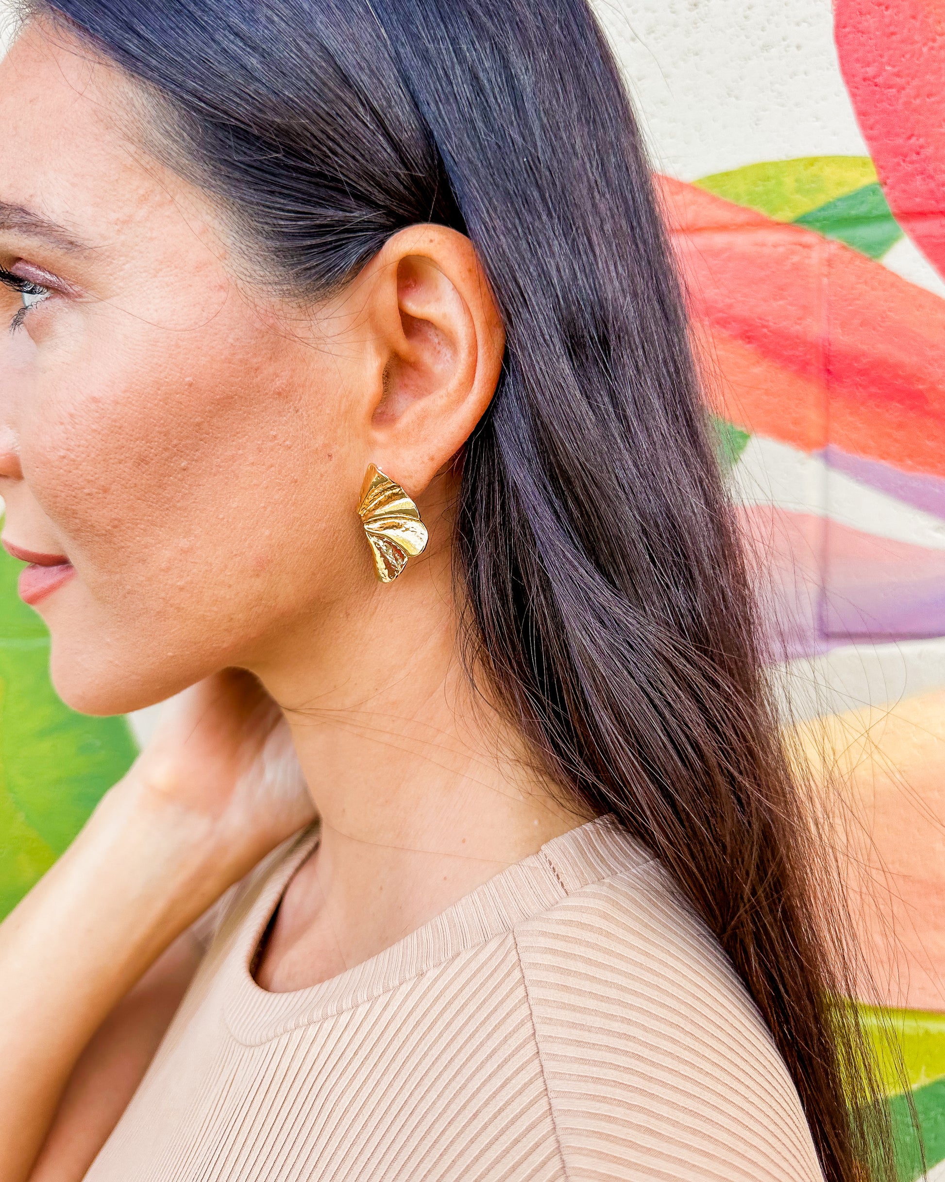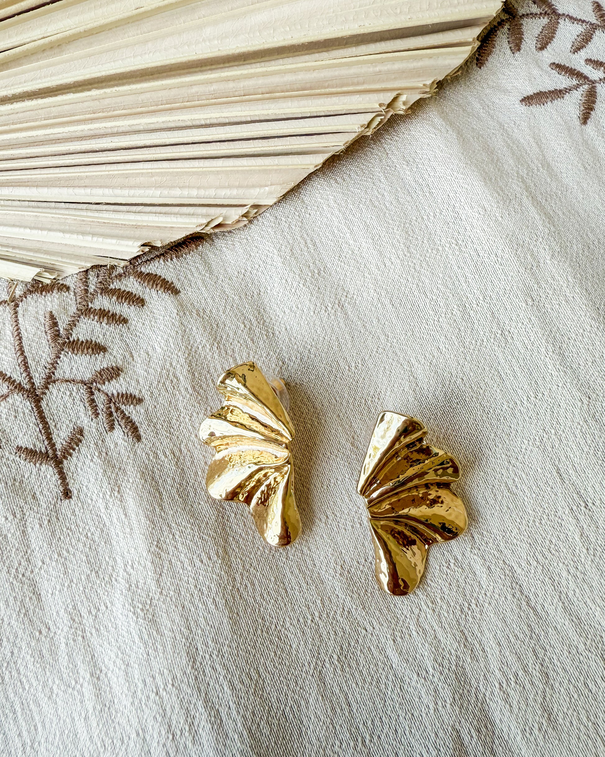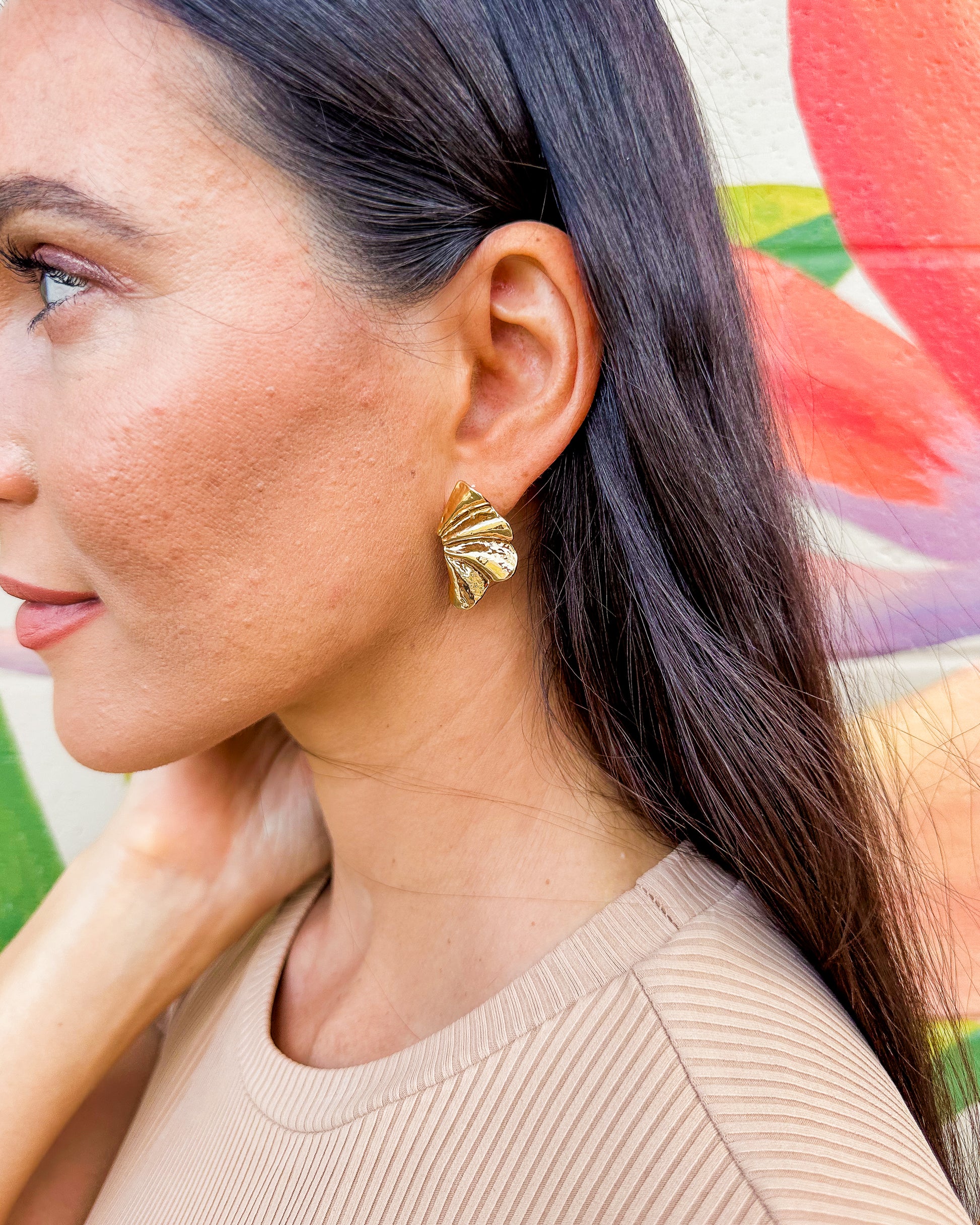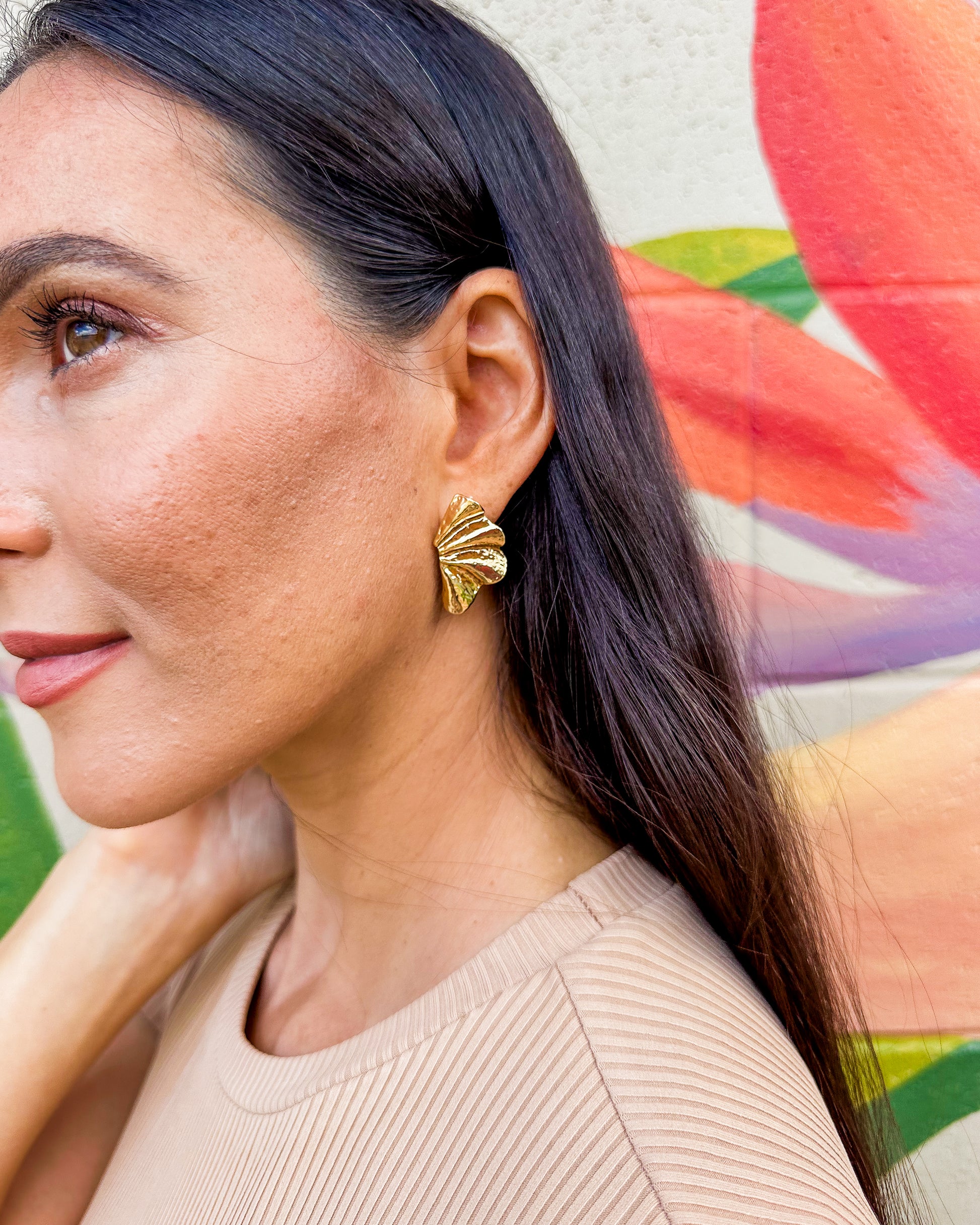 Half fan stud earrings that will add a little bit of elegance to any outfit! Gold plated and lightweight.