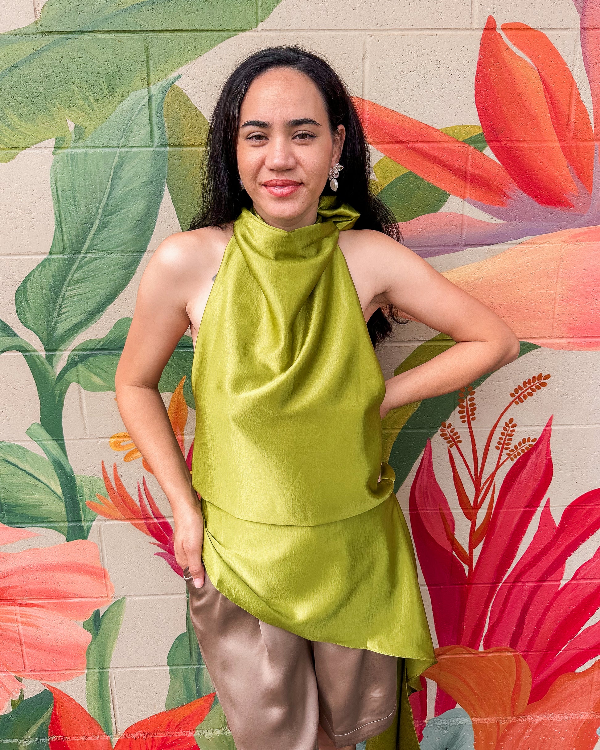 The Sadie Top features a flattering halter neckline with an artfully uneven hemline that adds modern edge to any outfit. This lightweight tunic top works beautifully layered or worn solo, perfect for casual days or dressed up for evening. The relaxed fit and unique hemline create an effortlessly chic silhouette that stands out from the ordinary.