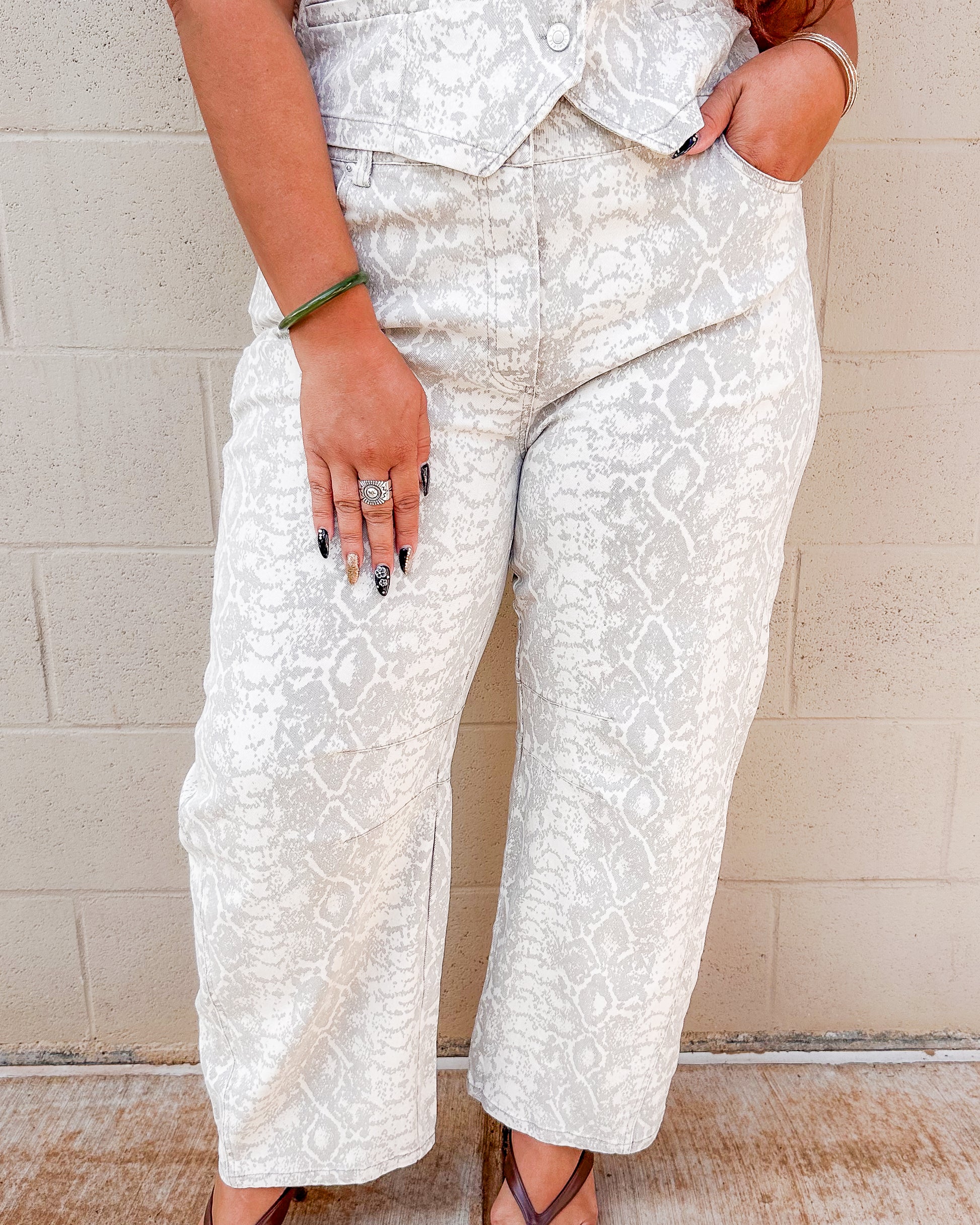 Sheila Pants offer a stylish twist with their snake skin print on soft, stretch cotton twill fabric. Designed in a barrel shape, these pants provide comfort and a relaxed fit while adding a subtle edge to your wardrobe. Perfect for effortless everyday wear with a touch of personality.