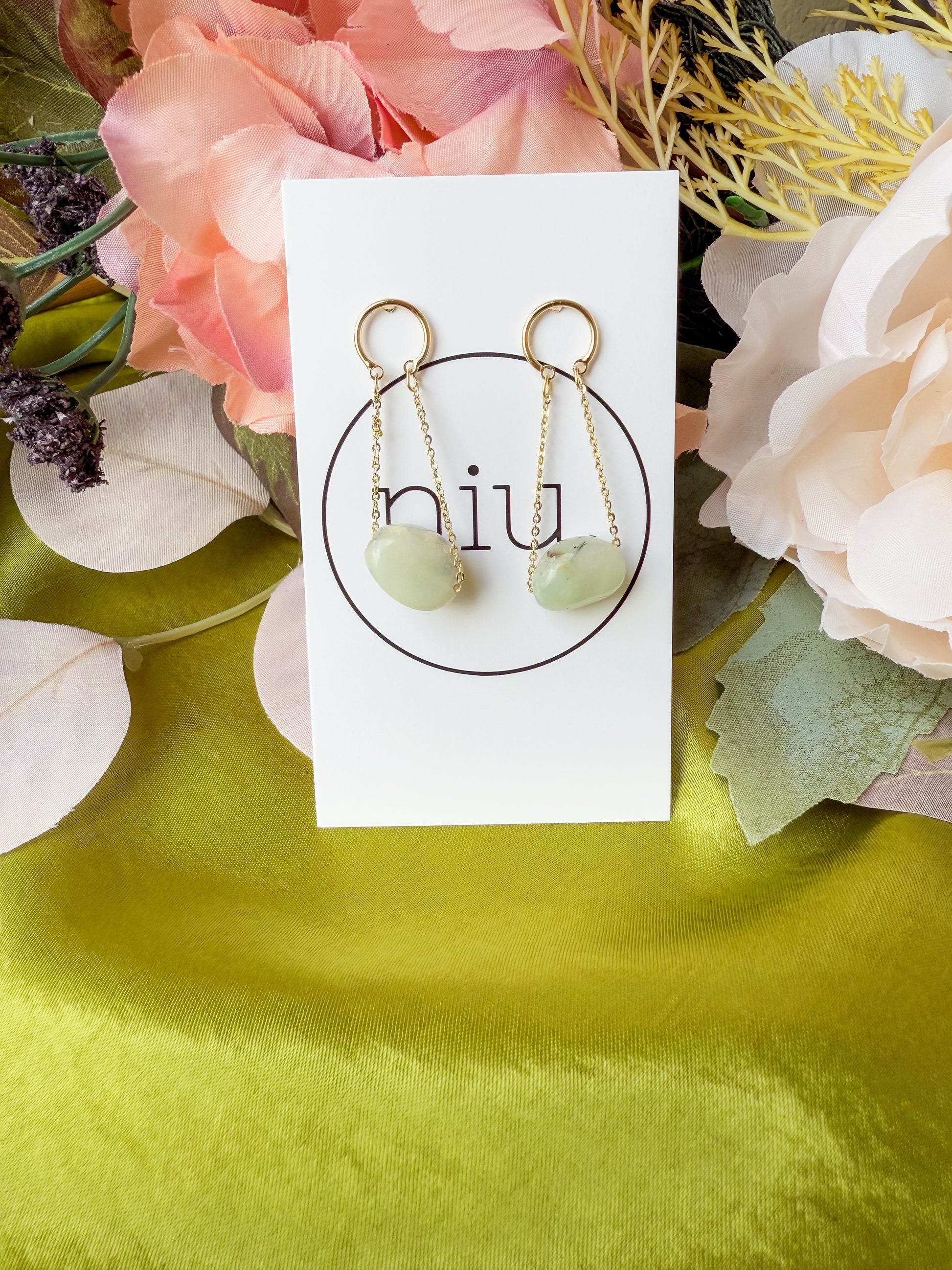 Semi-precious stones dangling from gold plated chains & circle studs for a fun, unique look. Lightweight & perfect for everyday wear.