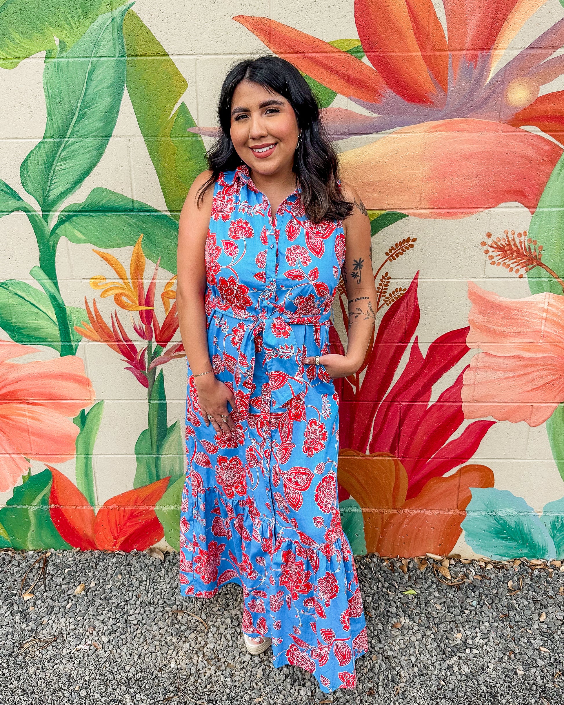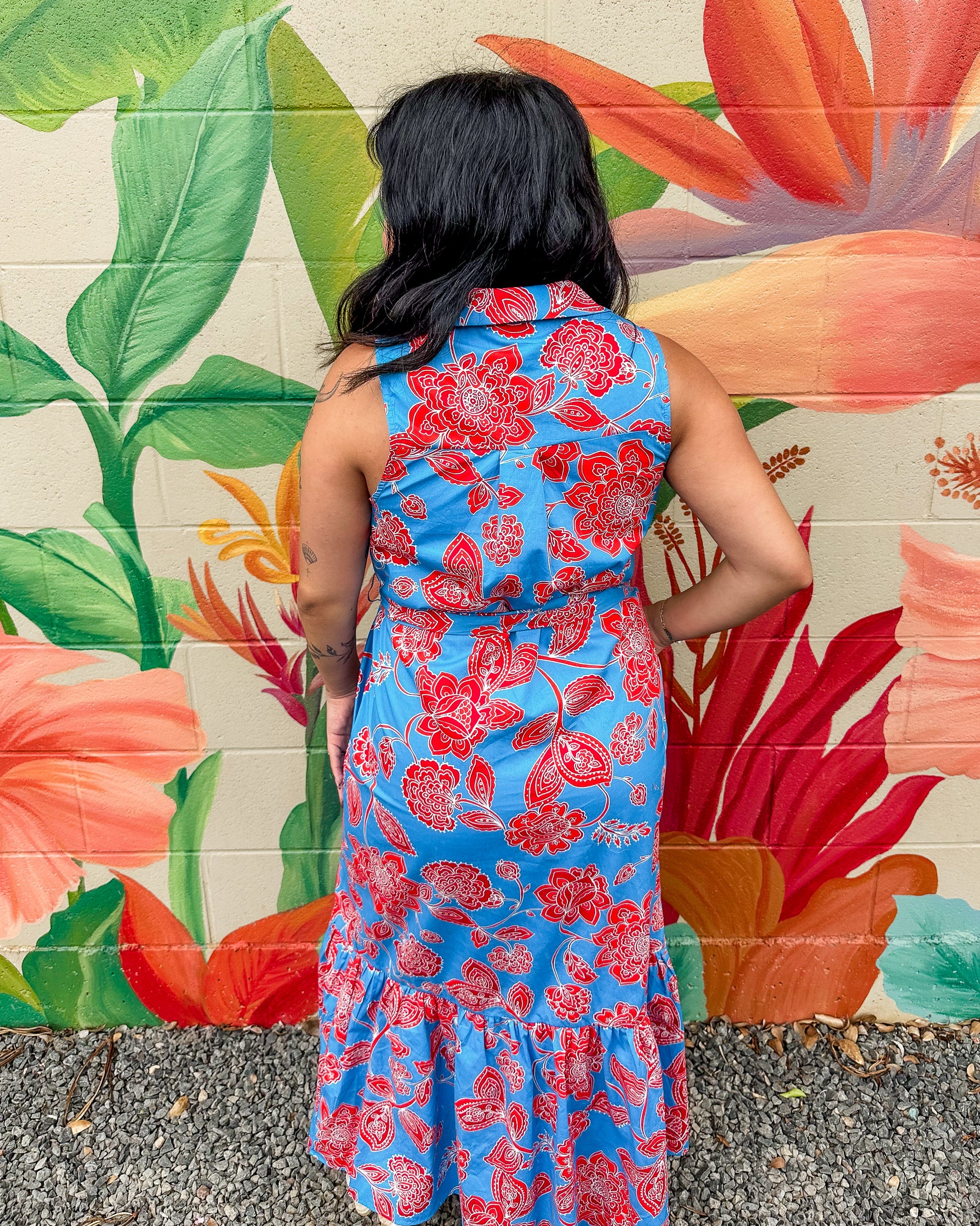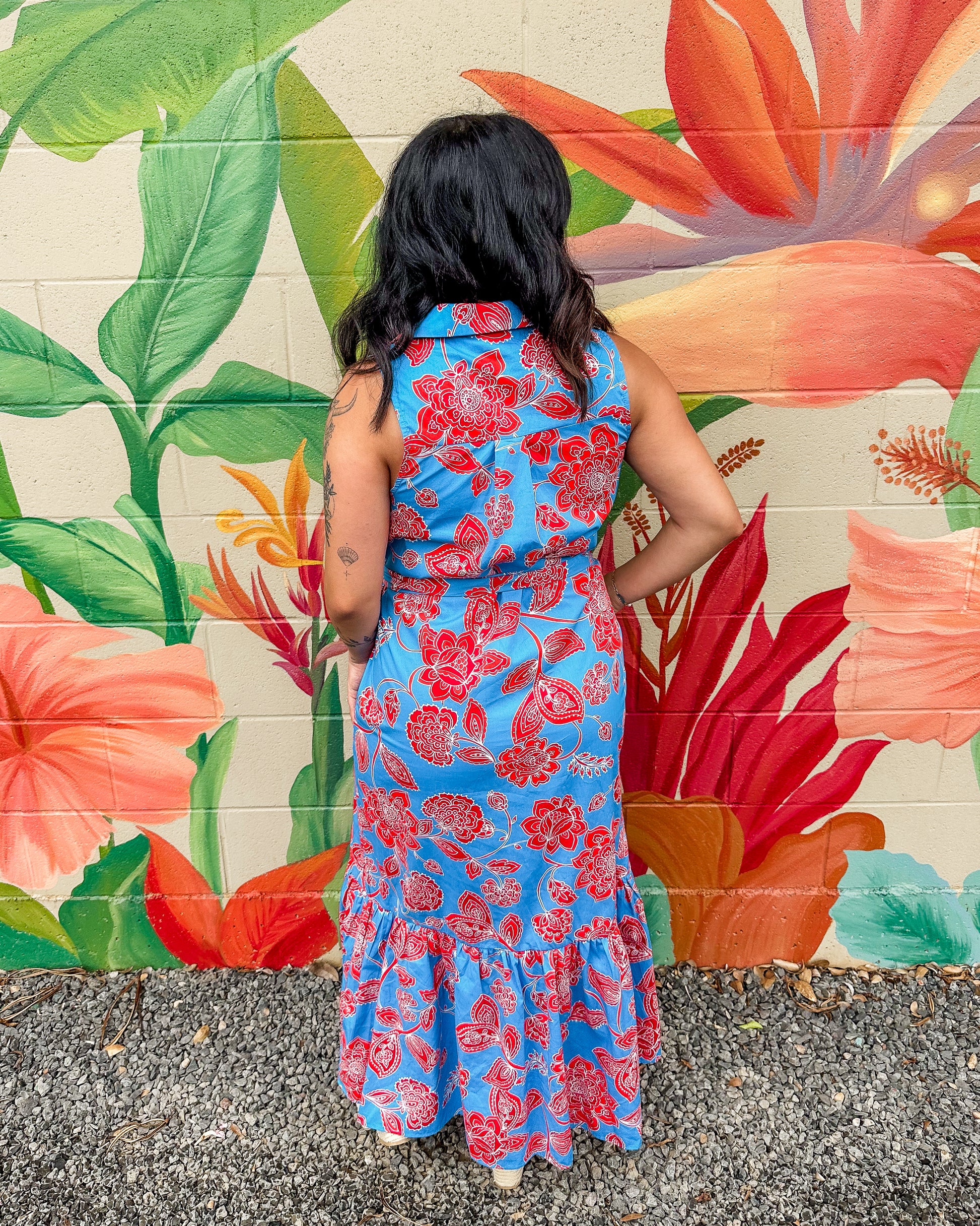 The Sloane Dress features a graceful blue and red floral pattern on a sleeveless maxi silhouette. Its high collar forms a subtle split neckline complemented by a button-down front, offering a refined look. An adjustable belt cinches the waist for a flattering fit. Perfectly paired with red heels and matching earrings, this dress brings effortless elegance to any occasion.