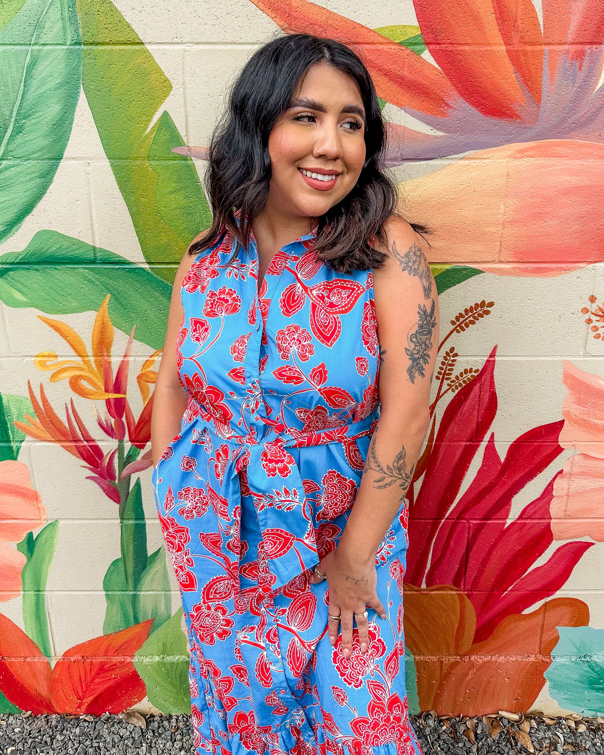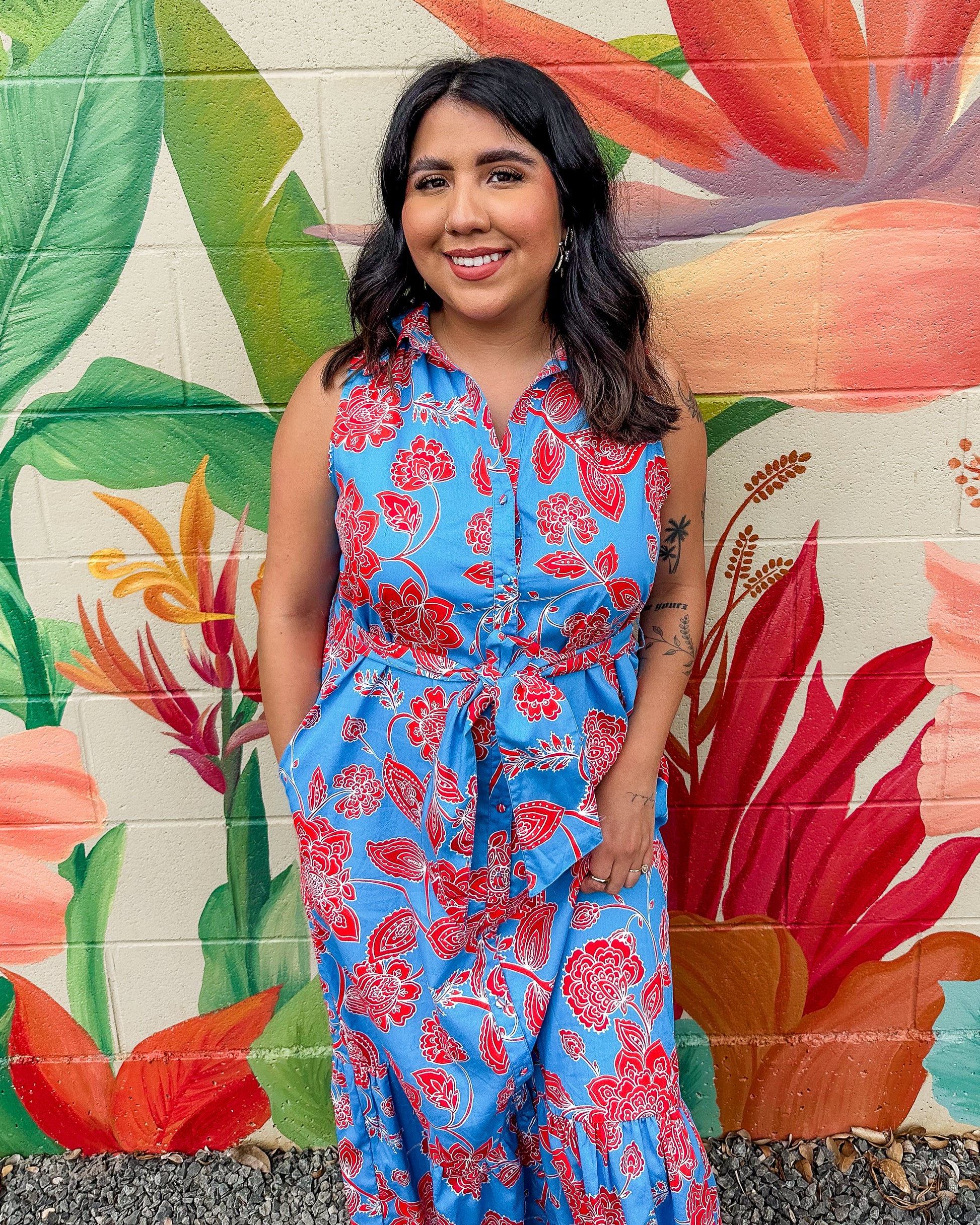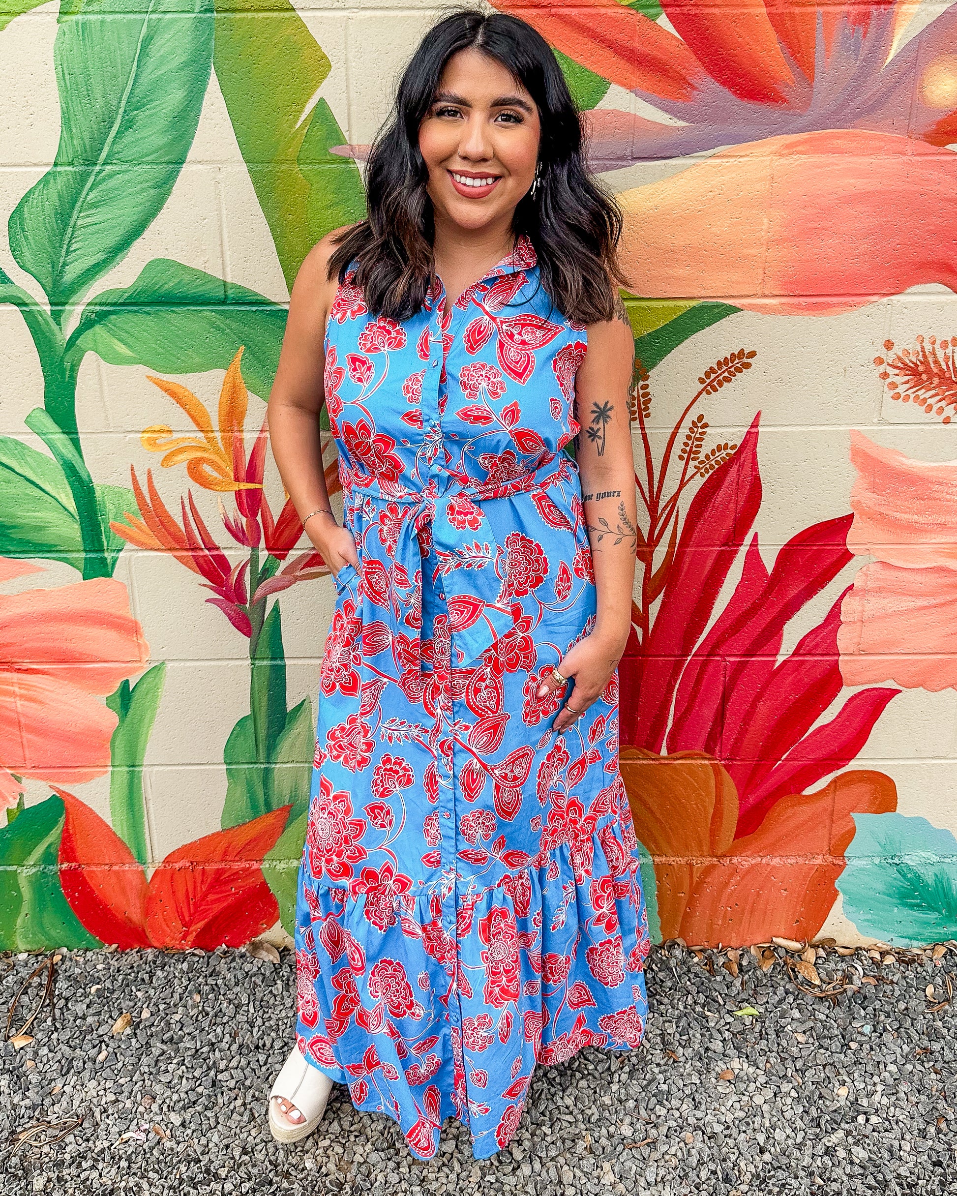 The Sloane Dress features a graceful blue and red floral pattern on a sleeveless maxi silhouette. Its high collar forms a subtle split neckline complemented by a button-down front, offering a refined look. An adjustable belt cinches the waist for a flattering fit. Perfectly paired with red heels and matching earrings, this dress brings effortless elegance to any occasion.