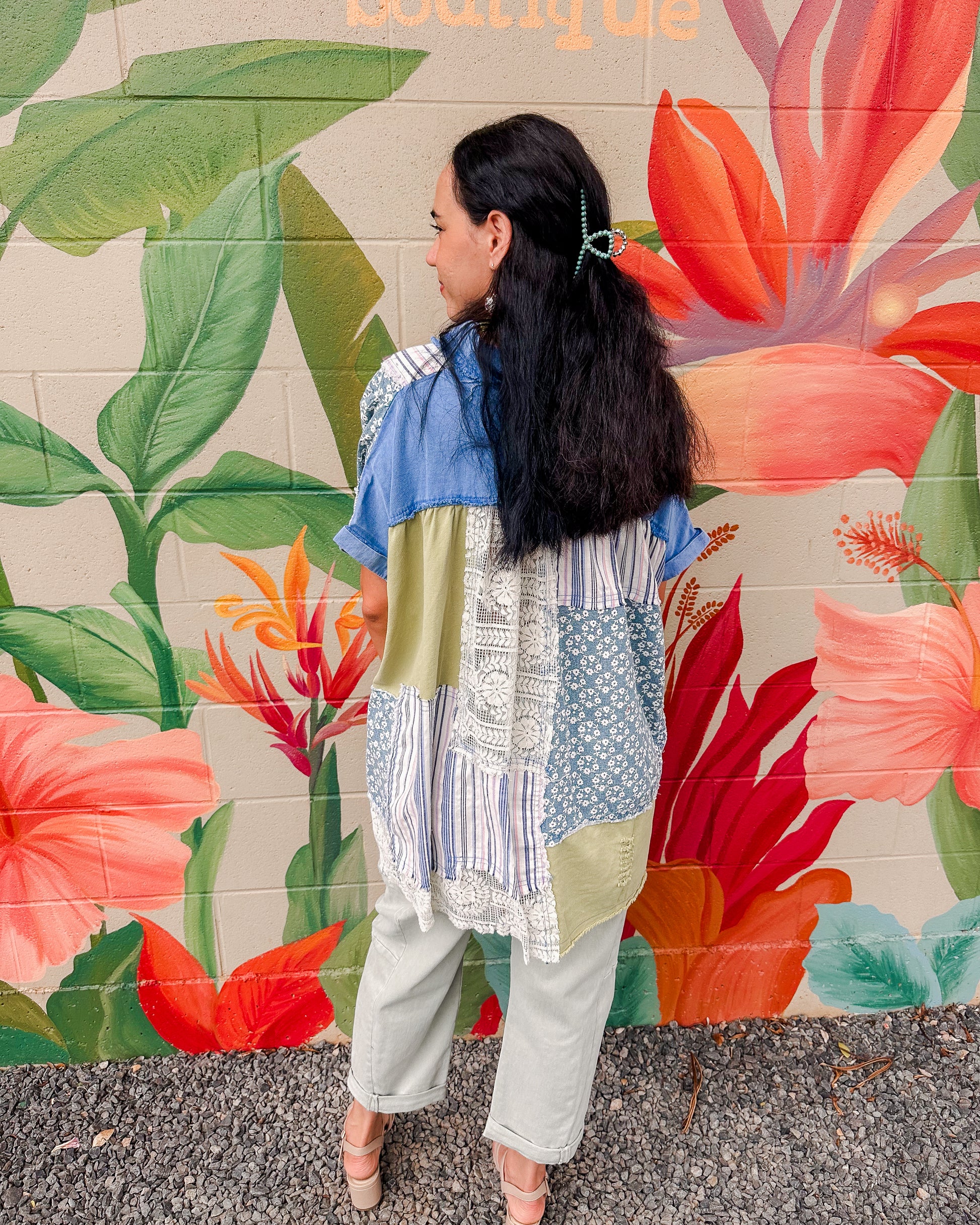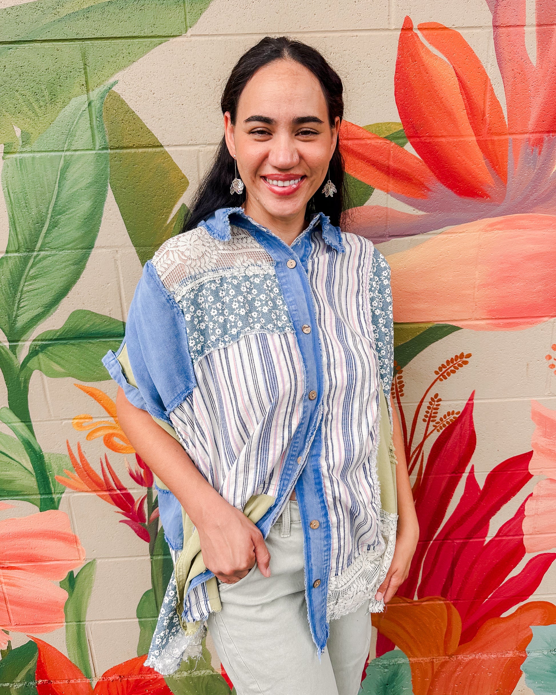 The Soléne Tunic combines multiple fabric prints in a button-up design, creating a unique and artistic look. Its relaxed fit and lightweight materials make it comfortable for all-day wear, while the varied patterns add subtle interest to your outfit. Perfect for layering or standing out on its own with ease and grace.