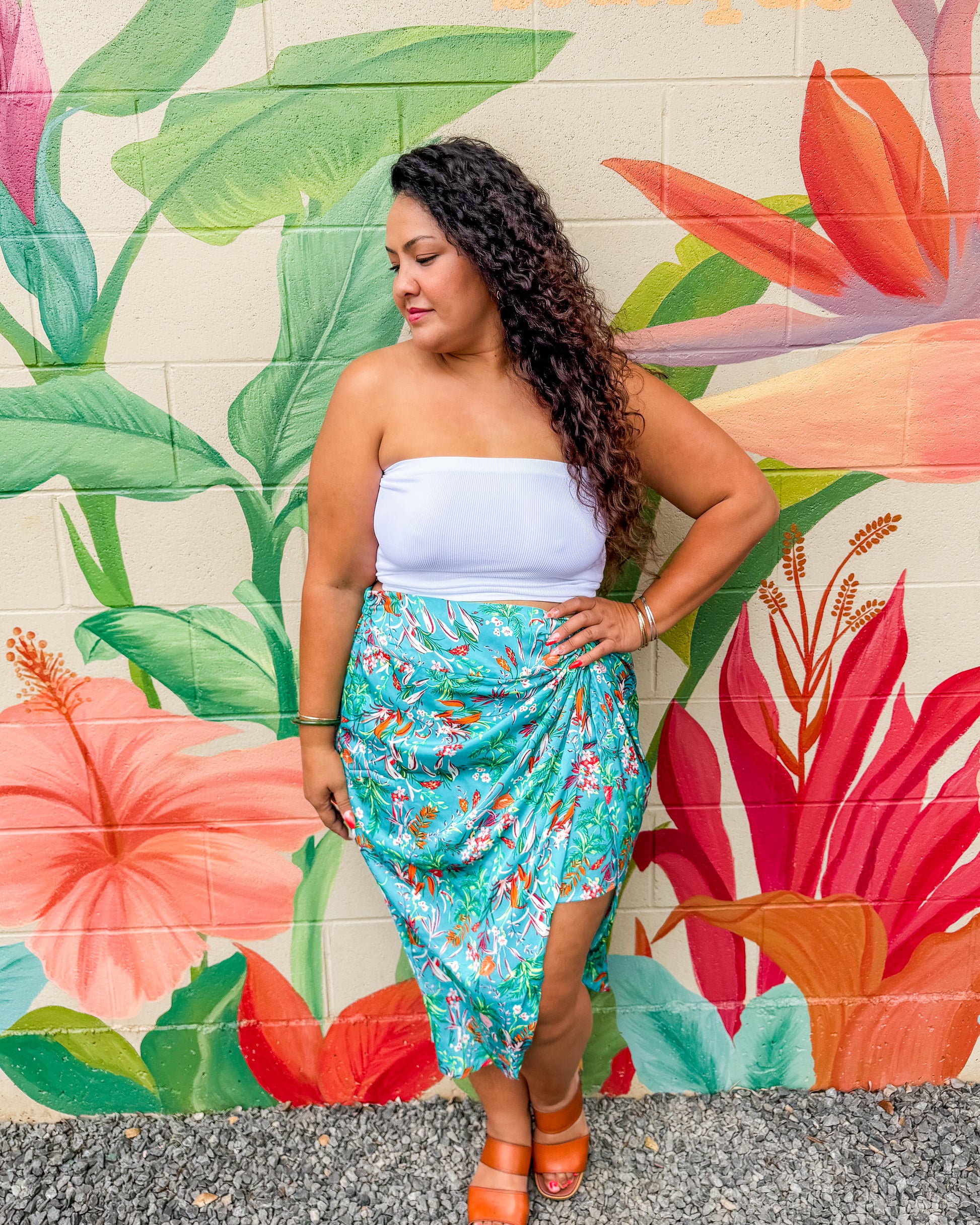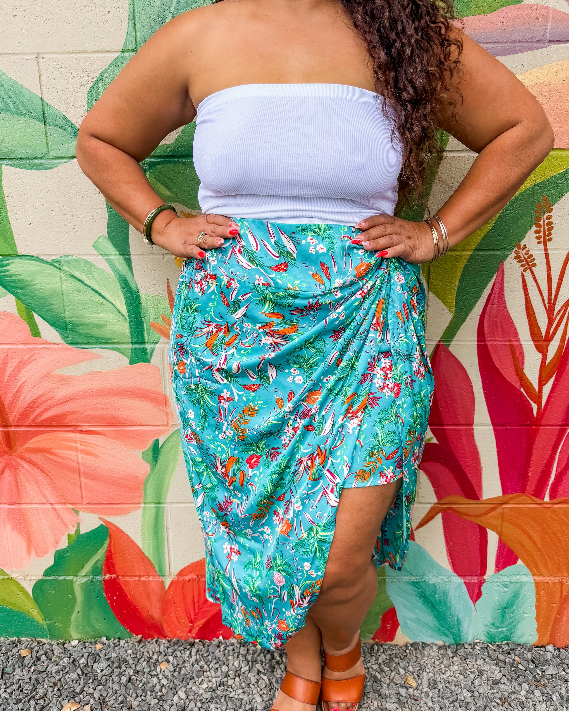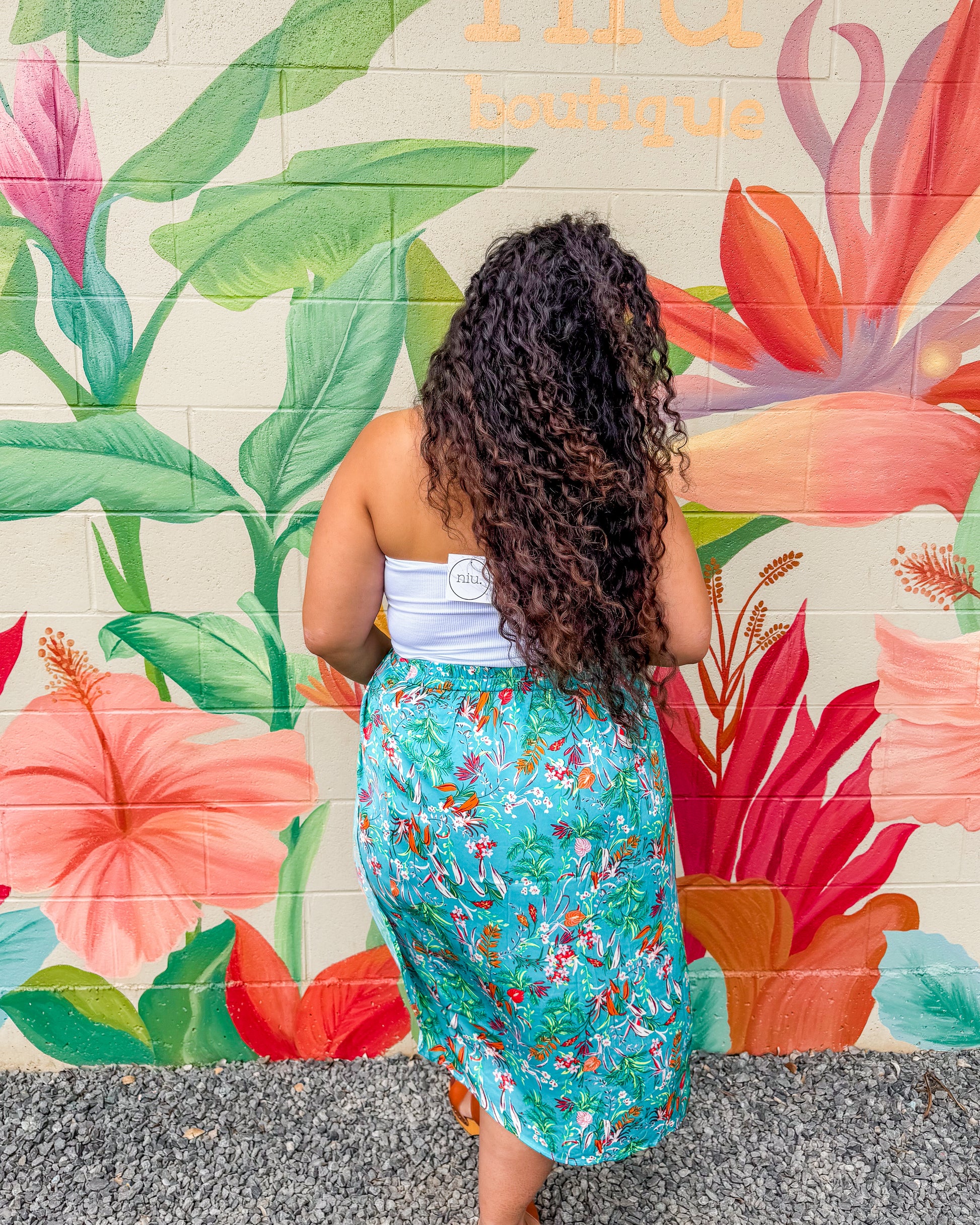 The Sonrisa Skirt features a tropical print and a faux wrap design that flatters your silhouette while offering easy wear. Its lightweight fabric and relaxed fit make it an ideal choice for warm days, bringing a touch of island-inspired elegance to your wardrobe.