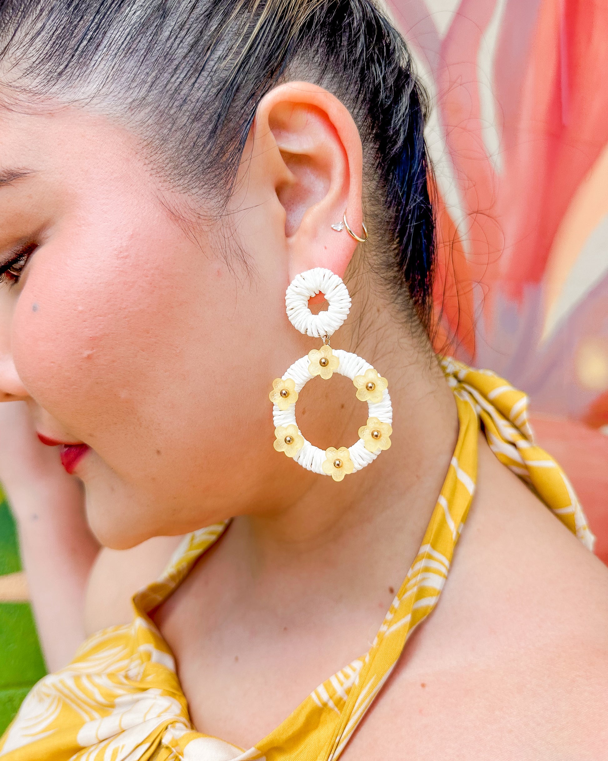 Beautifully wrapped hoops with the prettiest yellow floral details all around. Plated studs. Easy for everyday, spring wear!