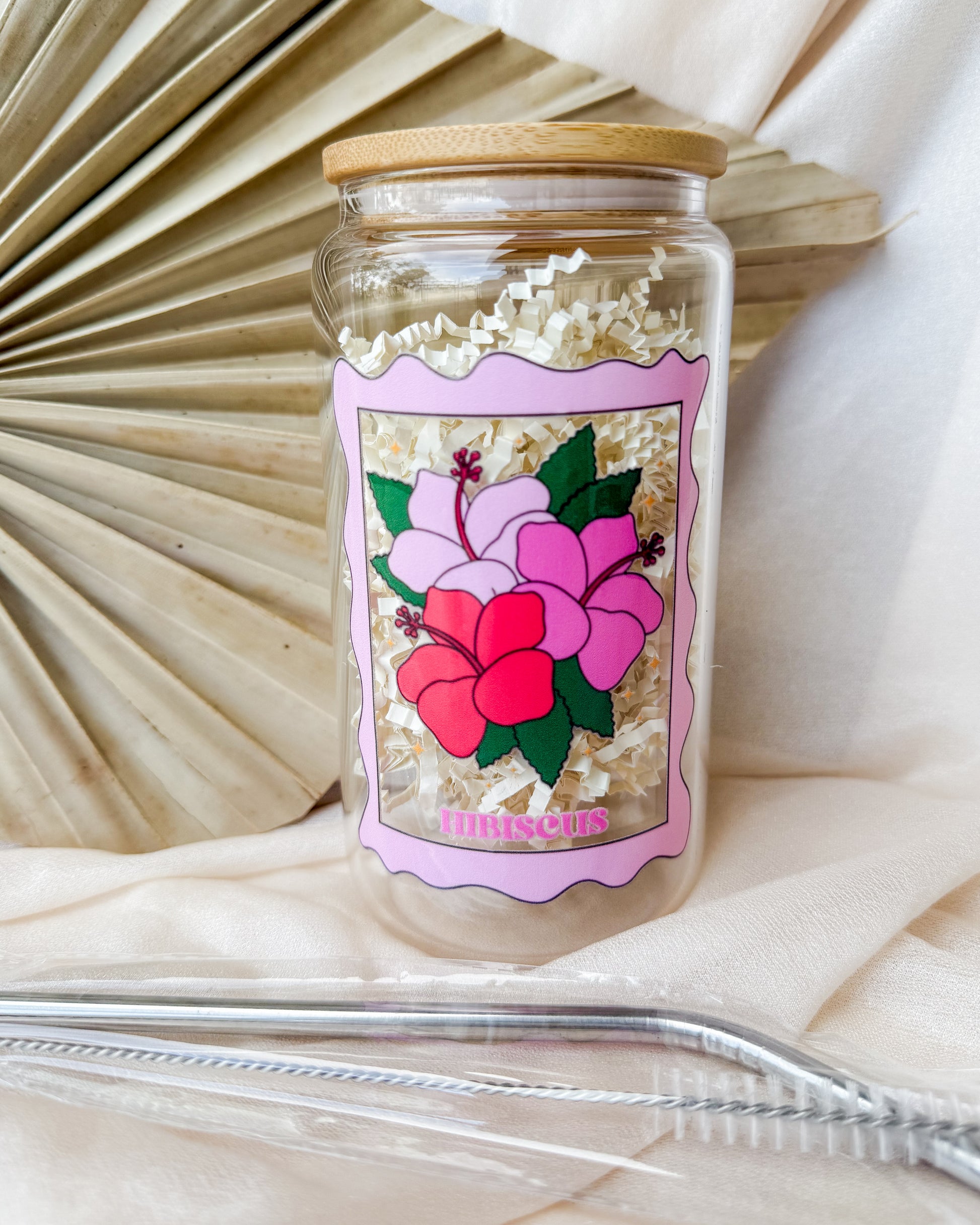 16oz reusable glass cup decorated with a cute floral stamp design! Bamboo lid and glass straw included. Can be used for or cold drinks.