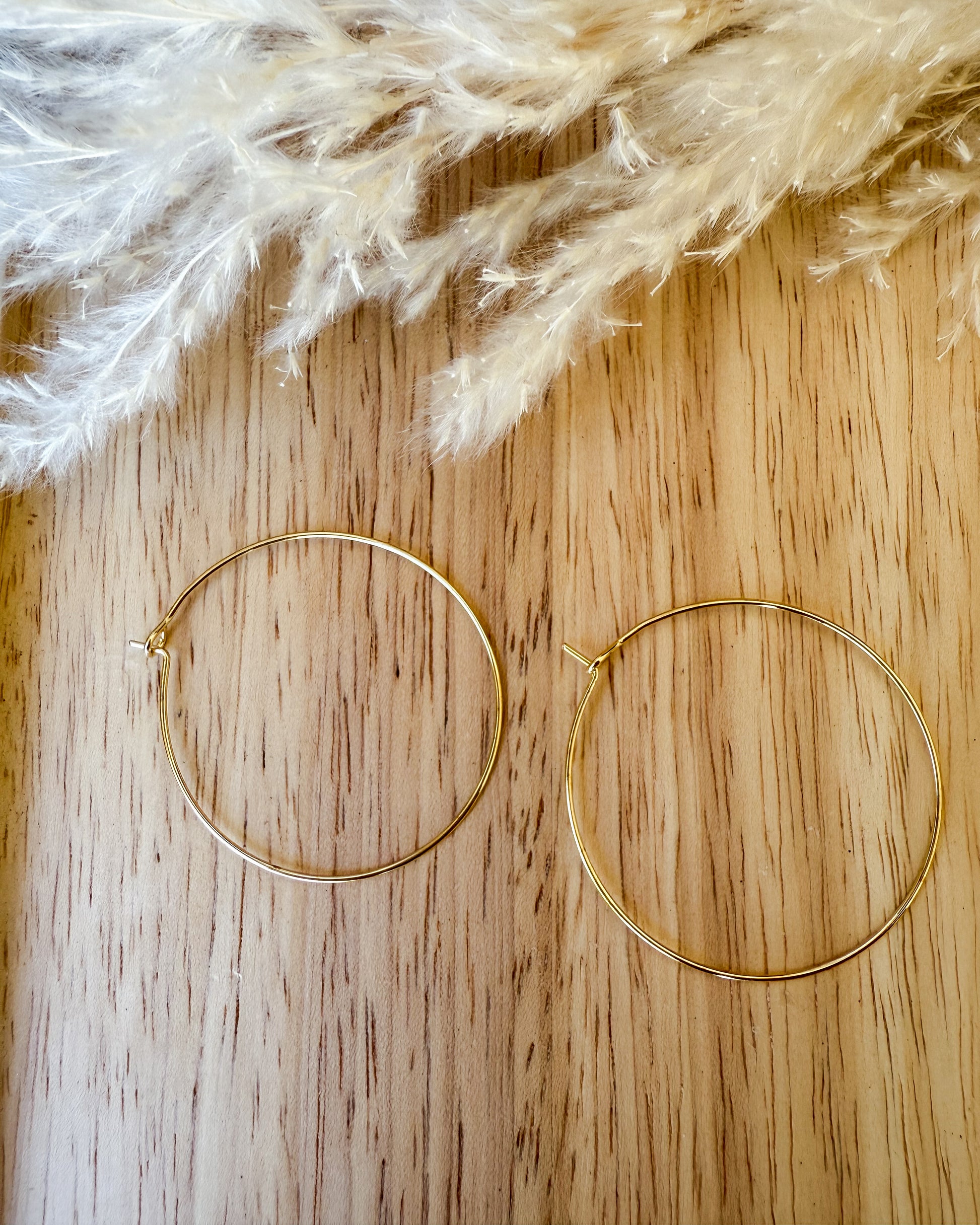 Sometimes all you need is a lightweight, basic hoop. These are super comfortable, making them perfect for every day wear! 14k gold dipped 40mm hoops.