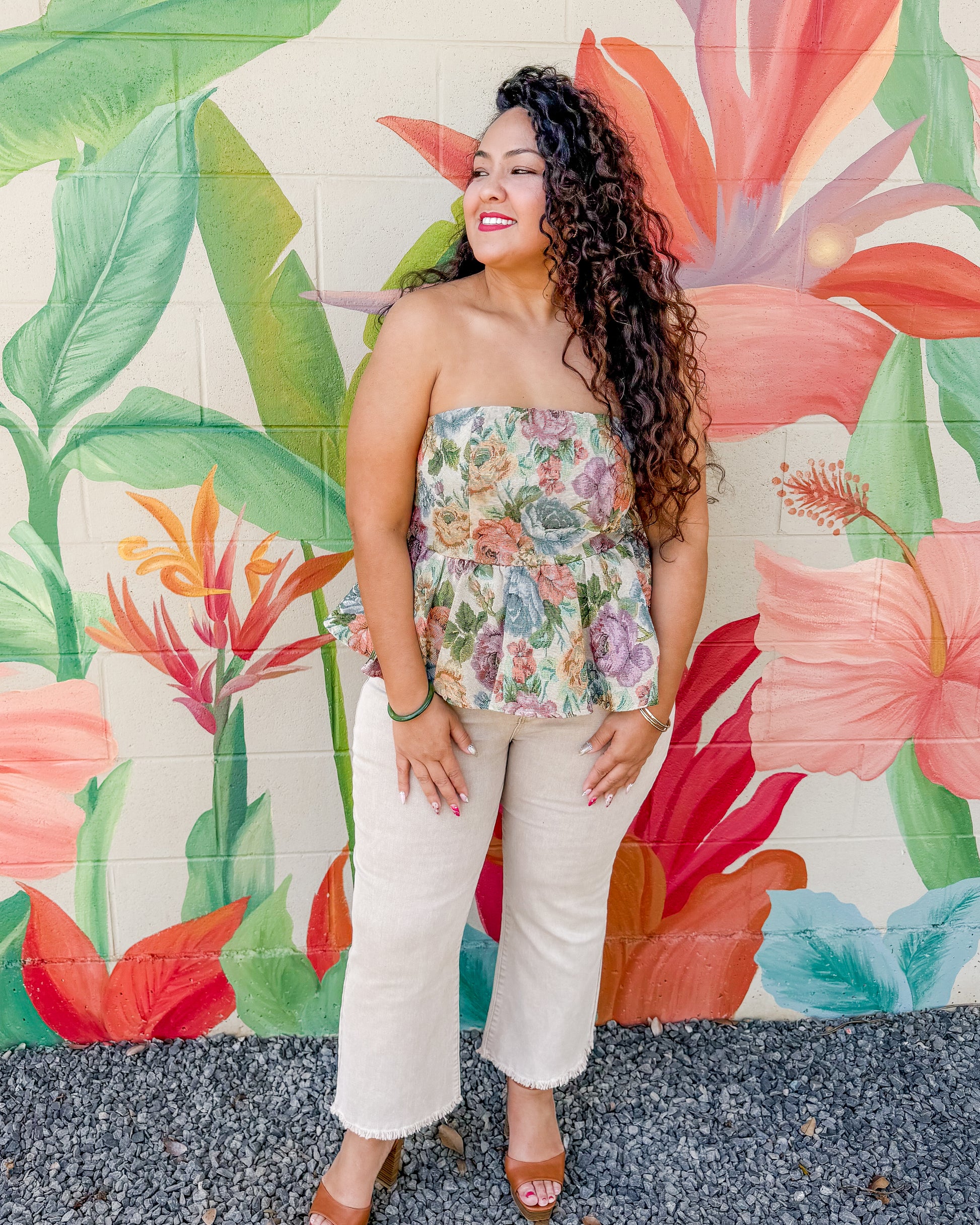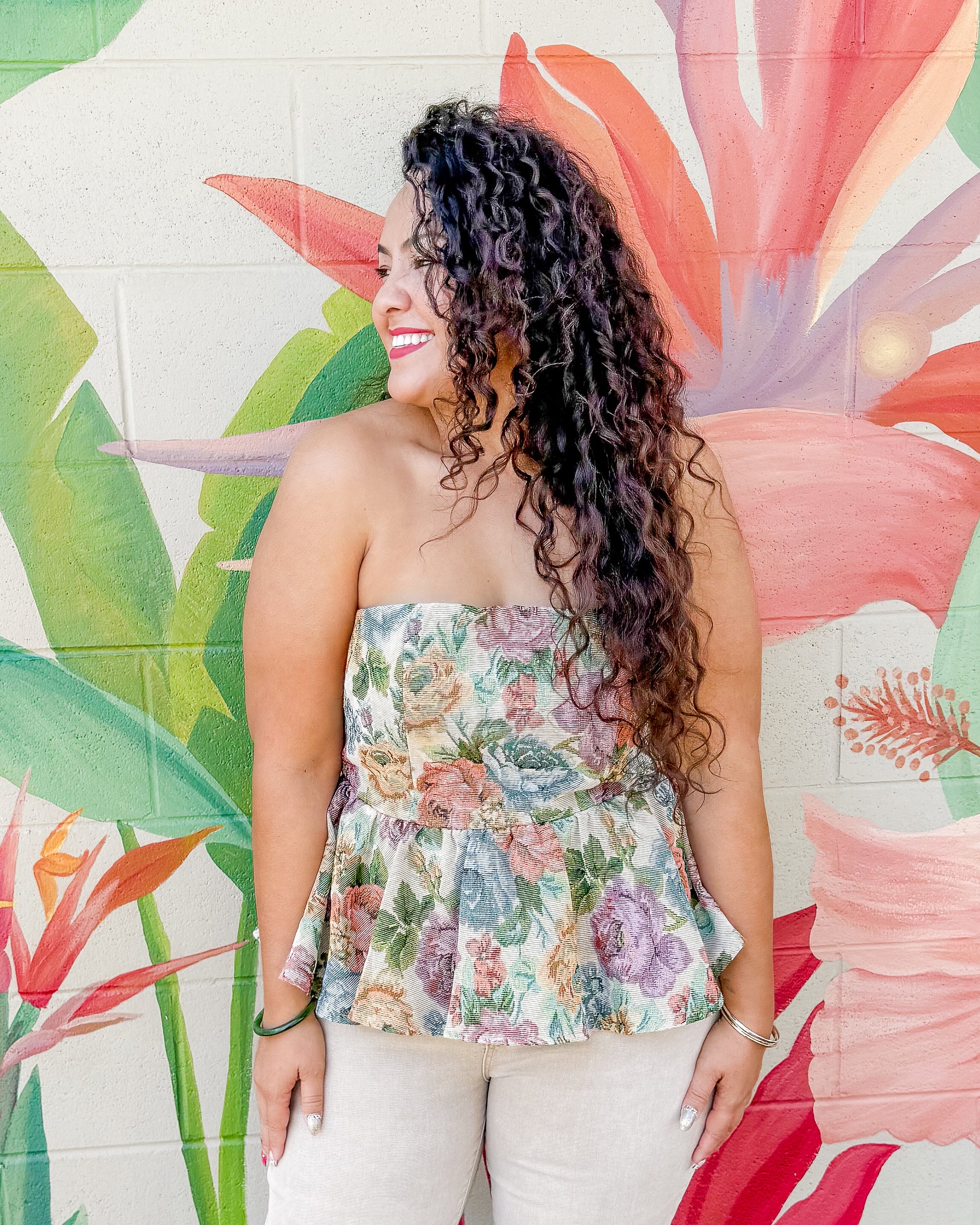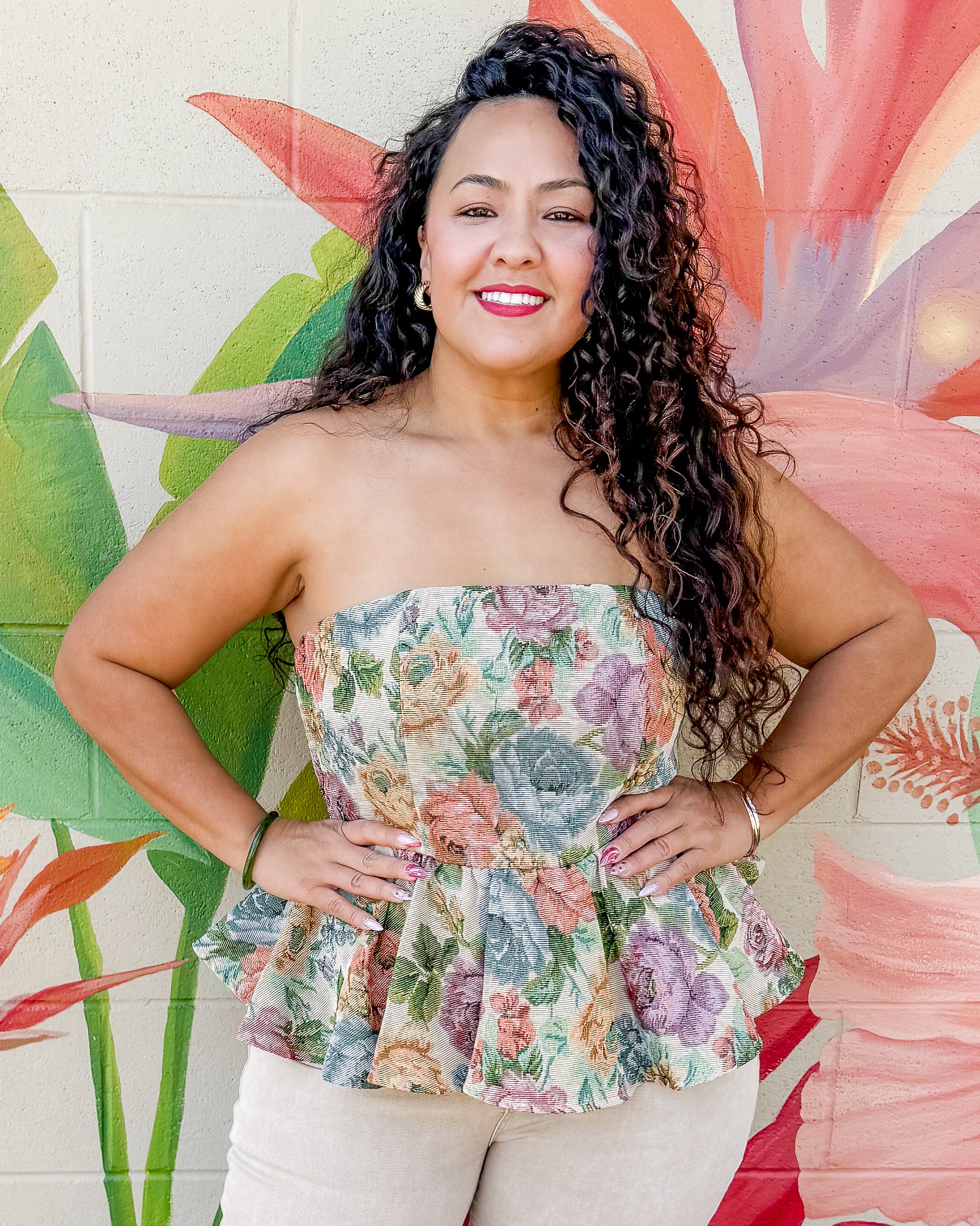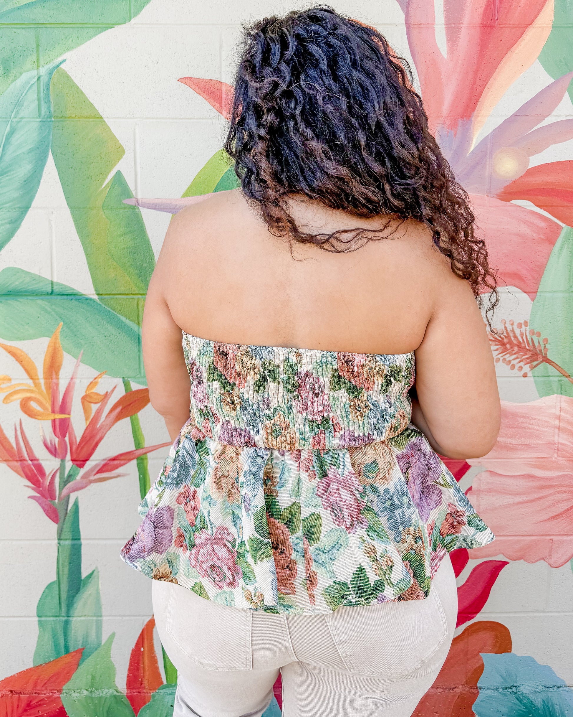 Effortless vintage charm meets modern comfort in this floral tube top. Delicate ruffles frame the hem while a peplum silhouette adds playful dimension. The smocking band on the back provides flexible sizing for the perfect fit. A timeless piece that works for any occasion.