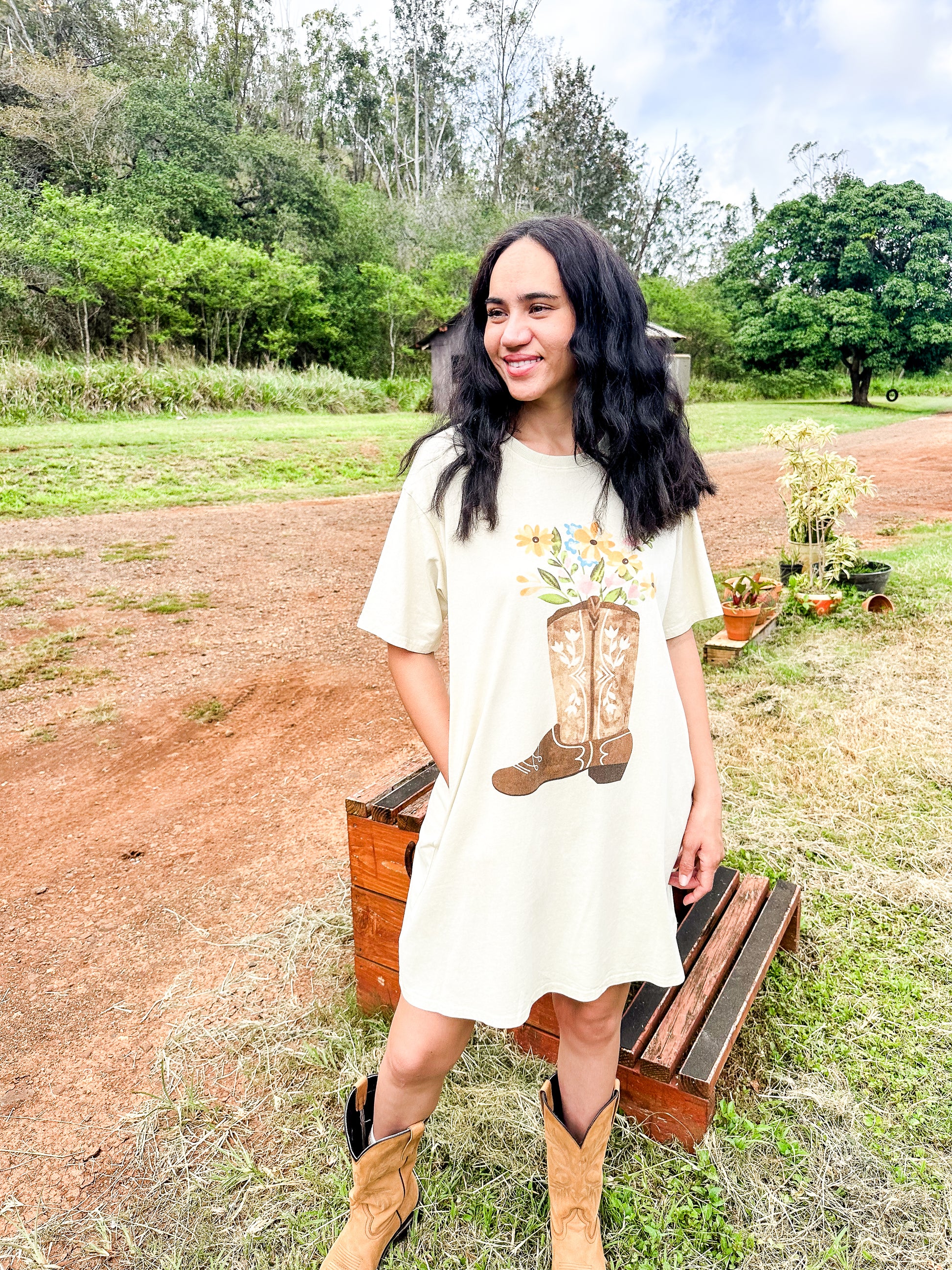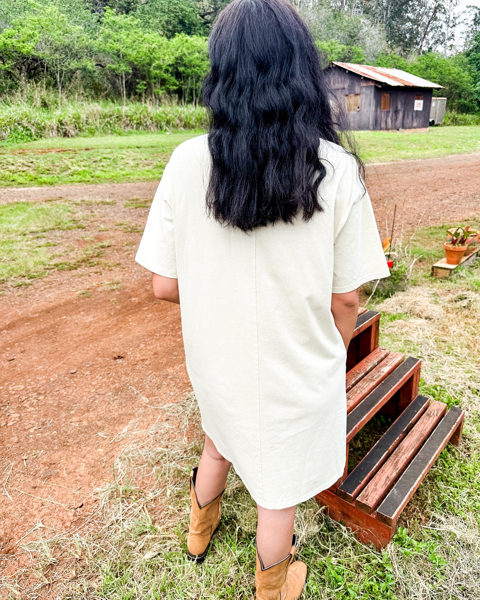 The Telluride Dress is a relaxed and loose fitting mineral washed T shirt dress. With short sleeves and a dropped shoulder design, this dress offers a comfortable and effortless look. Its faded cowboy boots graphic print adds a touch of vintage charm, while the side pockets and crew neckline provide convenience and style. Perfect for a casual and laid-back aesthetic.