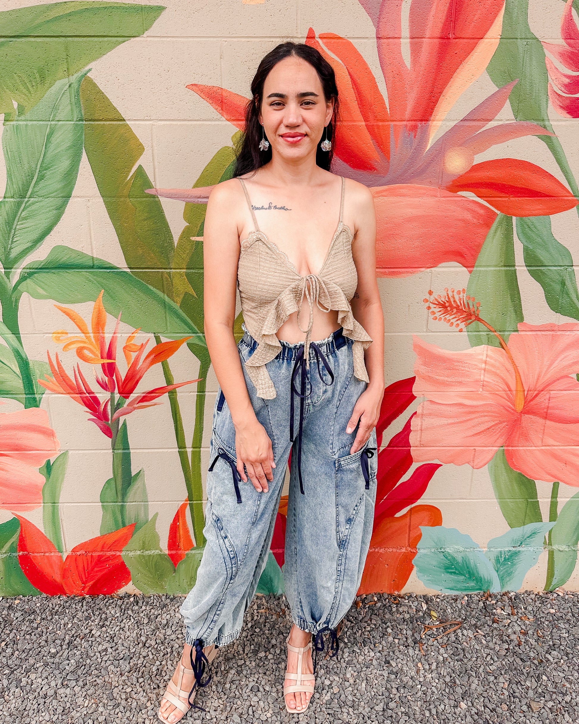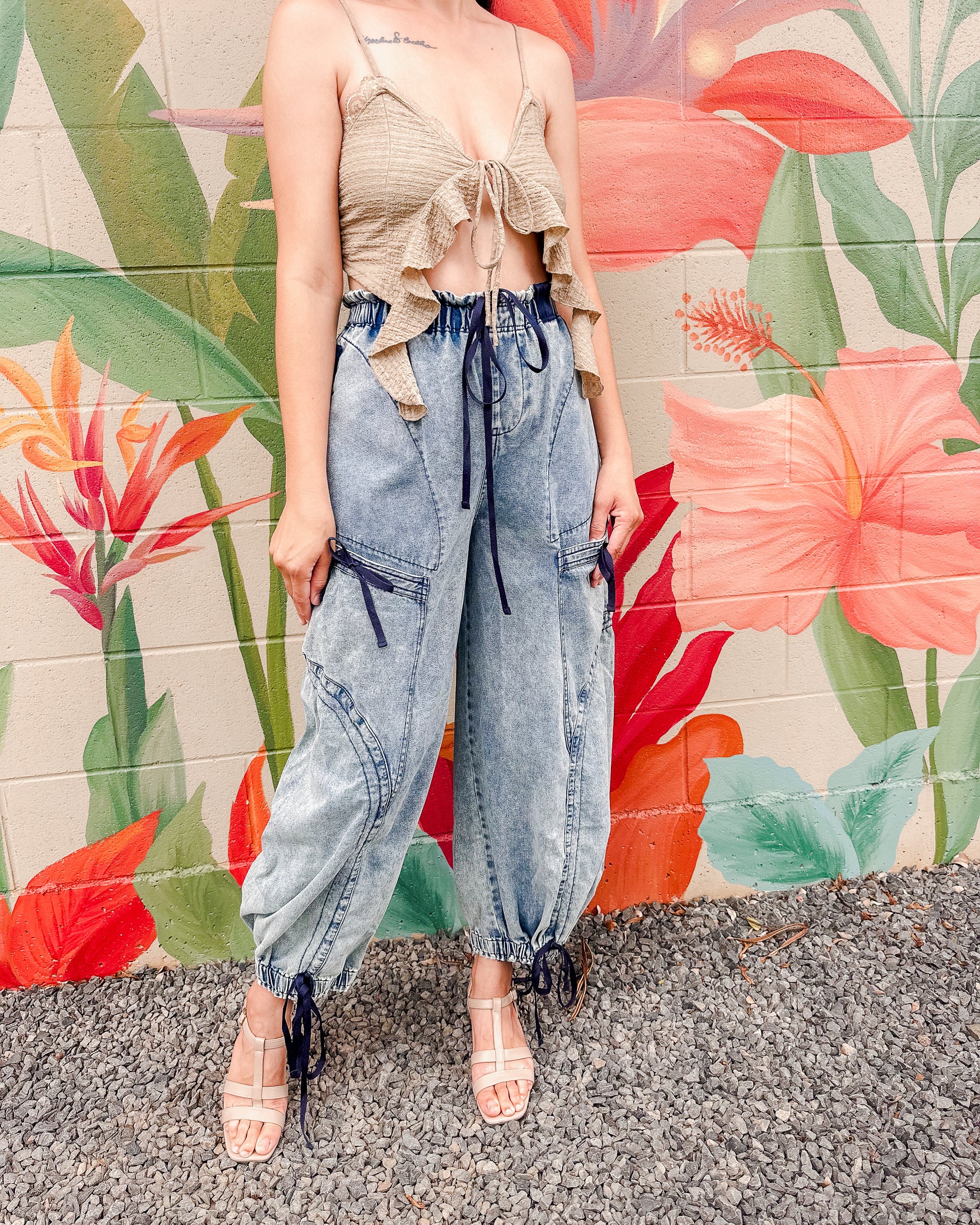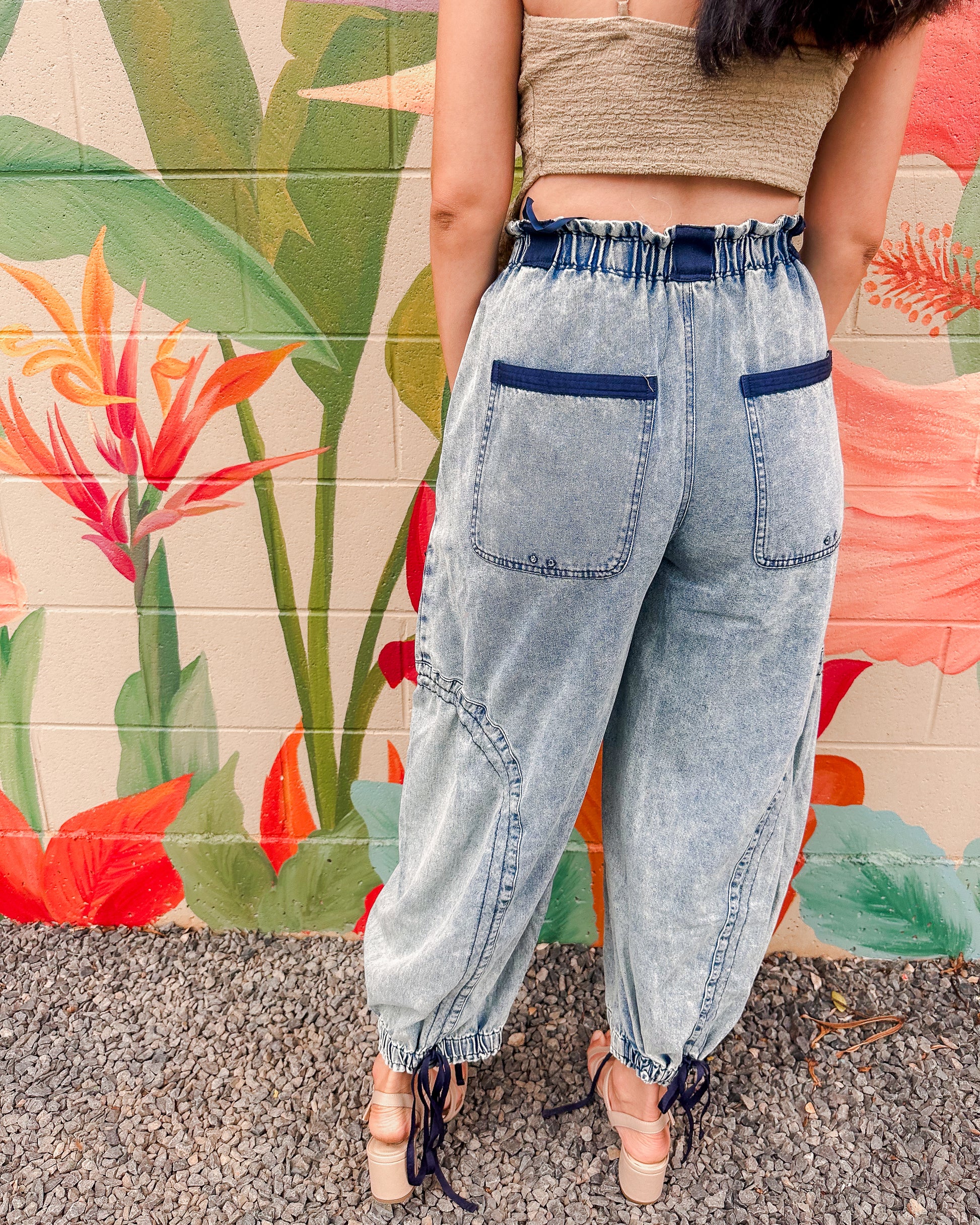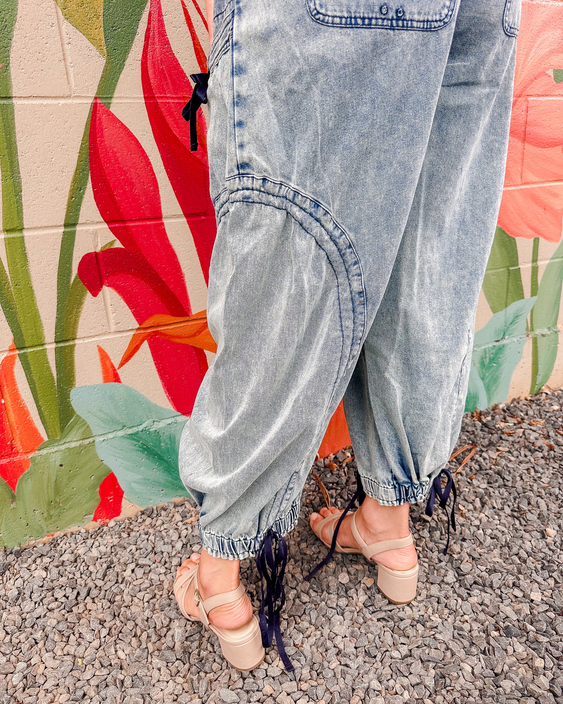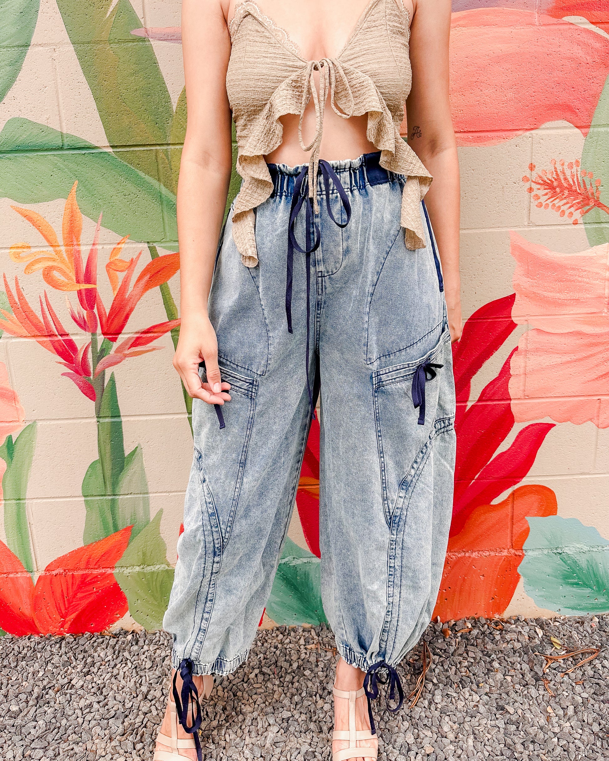 Experience casual comfort with the Tricia Pants, crafted from durable denim for lasting wear. These cargo-style pants feature practical drawstring details, allowing you to adjust the fit for everyday ease. Perfect for a relaxed look that combines functionality with laid-back style.