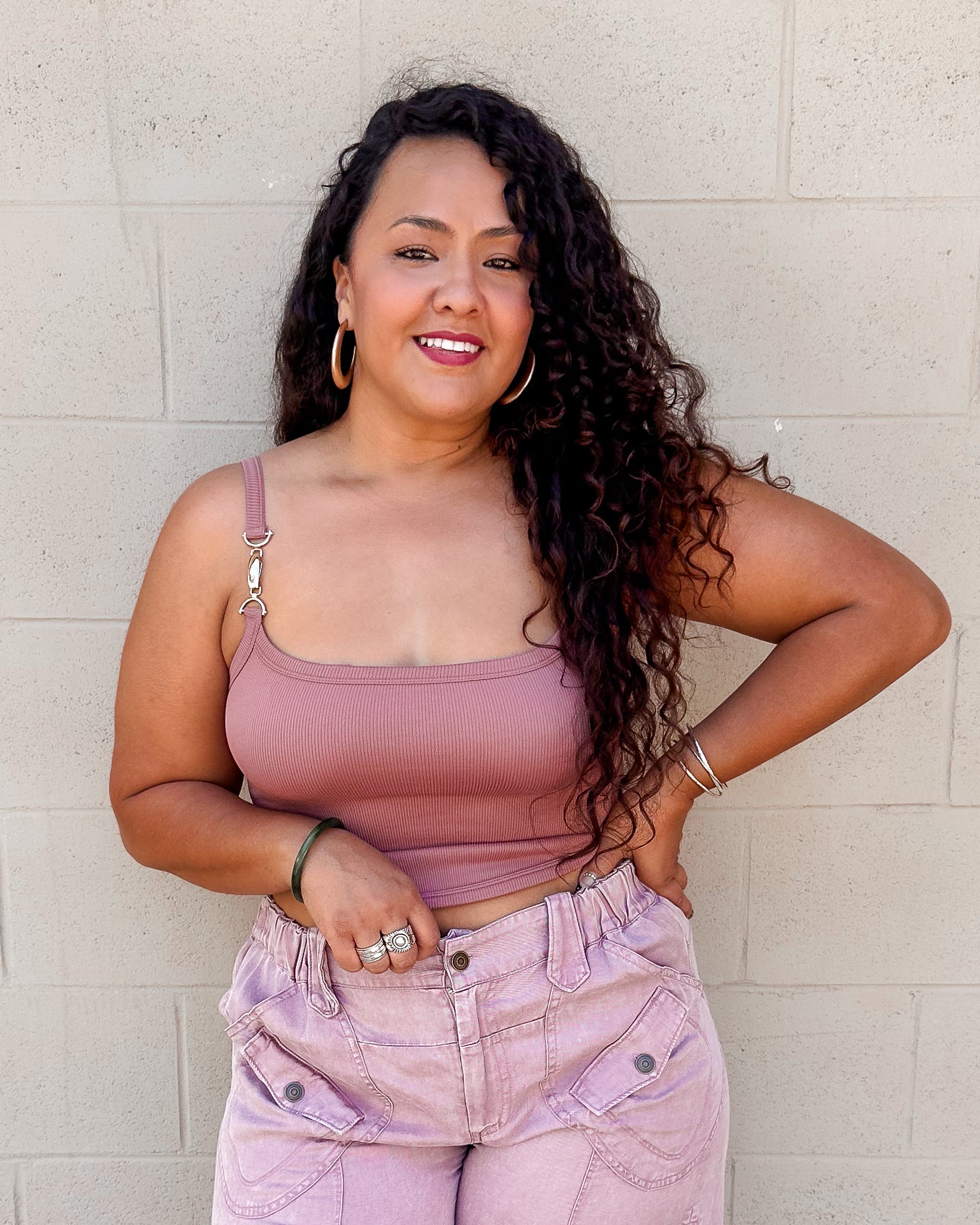 The Tyra Tank in Mauve features a stylish cropped design with a gold buckle detail that adds a subtle touch of elegance. Its soft fabric ensures comfortable wear, making it perfect for layering or wearing on its own during warmer days. This tank combines simplicity with a refined accent, offering a versatile piece for a calm and polished look.