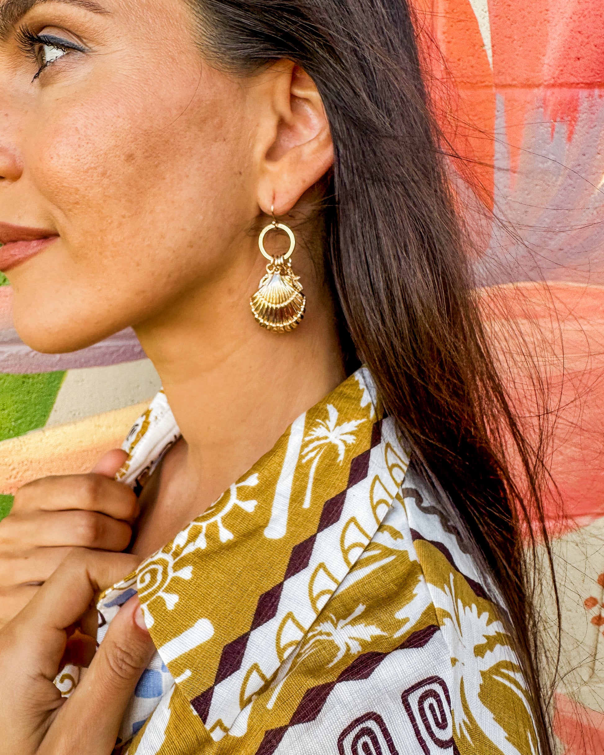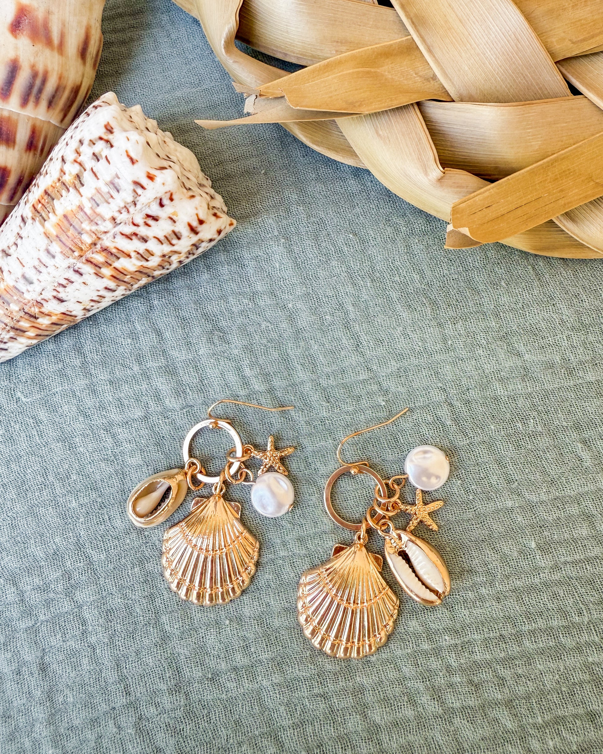 How fun are these gold plated dangle earrings filled with ocean charms? Definitely giving Little Mermaid vibes! Hook earrings, easy to wear.