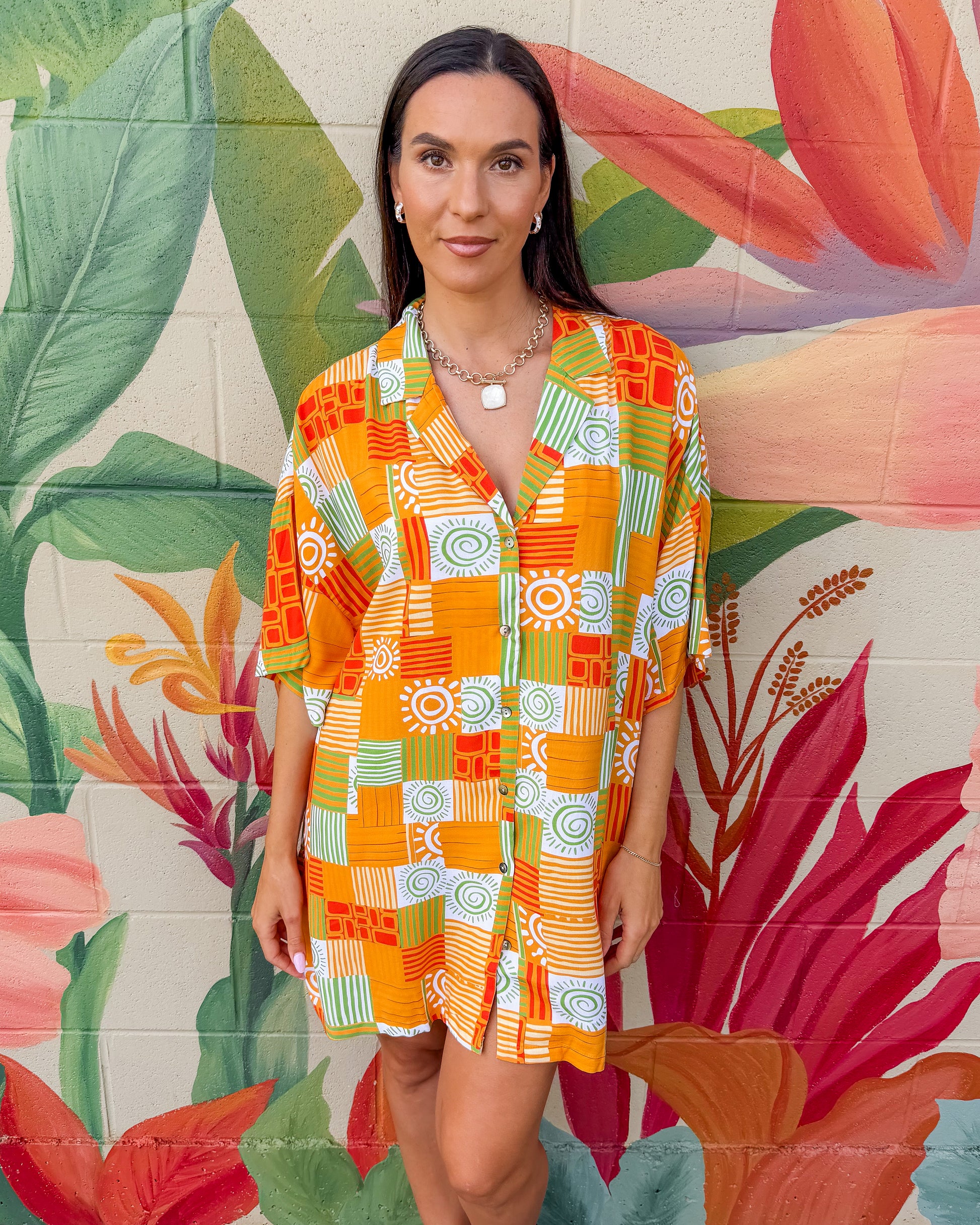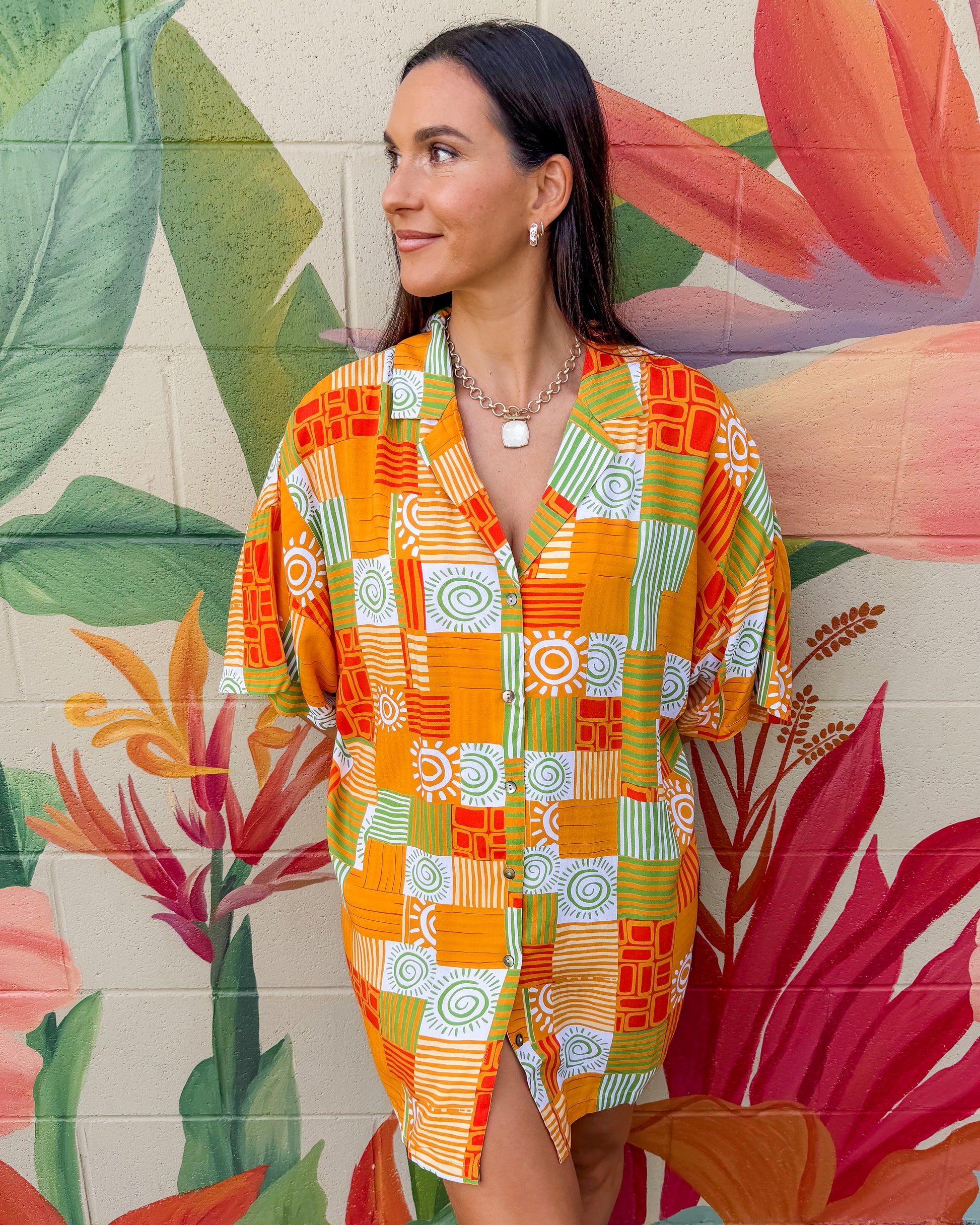 Brighten your wardrobe with this charming shirt dress featuring a vibrant orange and green patchwork design. The classic button-down style offers effortless versatility—wear it as a dress, layer it over basics, or tie it at the waist for a custom fit. Perfect for casual days and weekend adventures.