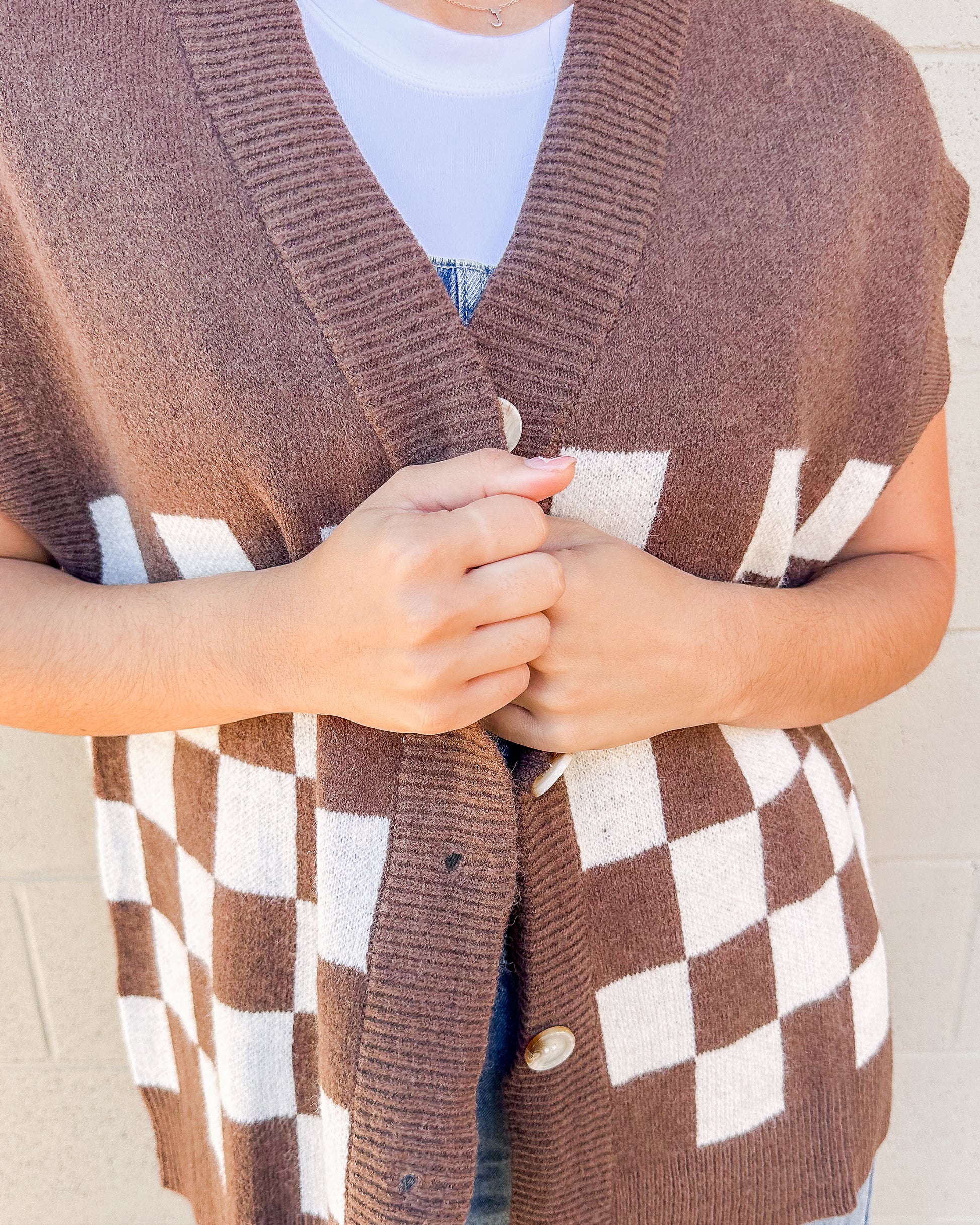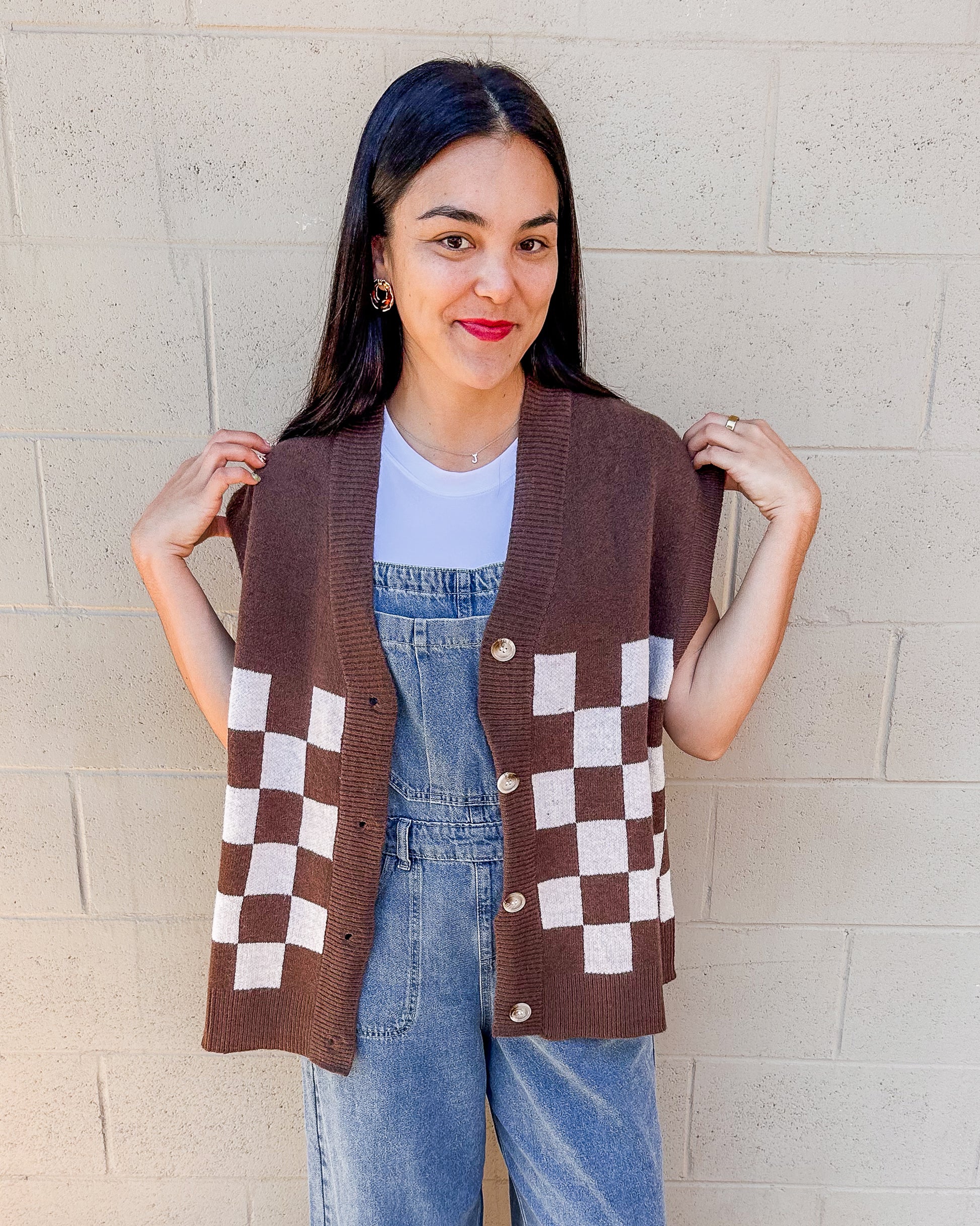 Layer up with the Victoria Cardi-Vest, a versatile checkerboard design that works as both cardigan and vest. The relaxed loose fit offers comfort and easy styling, perfect for throwing over any outfit. Classic pattern, modern silhouette—a wardrobe essential that transitions seamlessly from season to season.