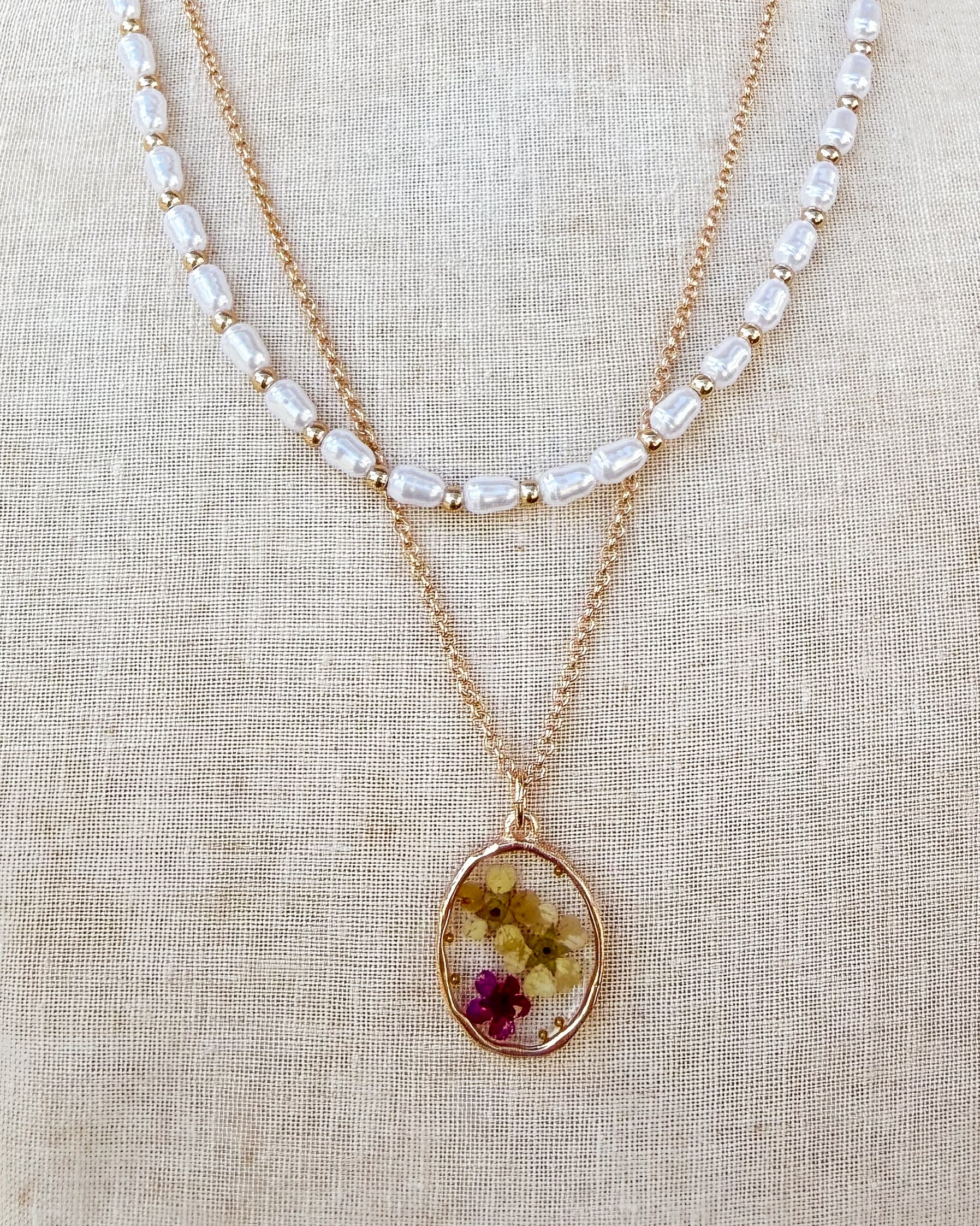 Pressed flowers never go out of style and now you can rock them in this fun, layered necklace. Gold plated, adjustable chain. Two colors available!