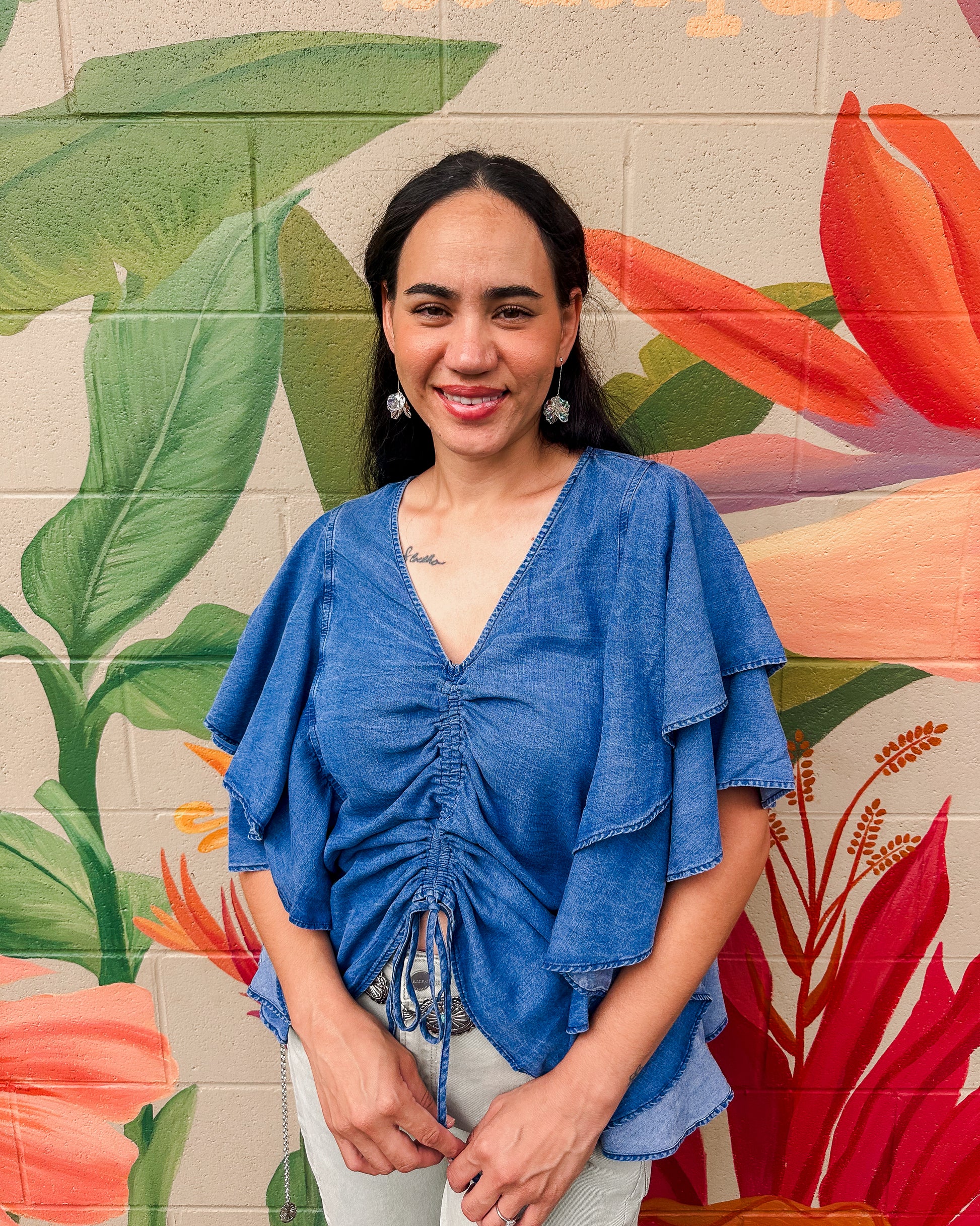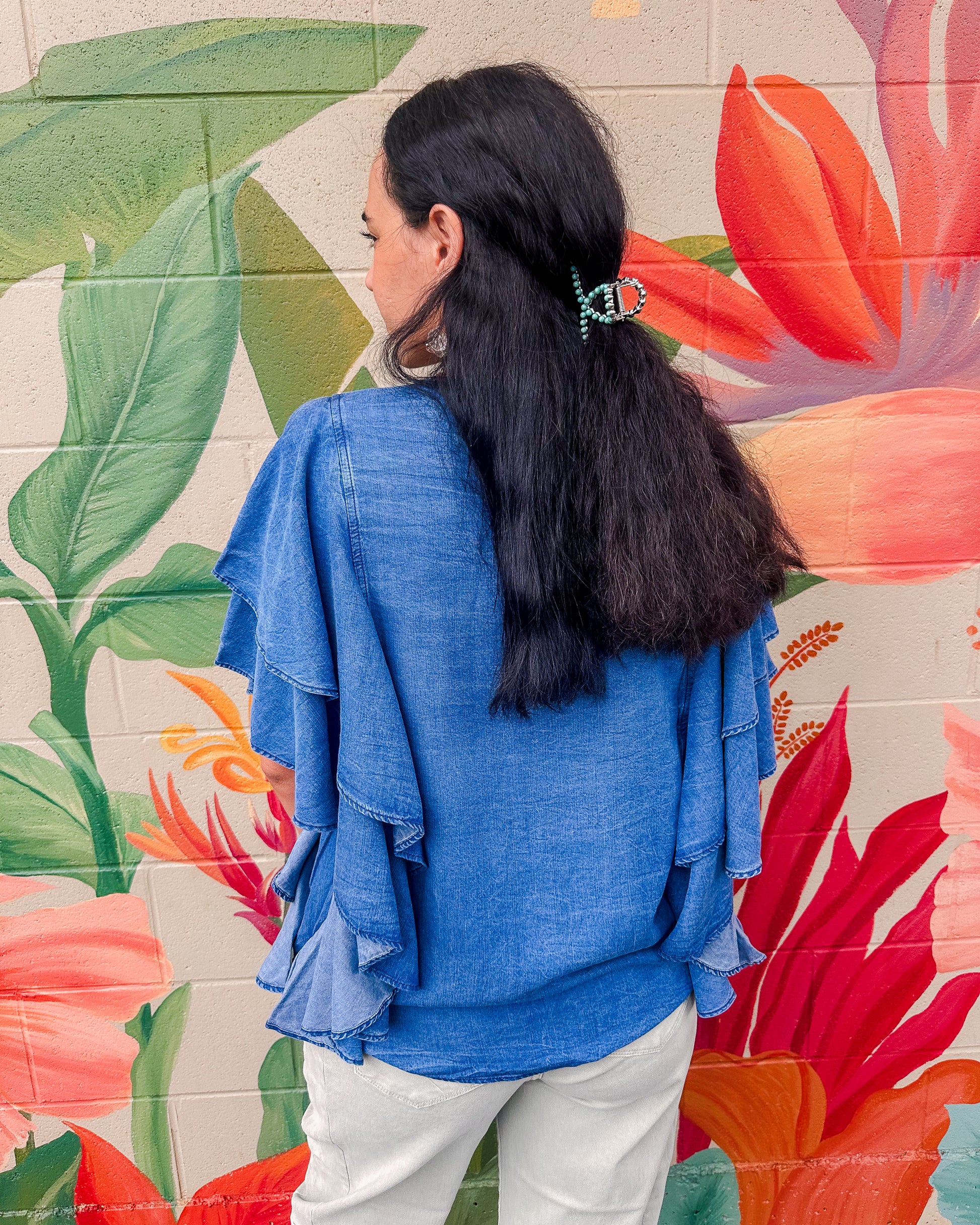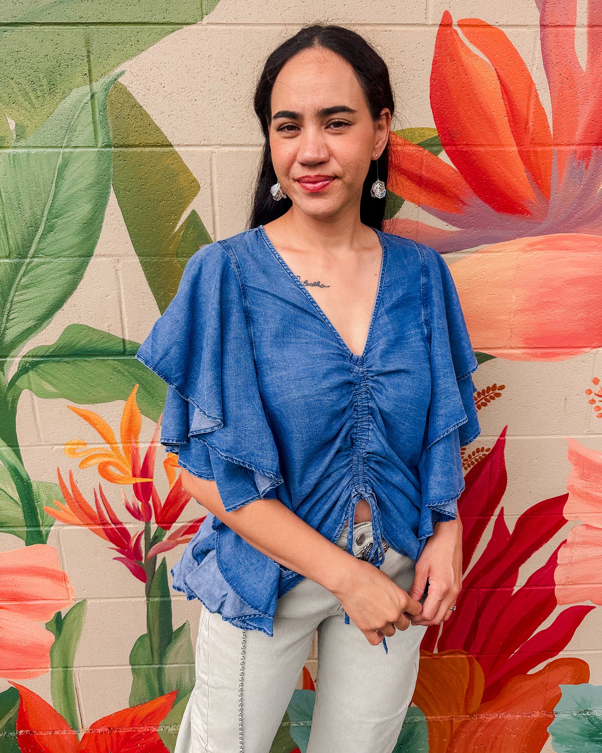 The Wexley Top features elegant ruffle sleeves and adjustable ruching at the center, allowing you to customize the fit for comfort and style. Crafted from denim, it offers a relaxed yet refined look perfect for casual outings or layering. Its soft texture and thoughtful design provide both ease of wear and subtle flair.