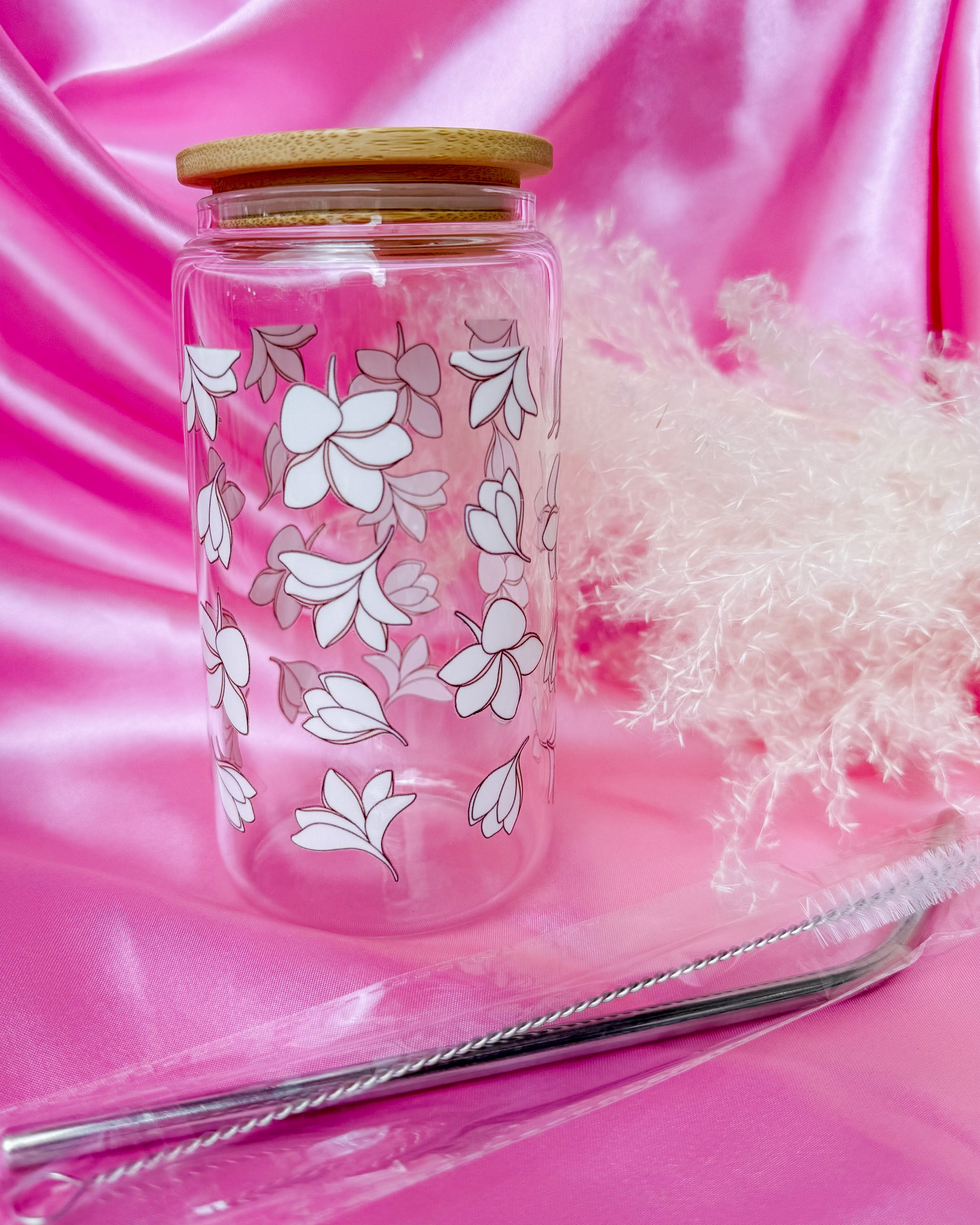 16oz reusable glass cup decorated with beautiful white floating plumeria flowers. Perfect for Valentine's Day! Bamboo lid, metal straw & brush for cleaning included. Can be used for or cold drinks.