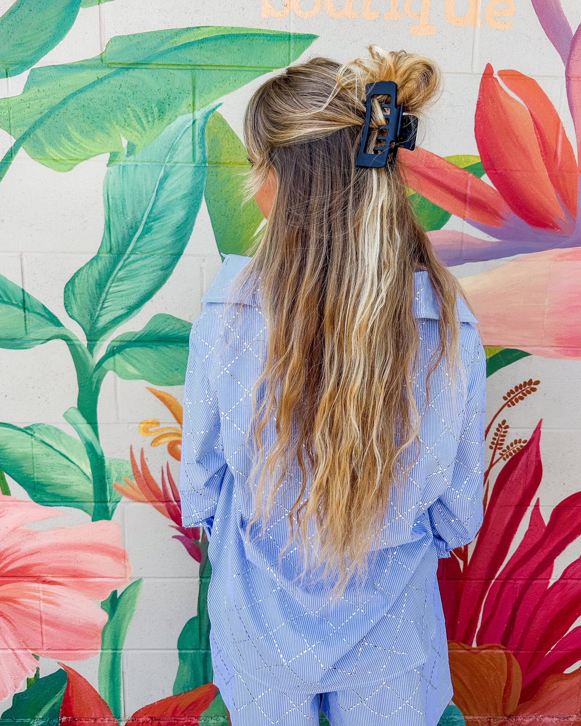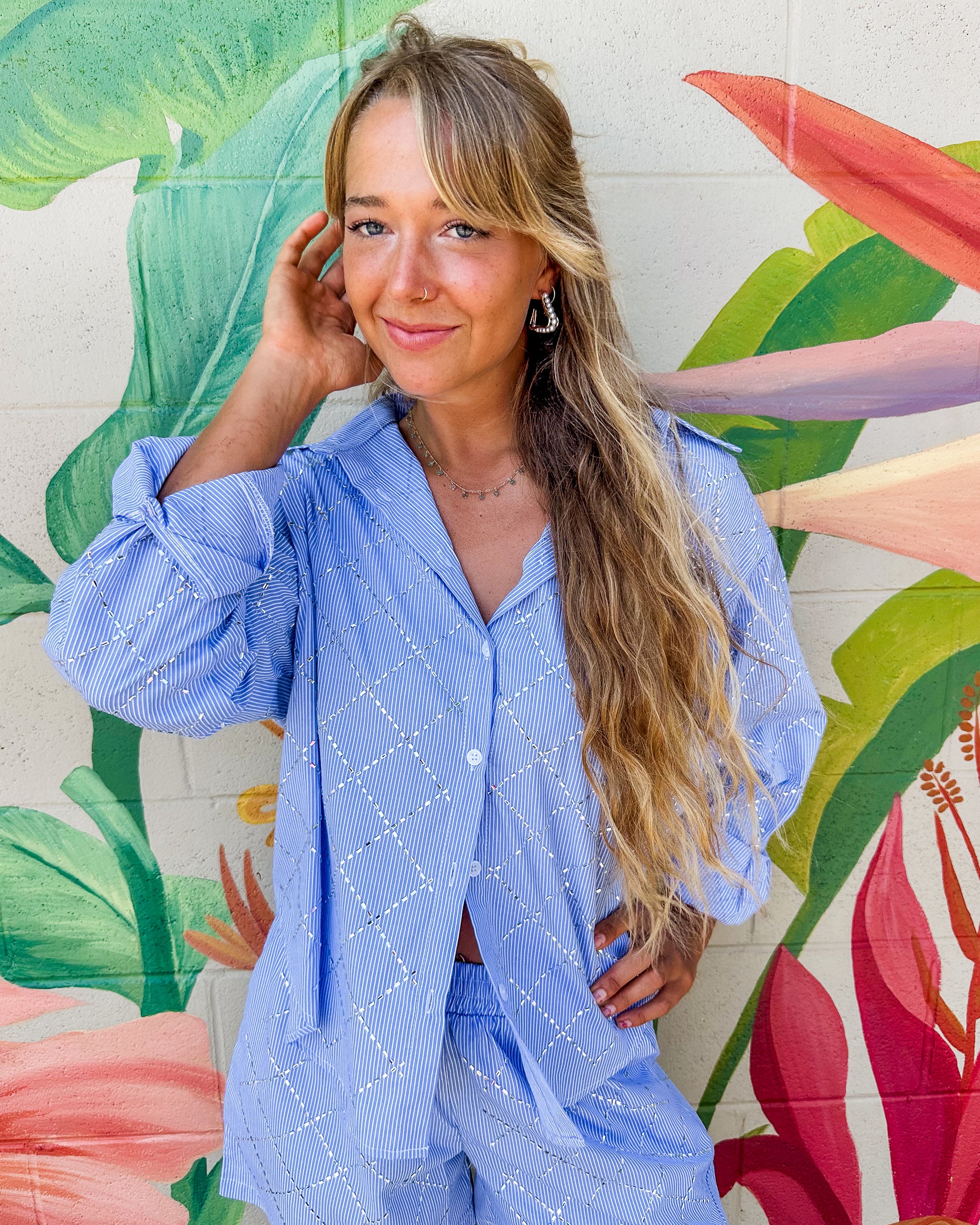 The Zelda Top features a classic striped pattern with a button-down front and long sleeves, offering a timeless look. Its structured collar adds a polished touch, while delicate jewels scattered throughout provide subtle sparkle. This top combines elegance and comfort, making it perfect for both casual and refined occasions.
